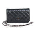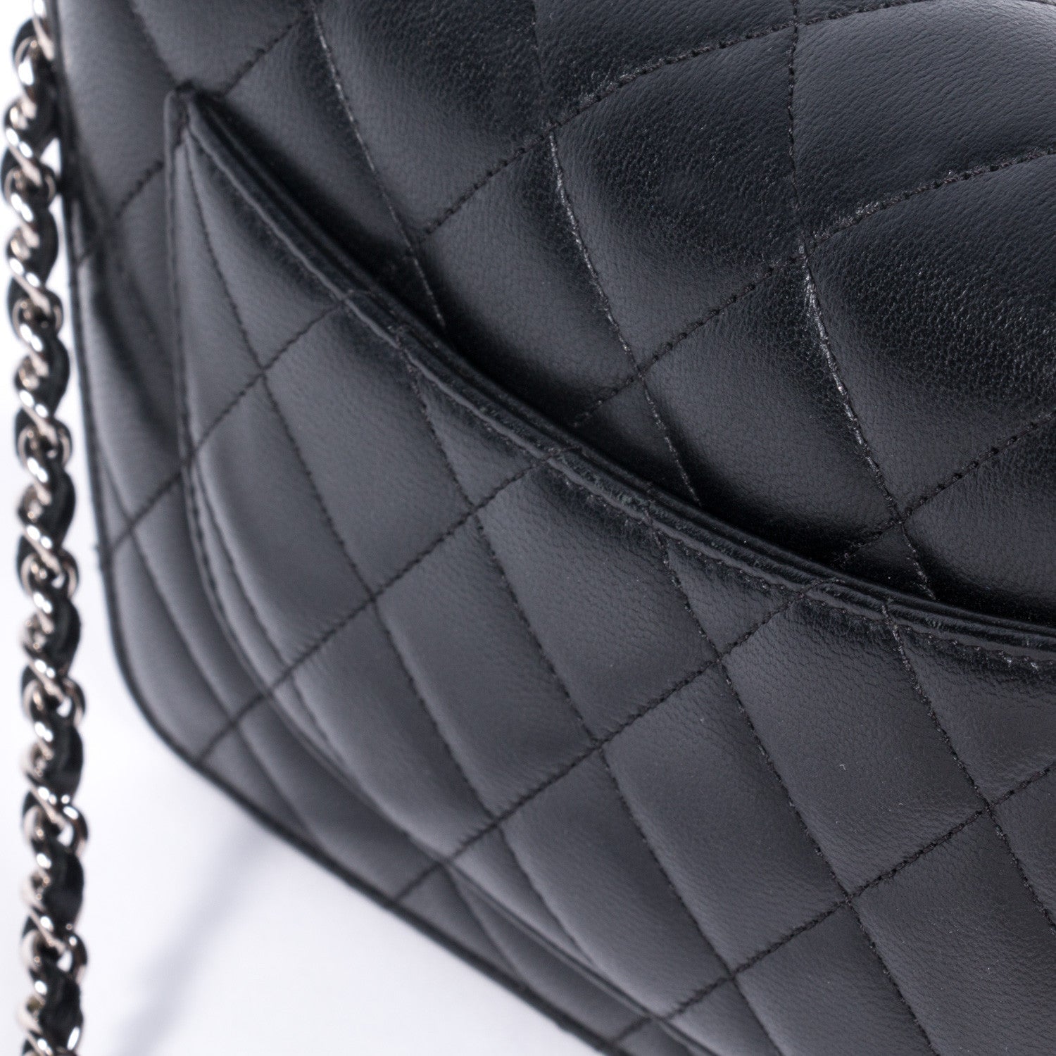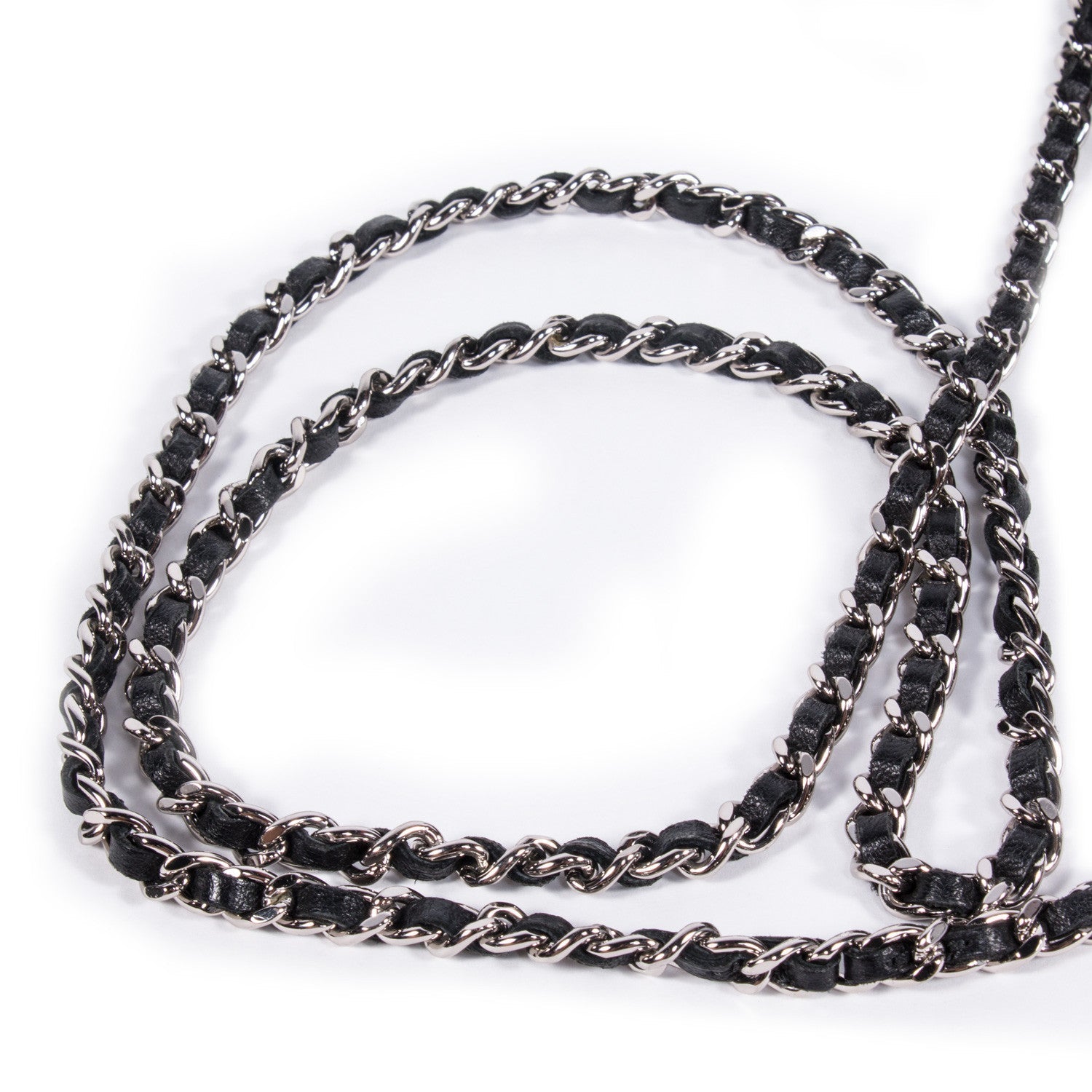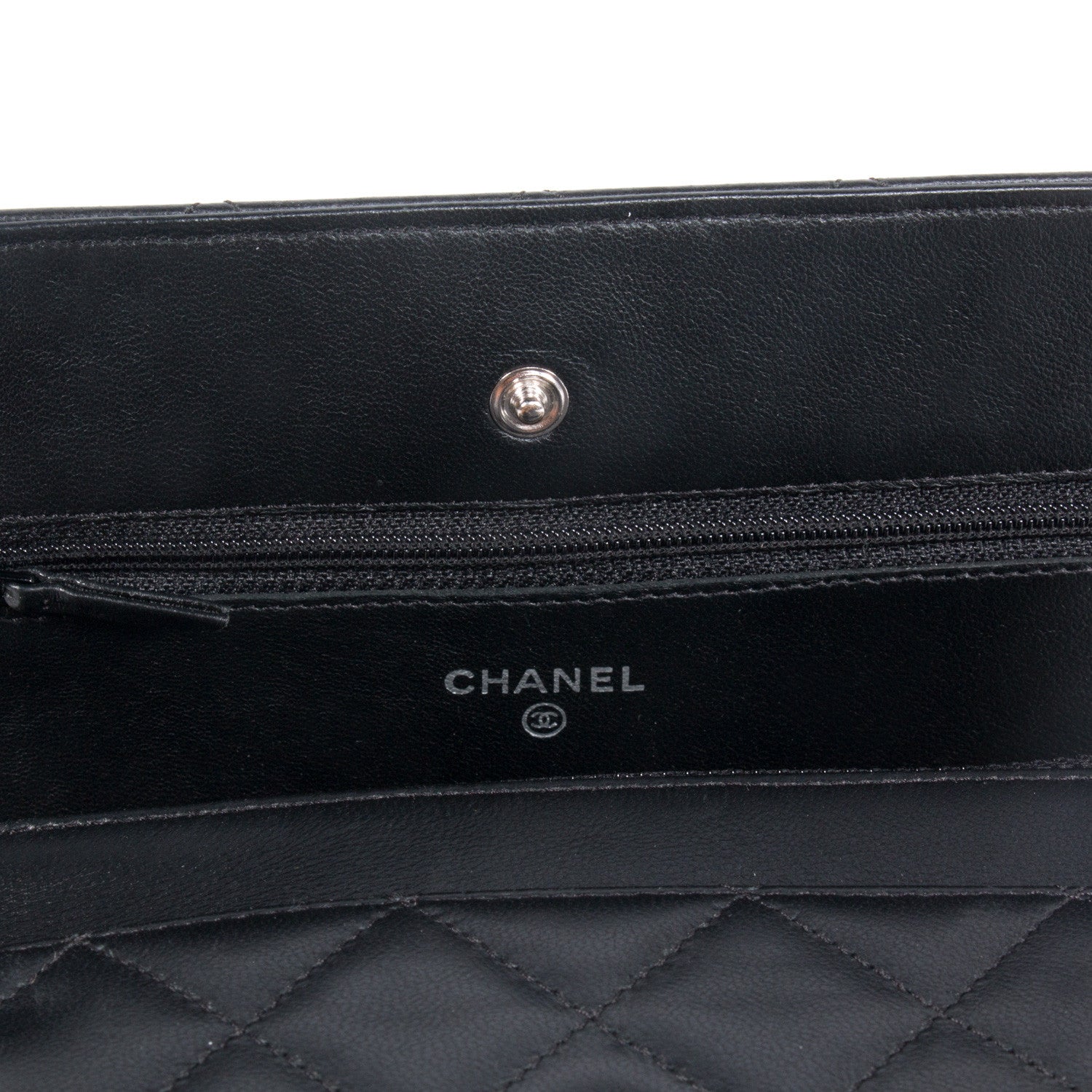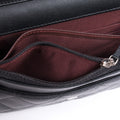 Details: Black Quilted Lambskin Leather / Silver Tone Hardware / Chain Link And Leather Shoulder Strap / Exterior Pocket At Back / Burgundy Grosgrain And Leather Interior / Six Slot At Interior / Three Interior Pockets / Two Zip Pockets / Snap Closure At Front