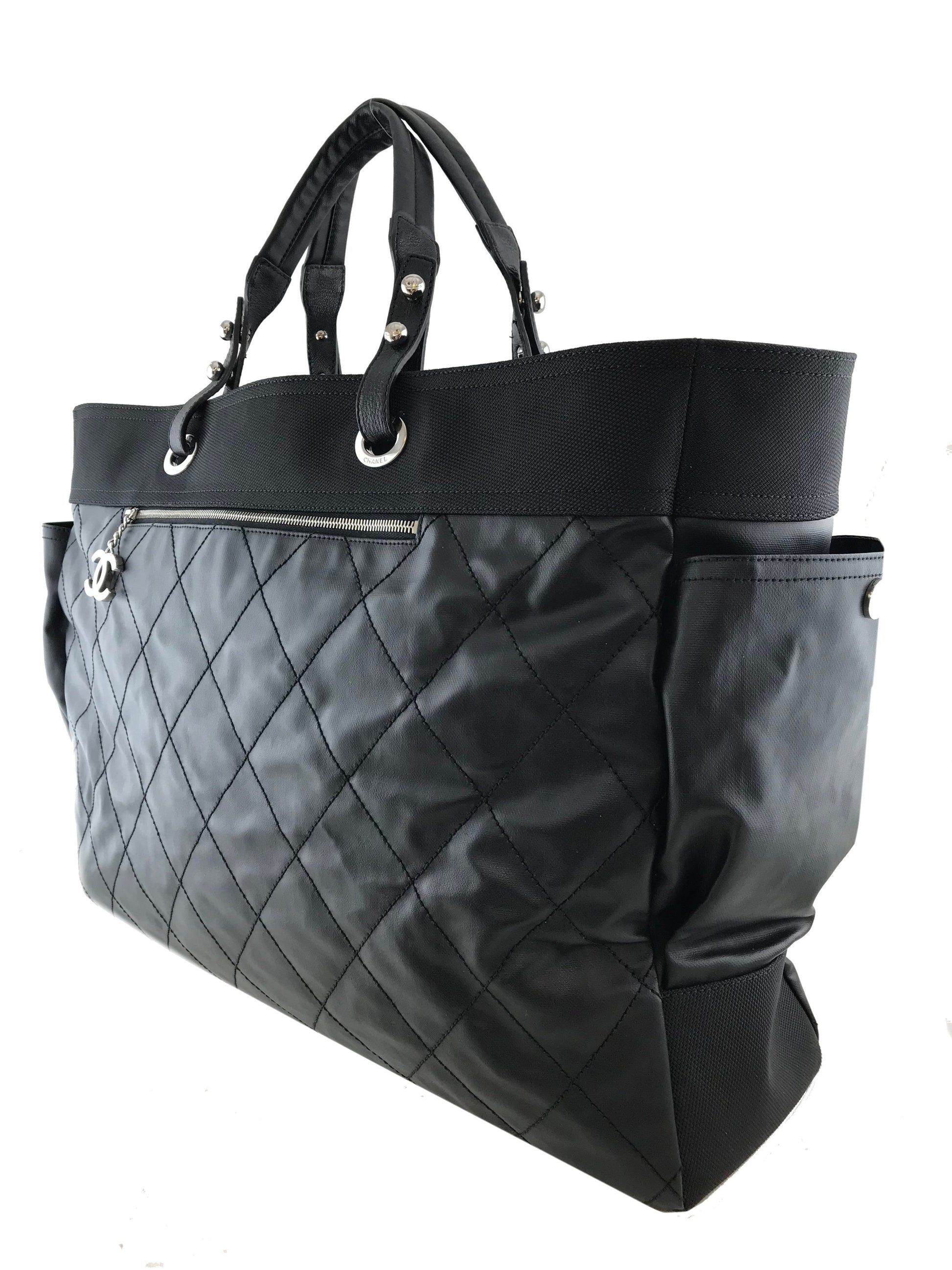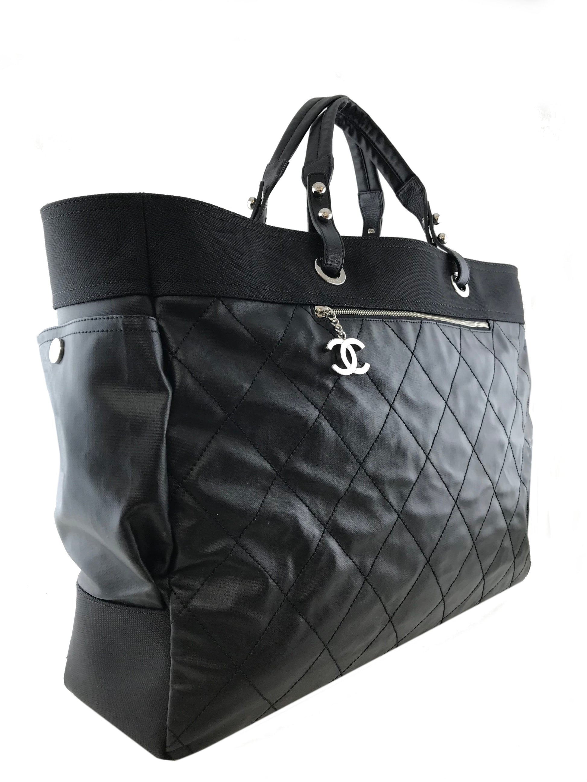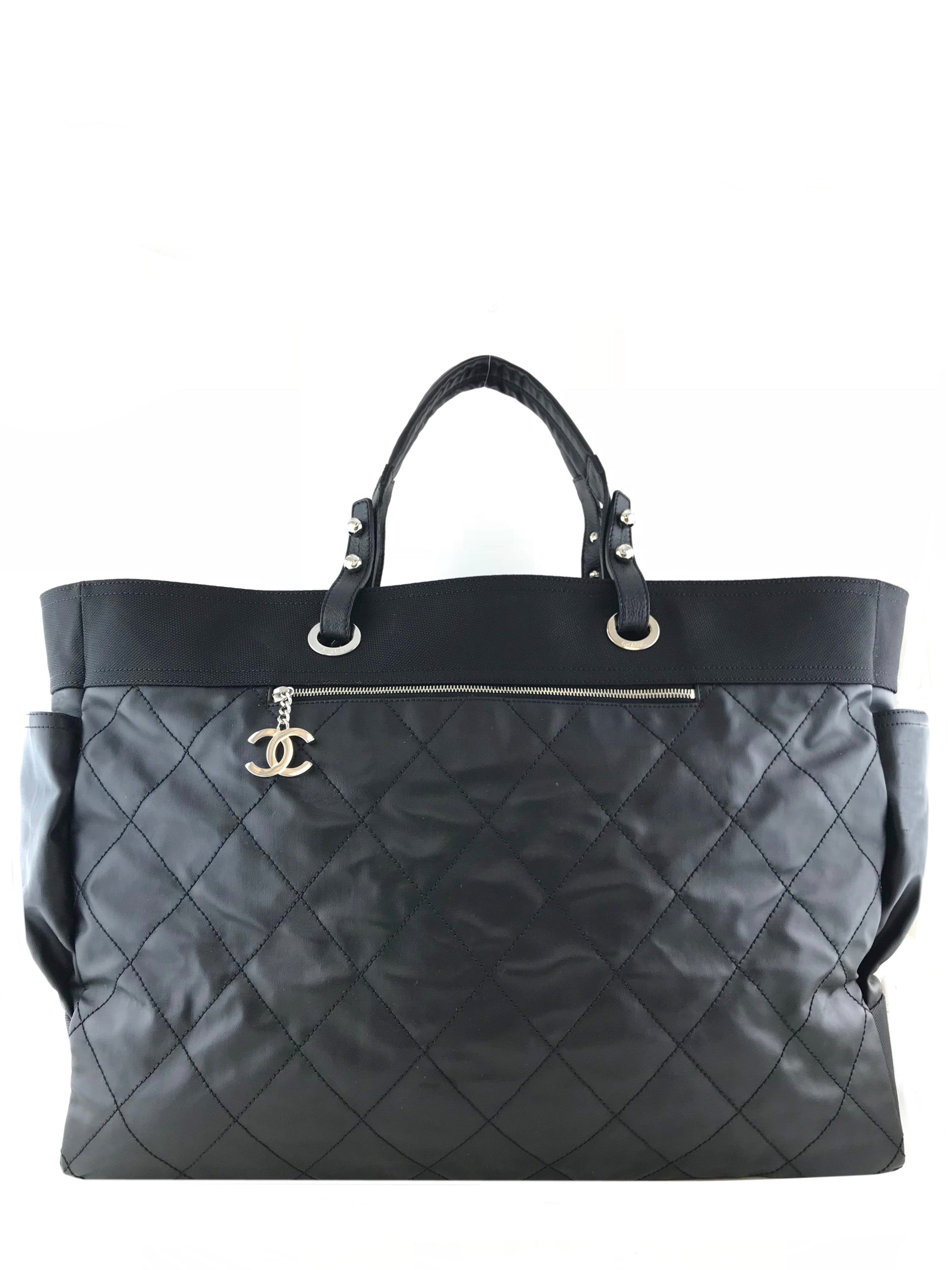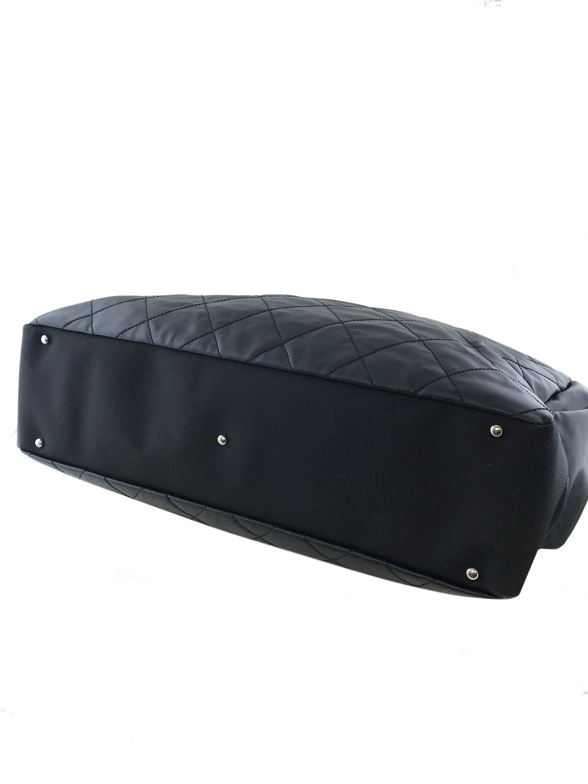 Travel in style with this Chanel Quilted Coated Canvas Paris Biarritz Weekender Travel Bag beautifully crafted from black diamond quilted waterproof coated canvas with a black heavy-duty knit canvas trim and silver-tone hardware. It features a single flat shoulder strap, a frontal compartment with a signature 'CC' zip closure and two large side snap pockets. This ultra-spacious, light-weight travel companion will hold all your essentials with ease! Shop designer handbags by Chanel at Bags Alora.
