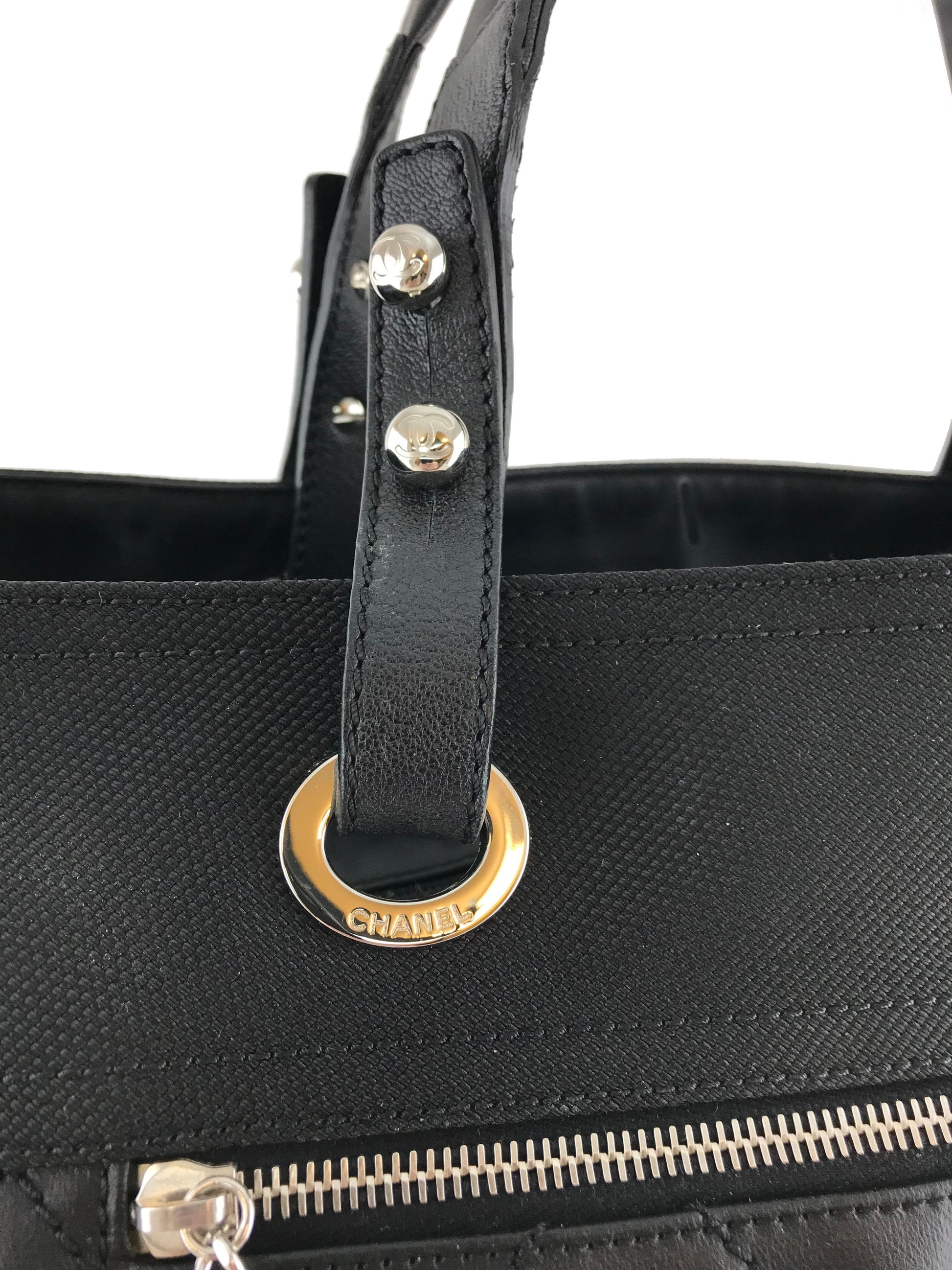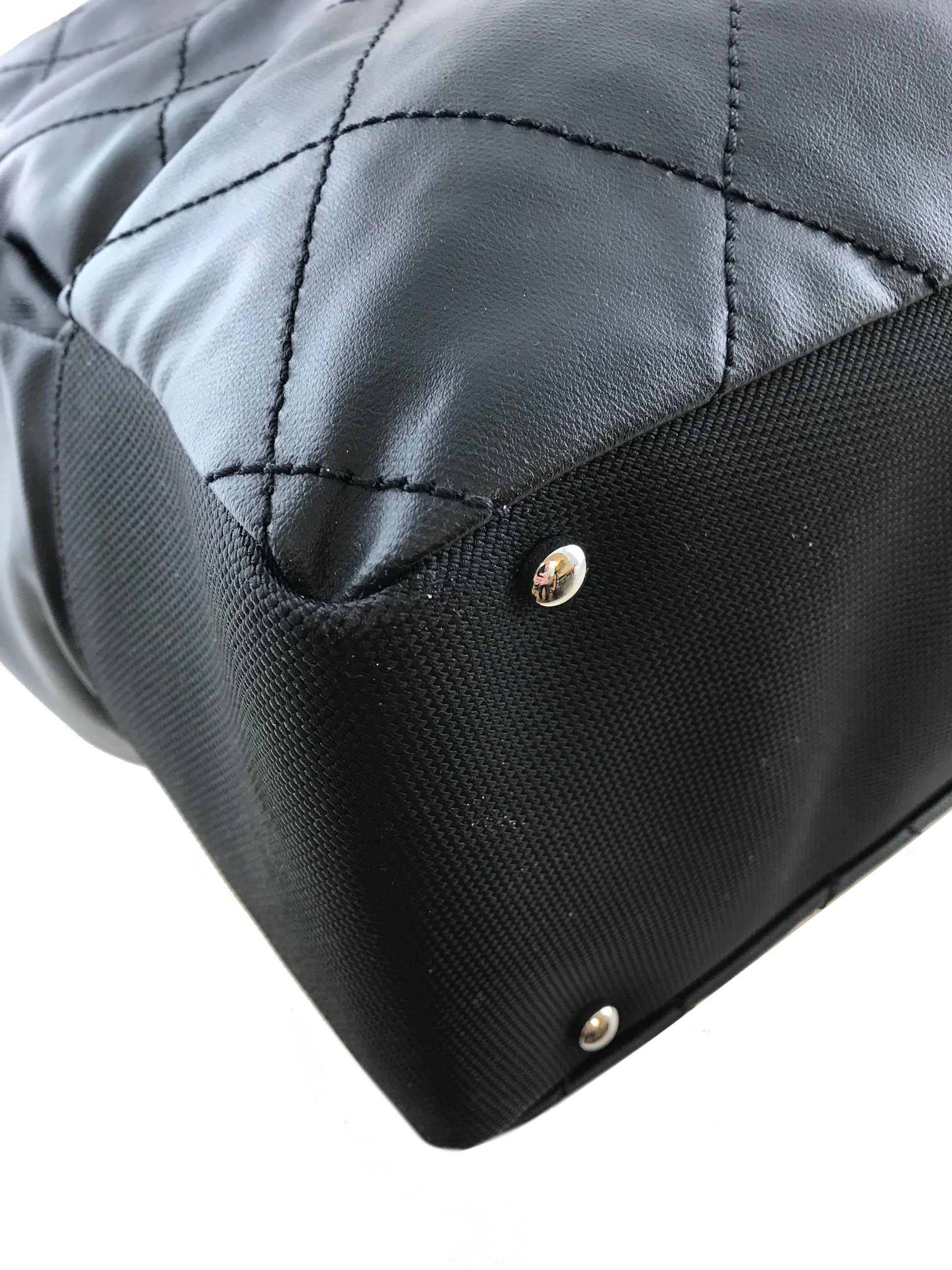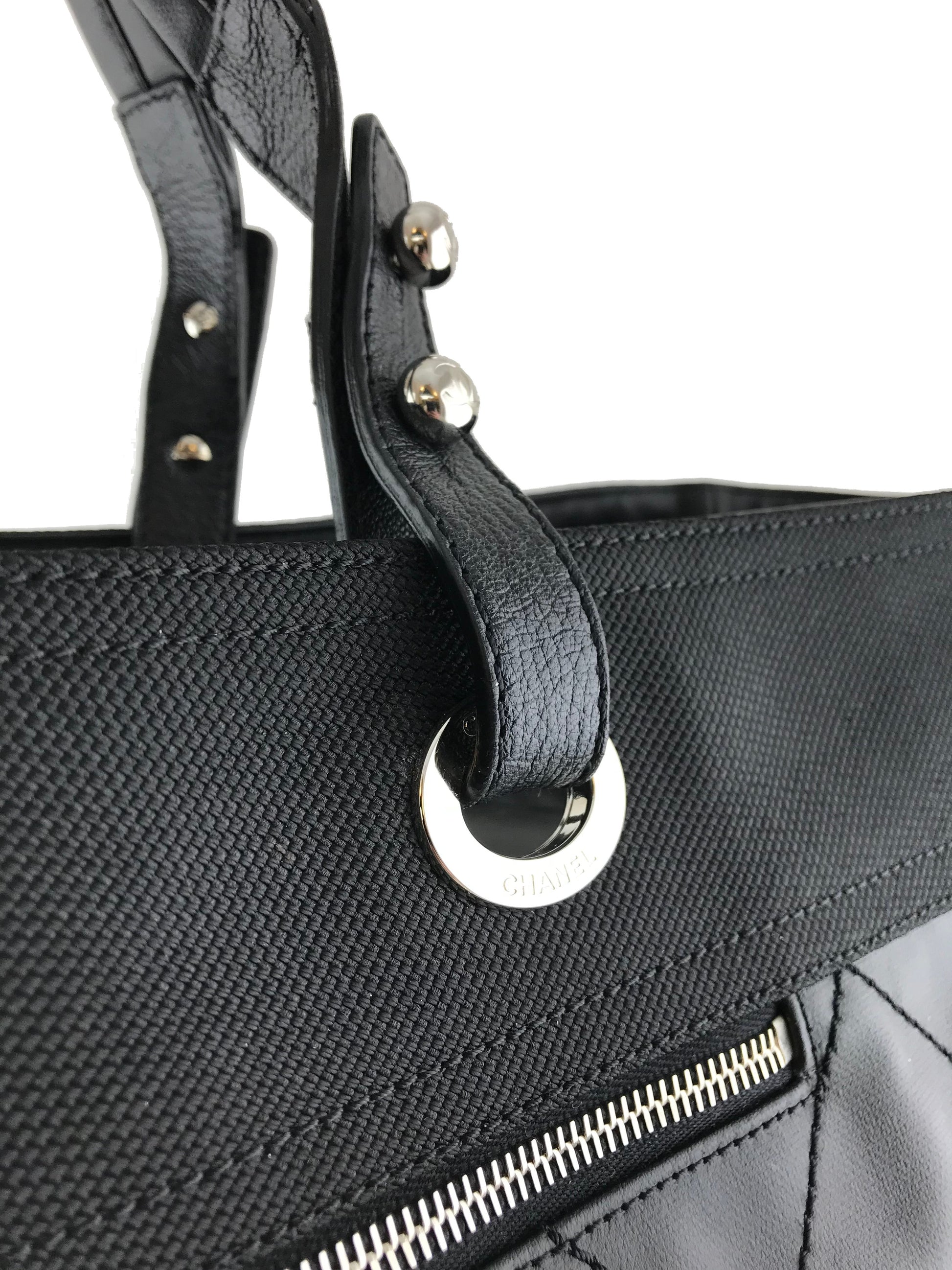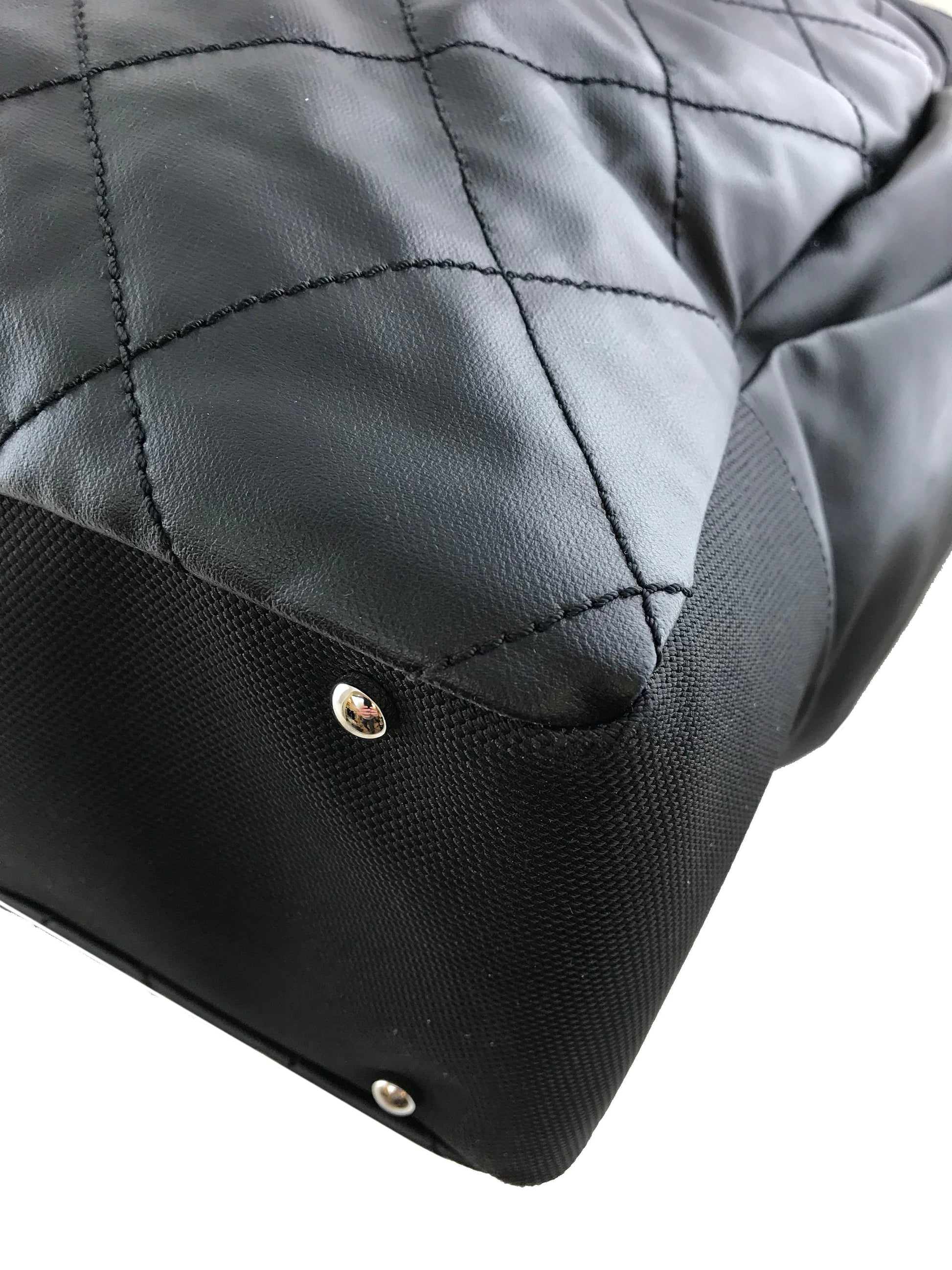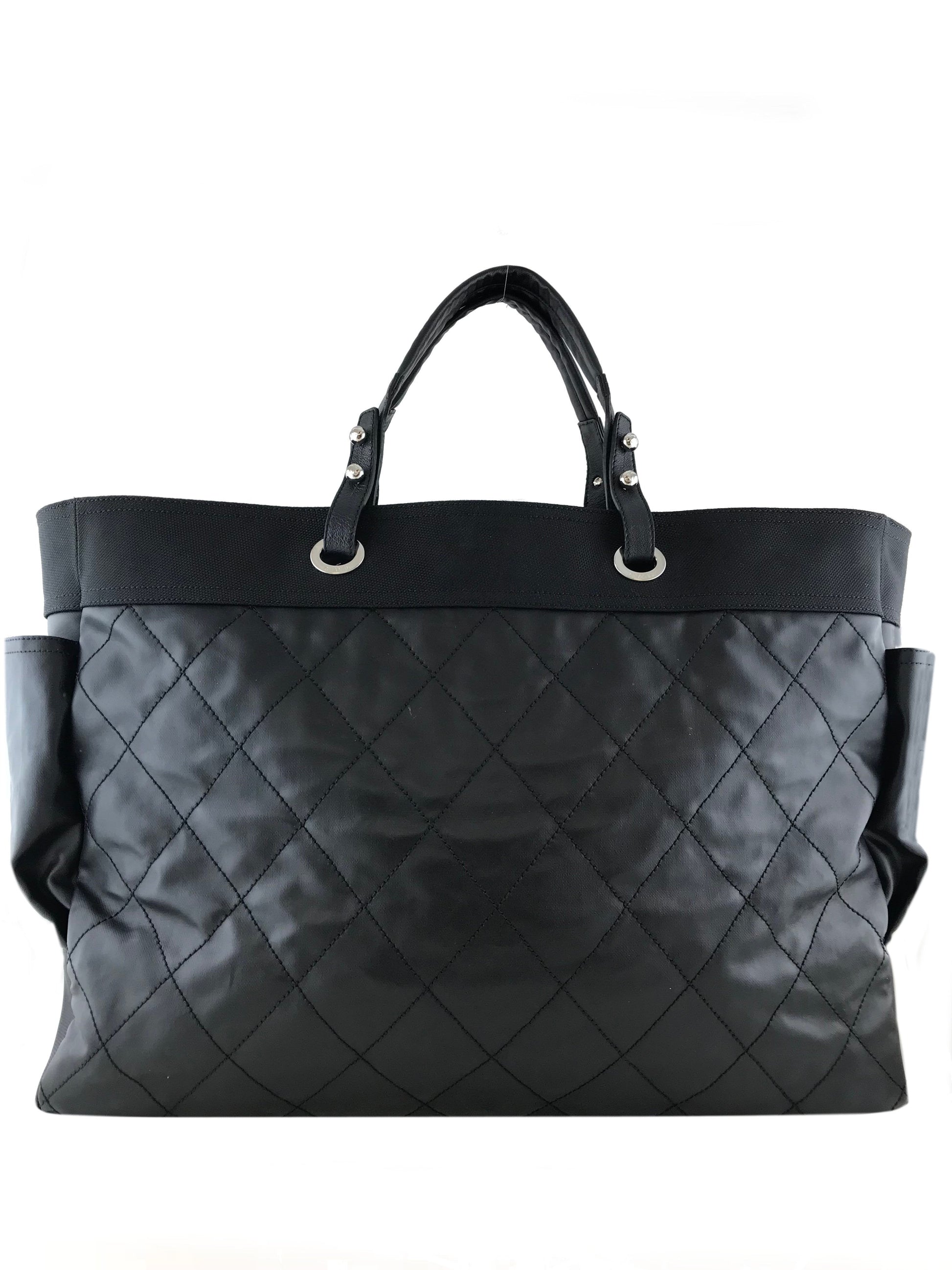 Travel in style with this Chanel Quilted Coated Canvas Paris Biarritz Weekender Travel Bag beautifully crafted from black diamond quilted waterproof coated canvas with a black heavy-duty knit canvas trim and silver-tone hardware. It features a single flat shoulder strap, a frontal compartment with a signature 'CC' zip closure and two large side snap pockets. This ultra-spacious, light-weight travel companion will hold all your essentials with ease! Shop designer handbags by Chanel at Bags Alora.