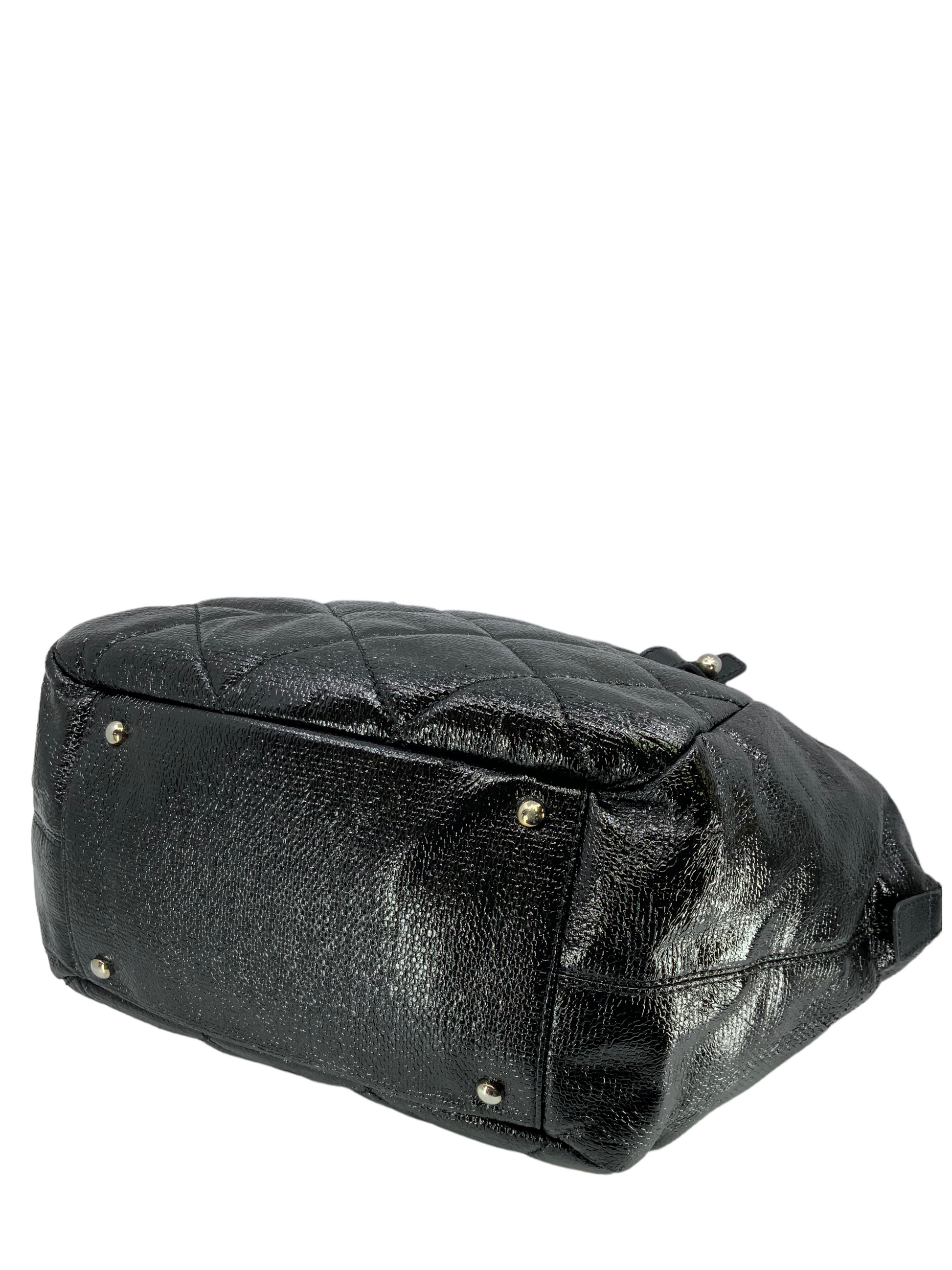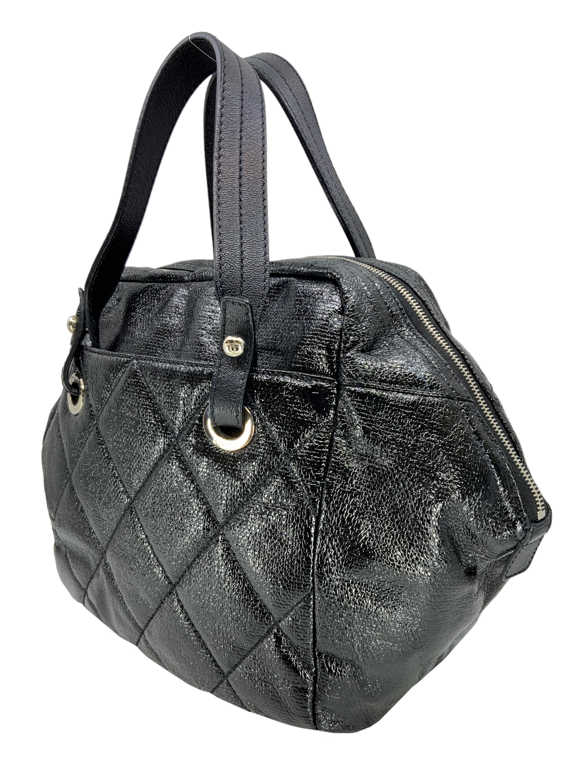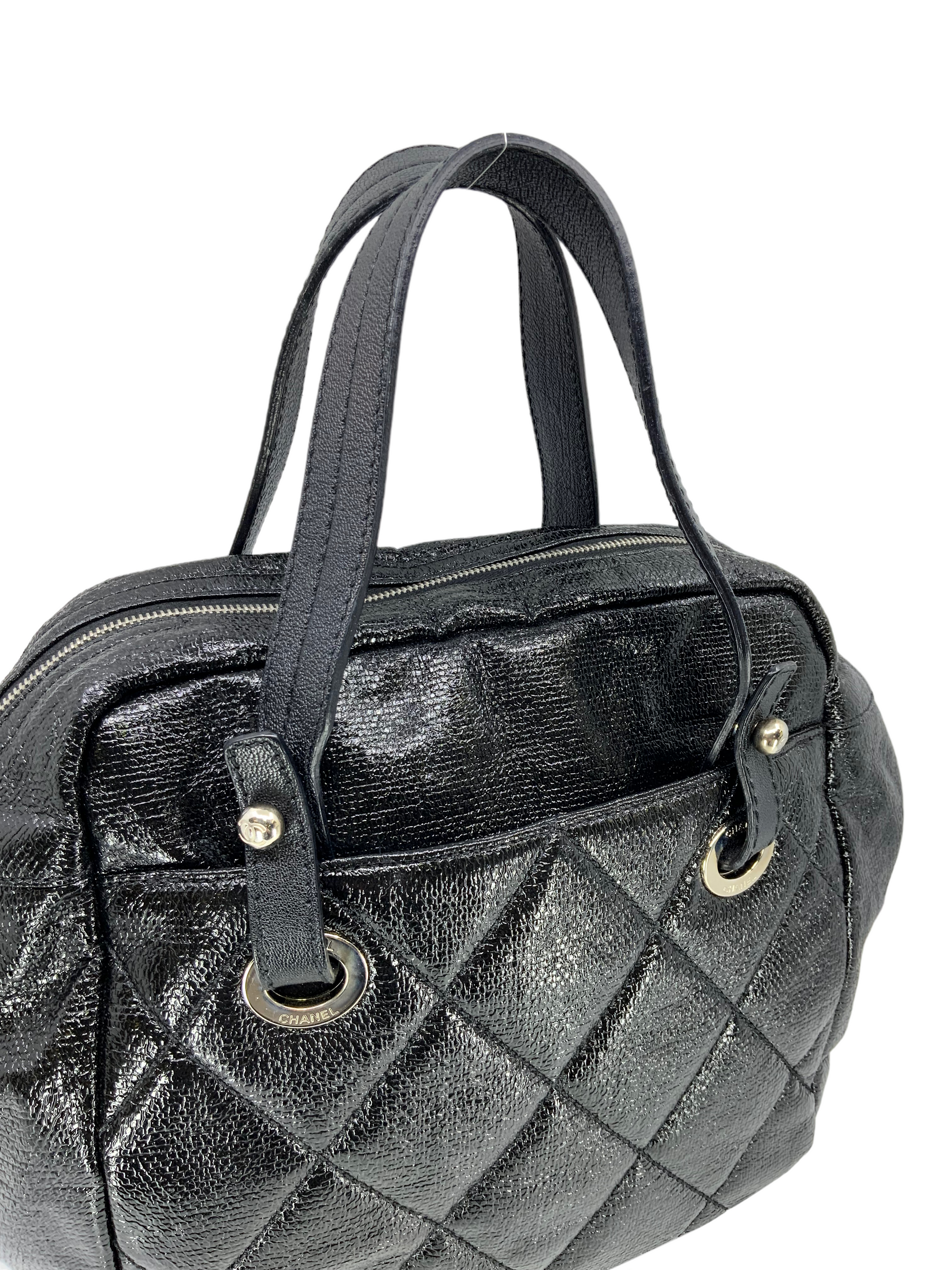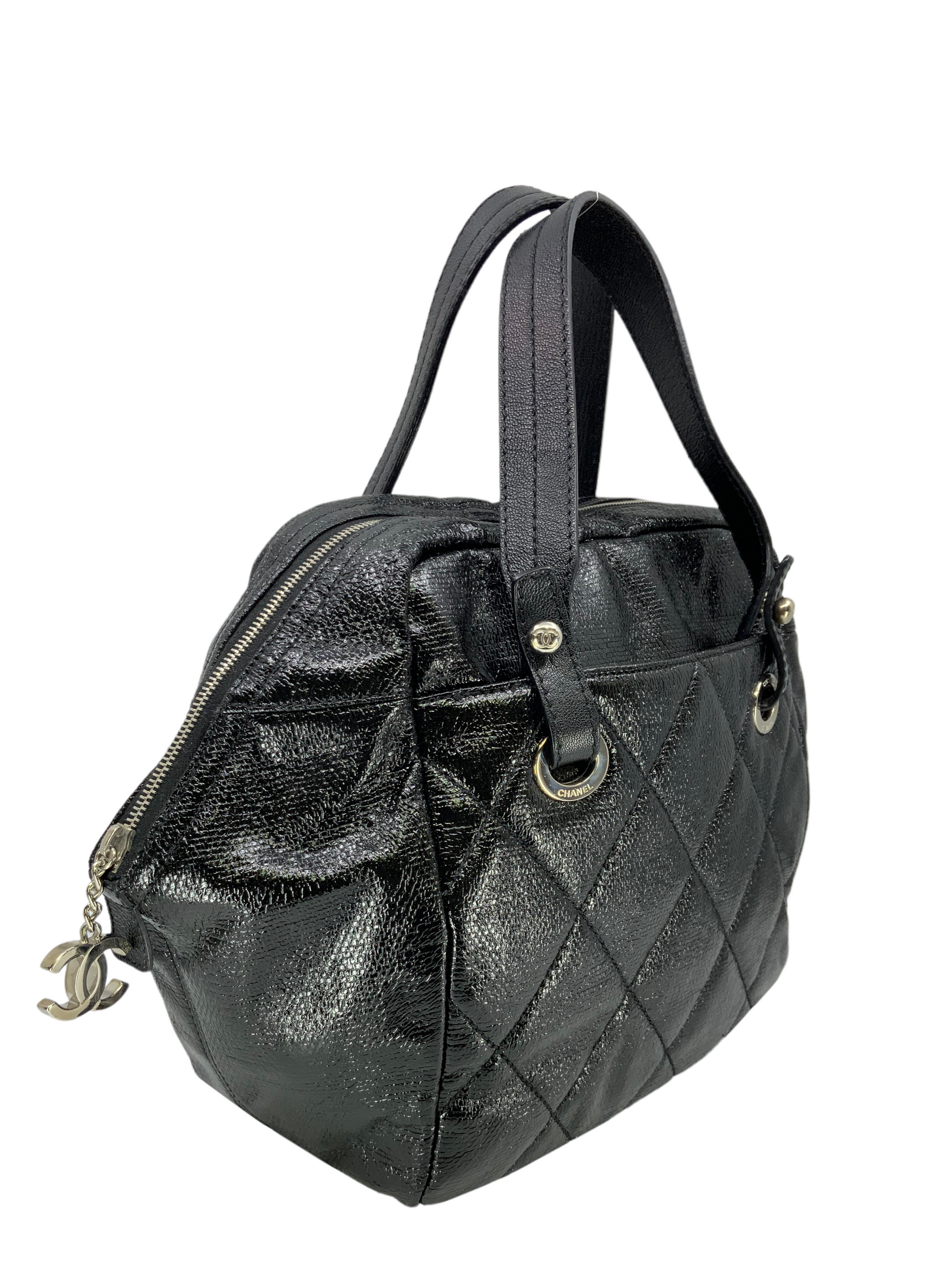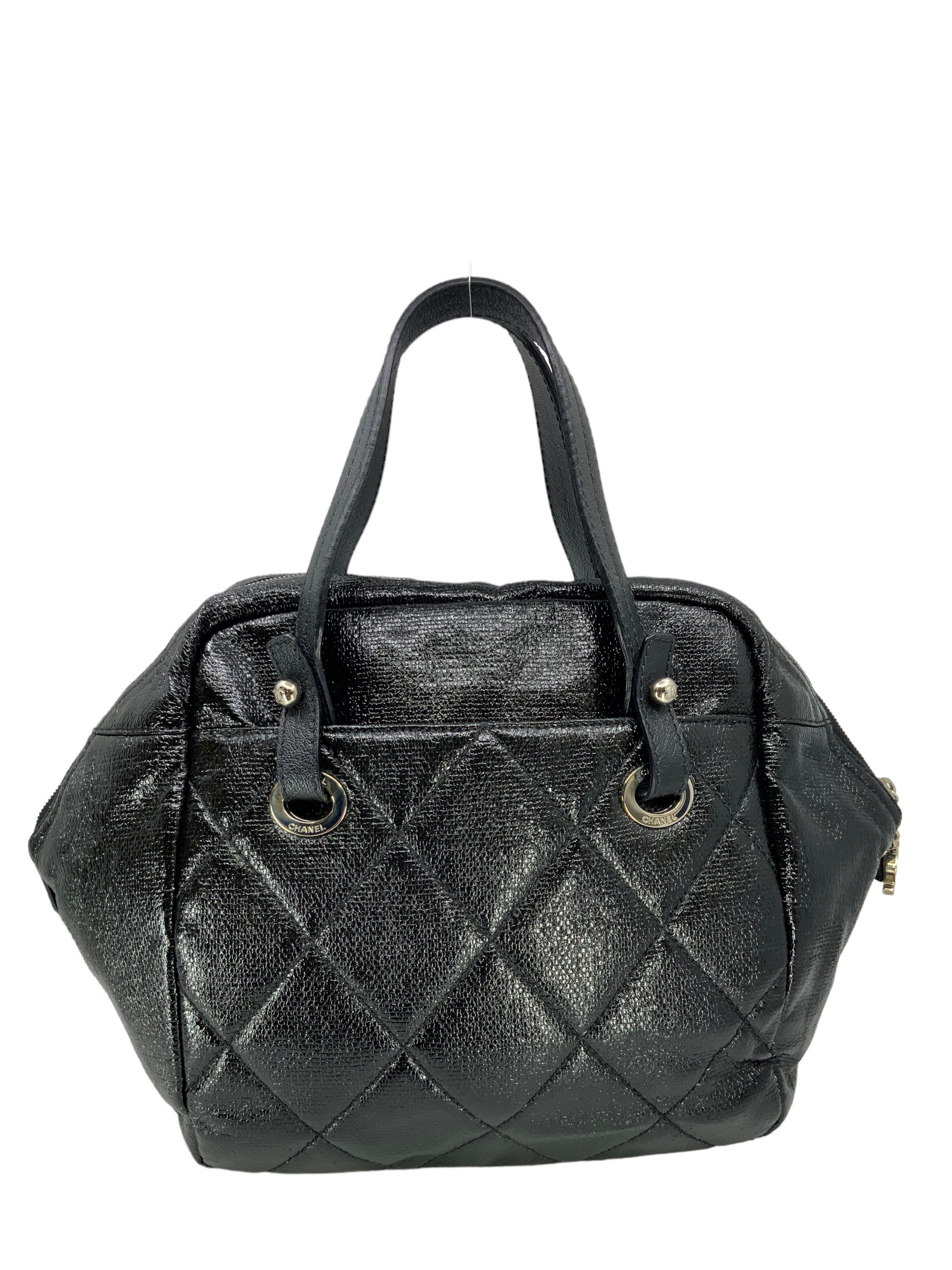 This CHANEL Quilted Coated Leather Large Bowling Bag circa 2008-2009 makes for the perfect everyday carry-all. This chic bag is finely crafted from elegant black diamond quilted coated leather and polished silver-tone hardware. It features dual flat leather top handles, exterior front and rear compartments and a signature 'CC' logo zipper closure. Shop designer handbags by Chanel at Bags Alora.
