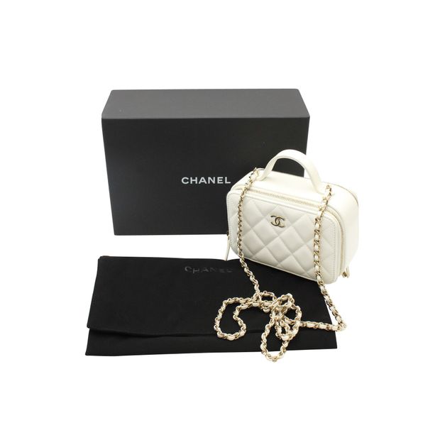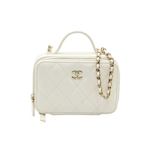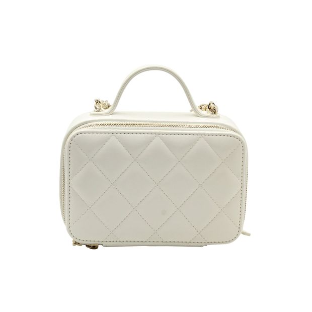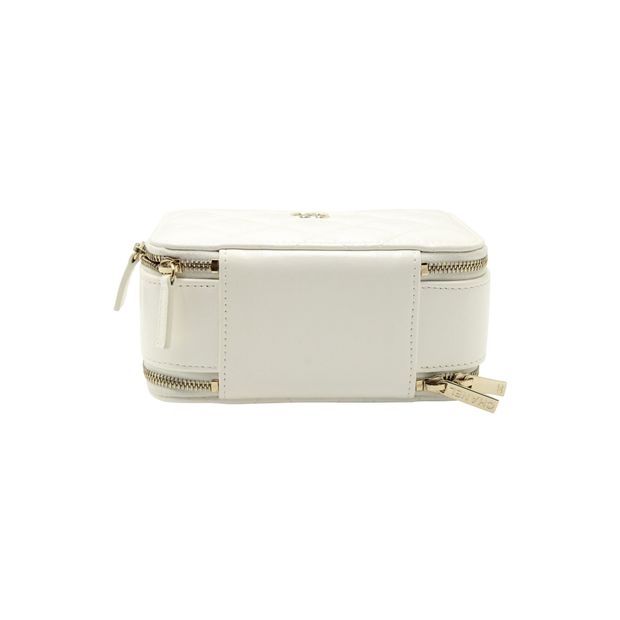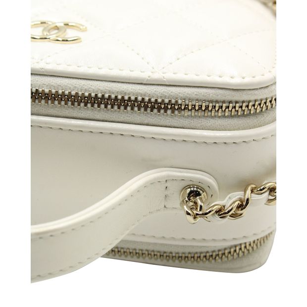 Chanel Quilted Double Zip Small Vanity Case in White Shiny Lambskin Leather Color: white Material: Leather | Lambskin leather Condition: very good Sign of wear: faint mark near the handle SKU: 284050 / NAPBKGBBA281796W Dimensions: Length: 100 mm, Width: 150 mm, Height: 75 mm Collection ID: 22645