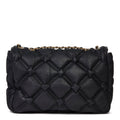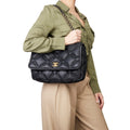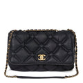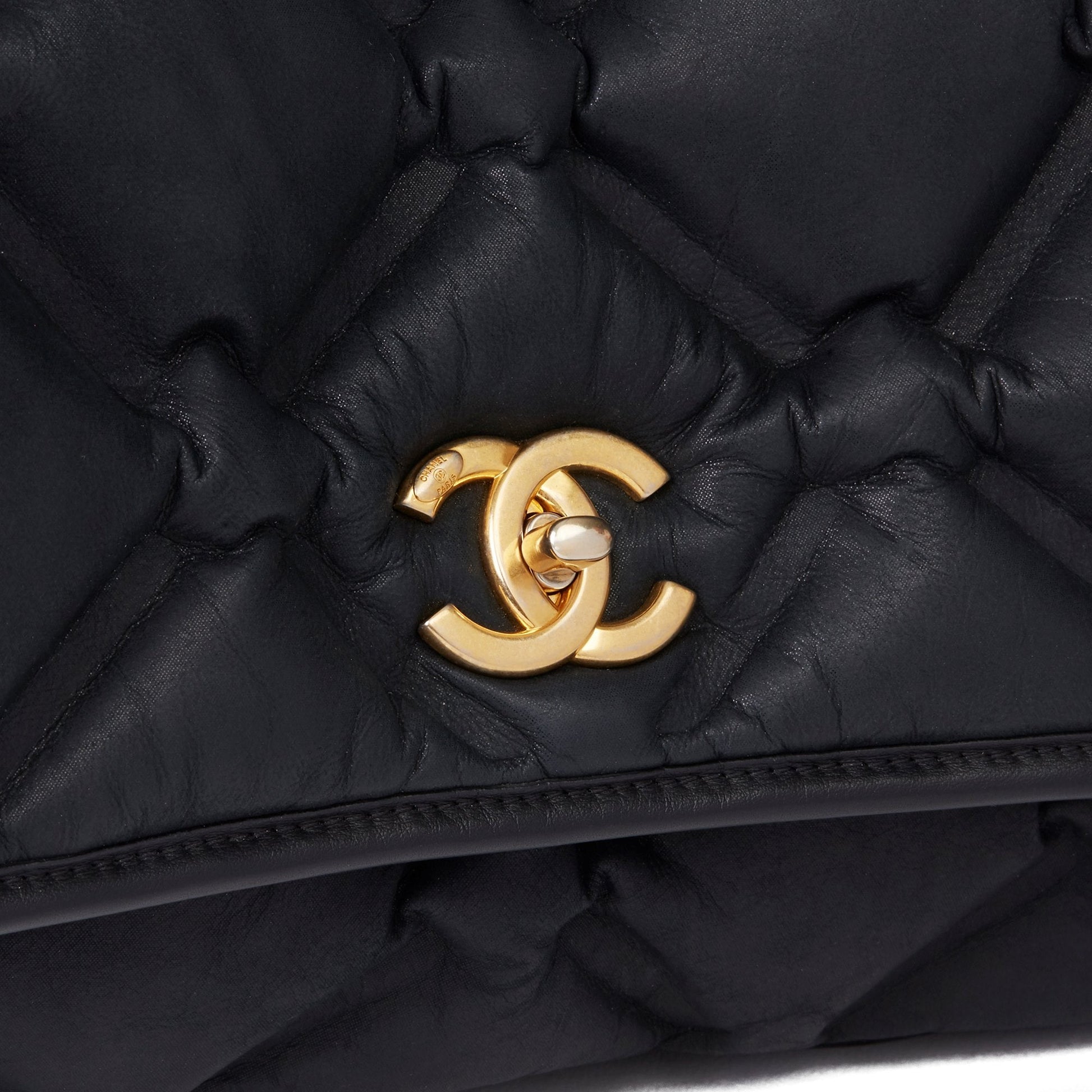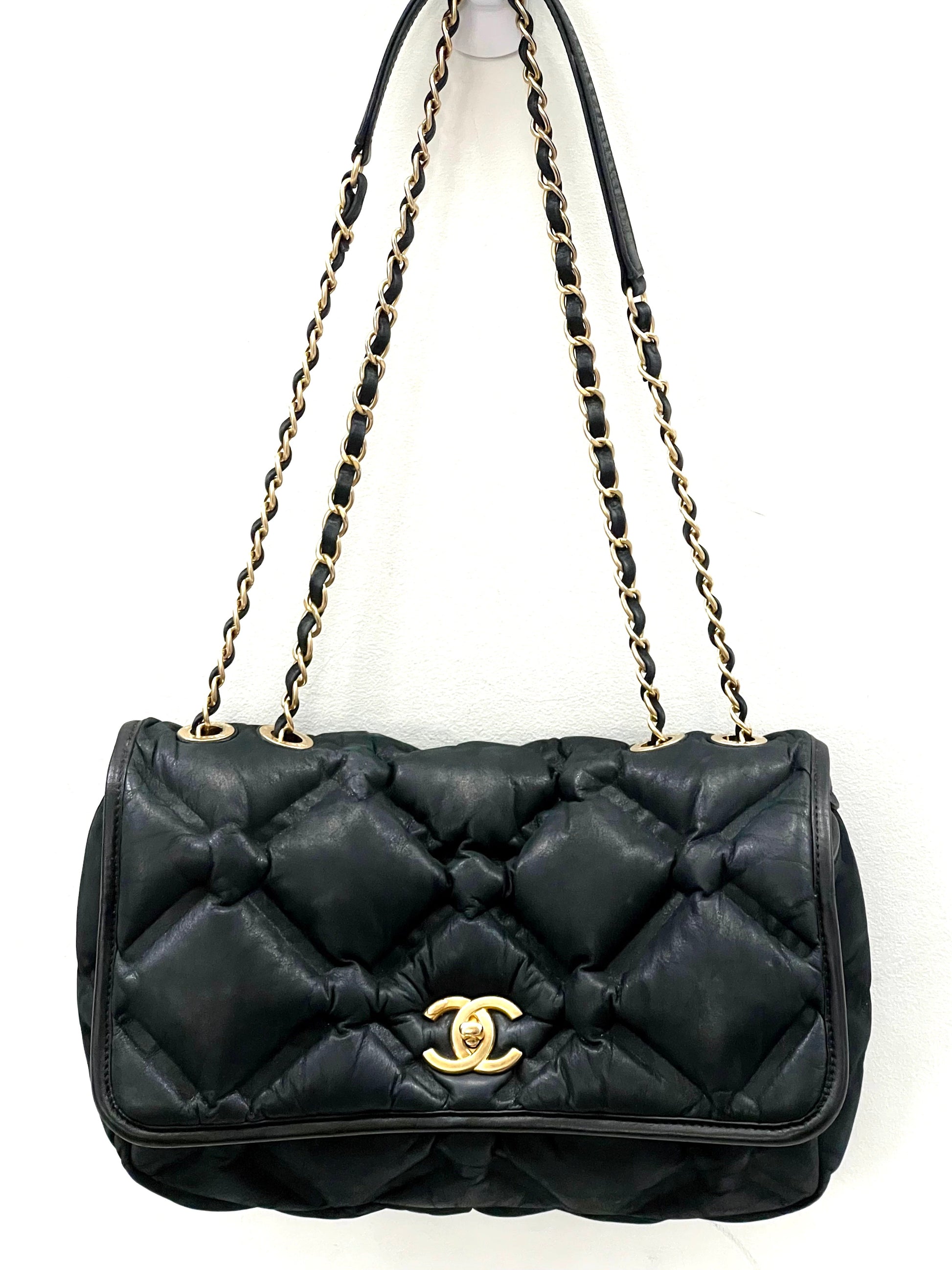 This stylish shoulder bag is crafted of luxuriously soft, stuffed diamond quilted calfskin leather in black. The bag features ruthenium chain leather threaded shoulder straps and a facing flap with a ruthenium Chanel CC turn lock.