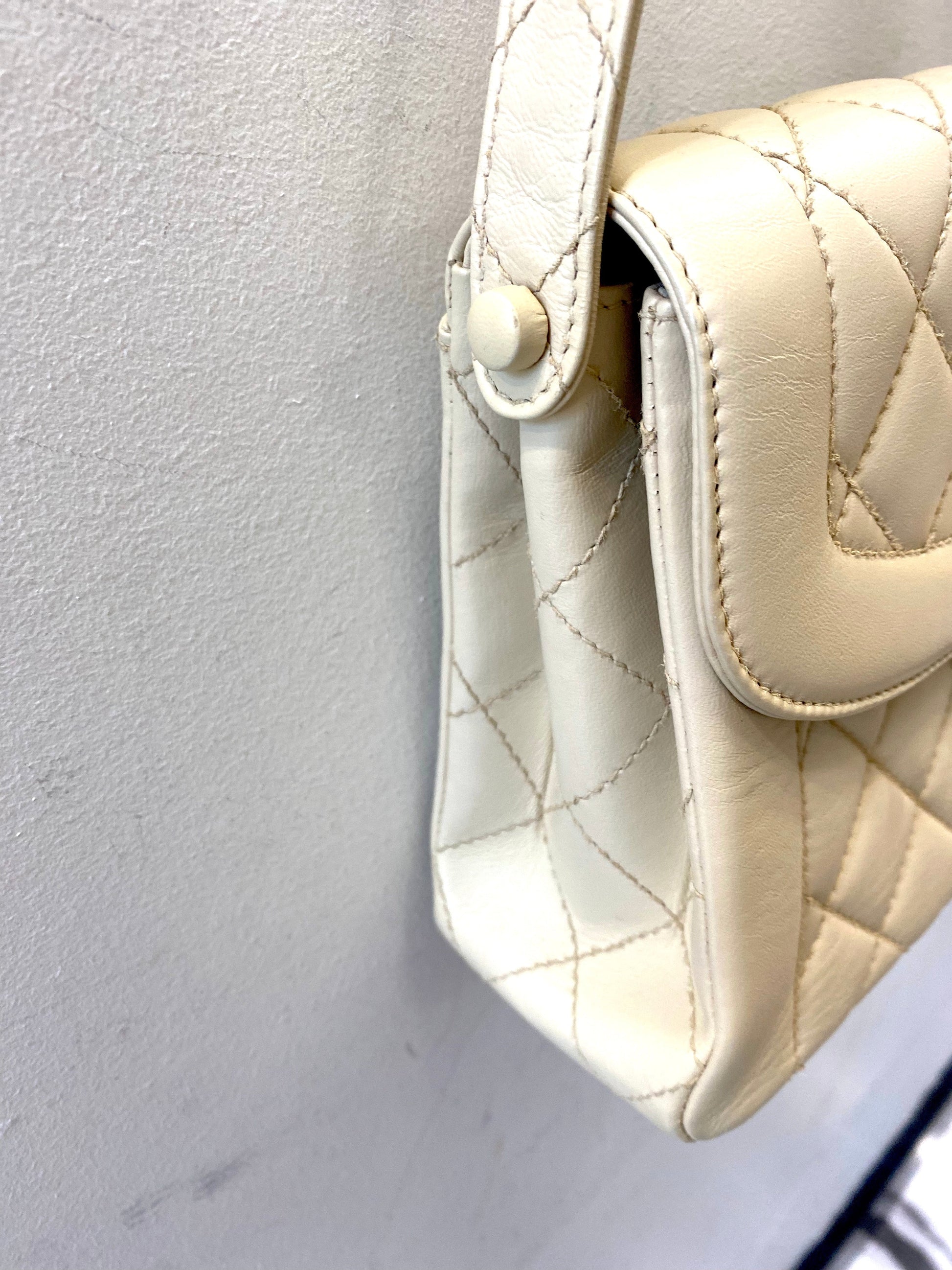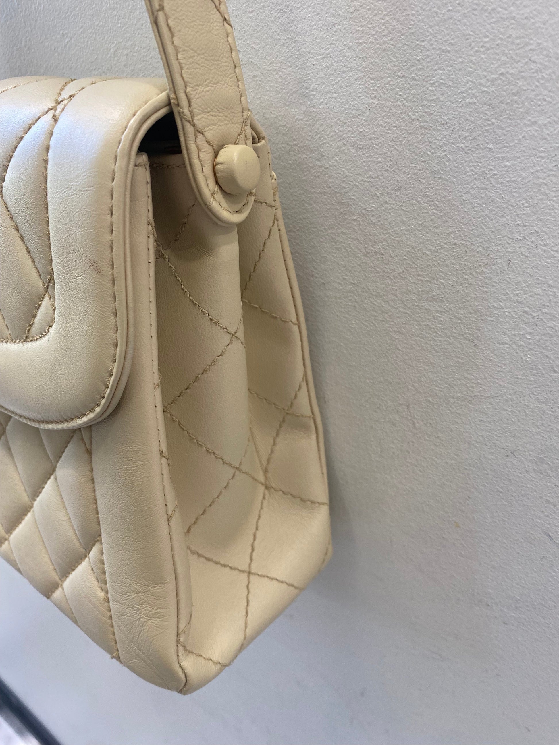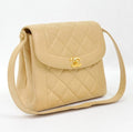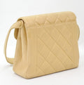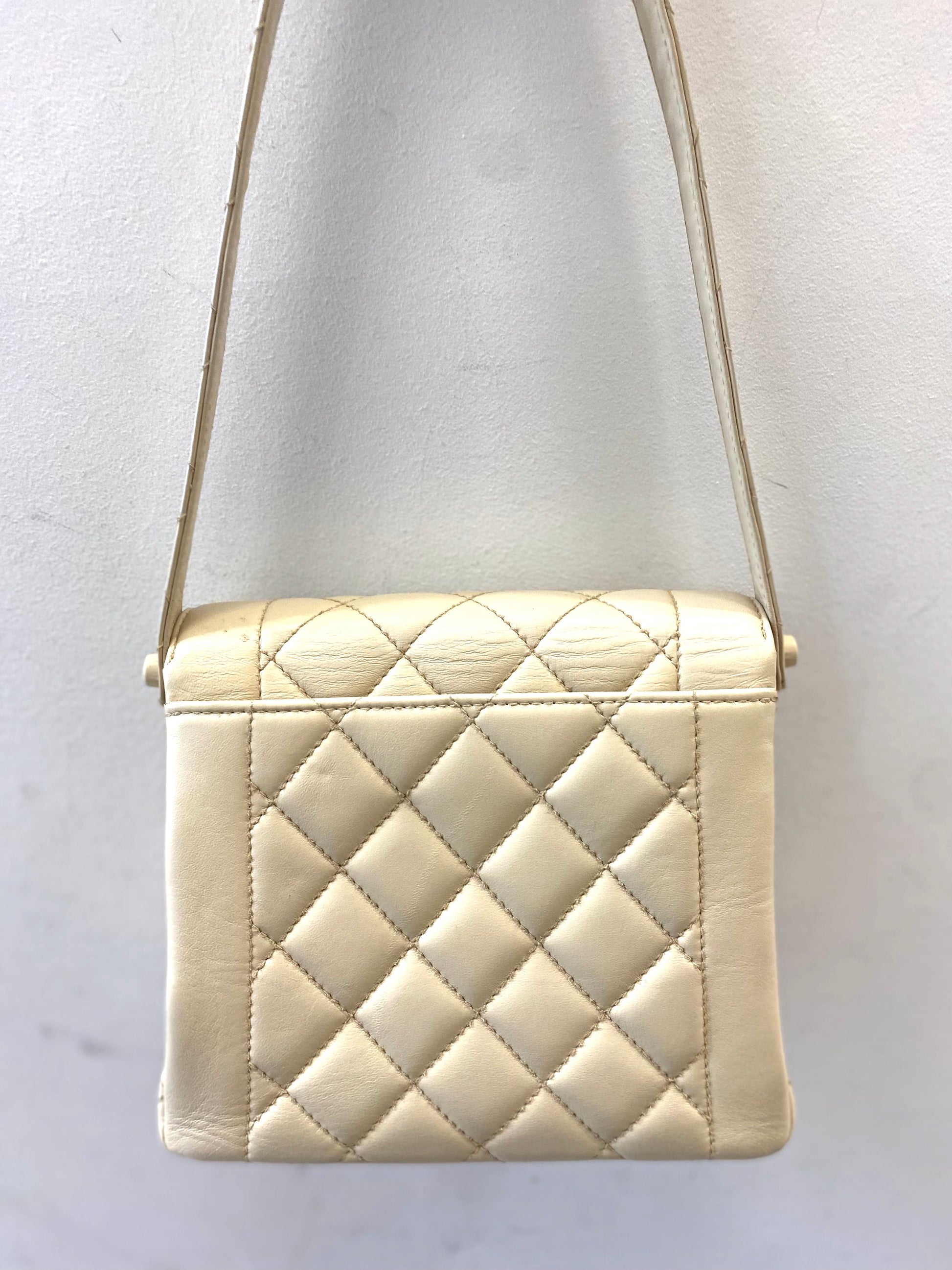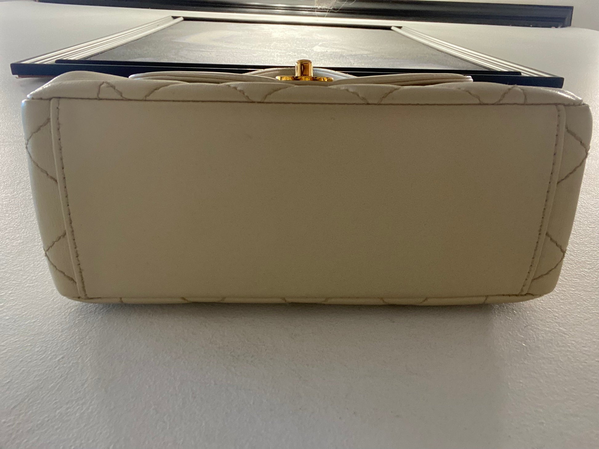 Featuring Chanel's classic quilted lambskin leather and gold CC turnlock closure. The square shape and single flap closure make this an everyday go-to piece. Single leather strap fits perfectly under the shoulder. Smooth lambskin leather sides. Beige leather interior with a zipper pocket. Single side pocket.