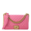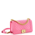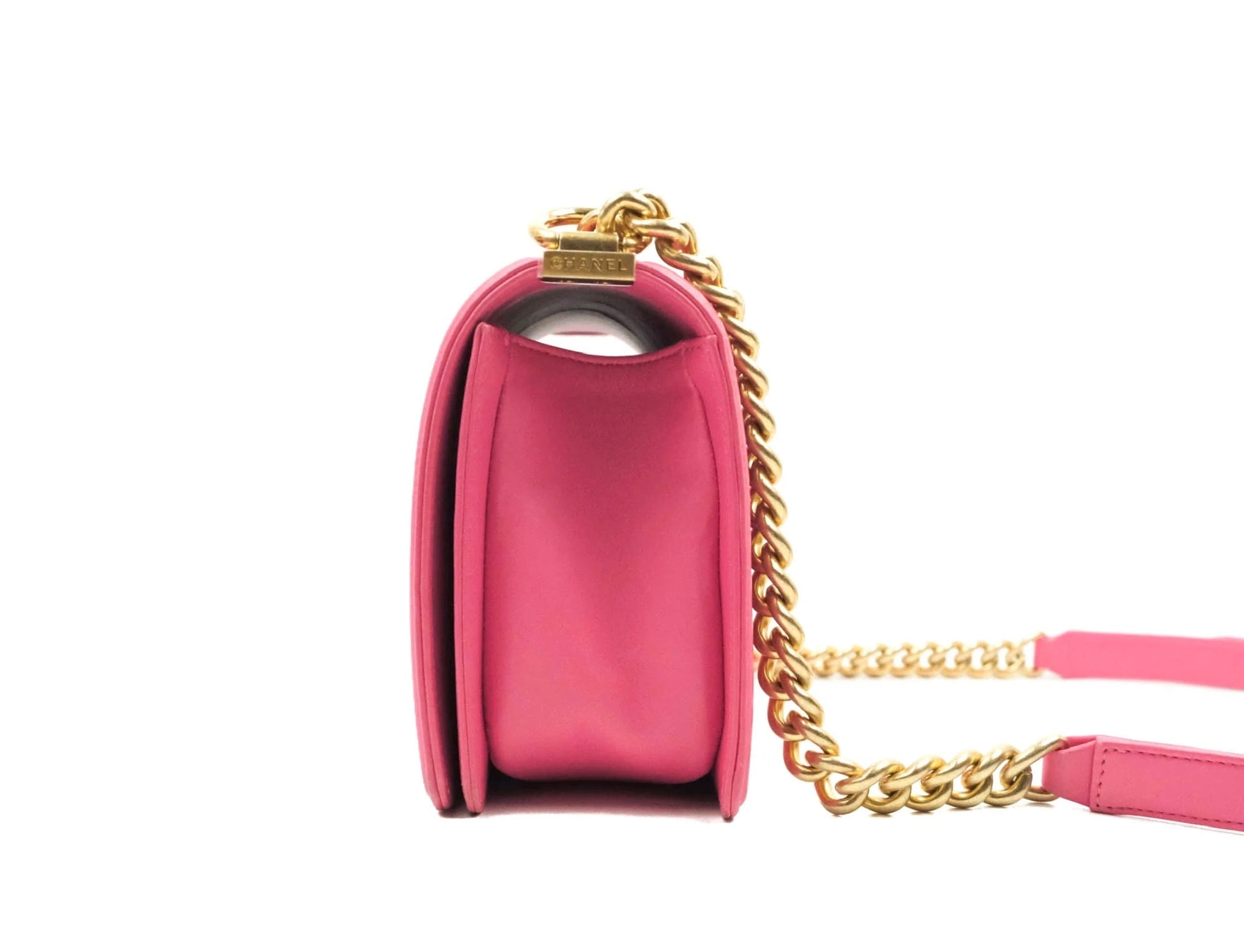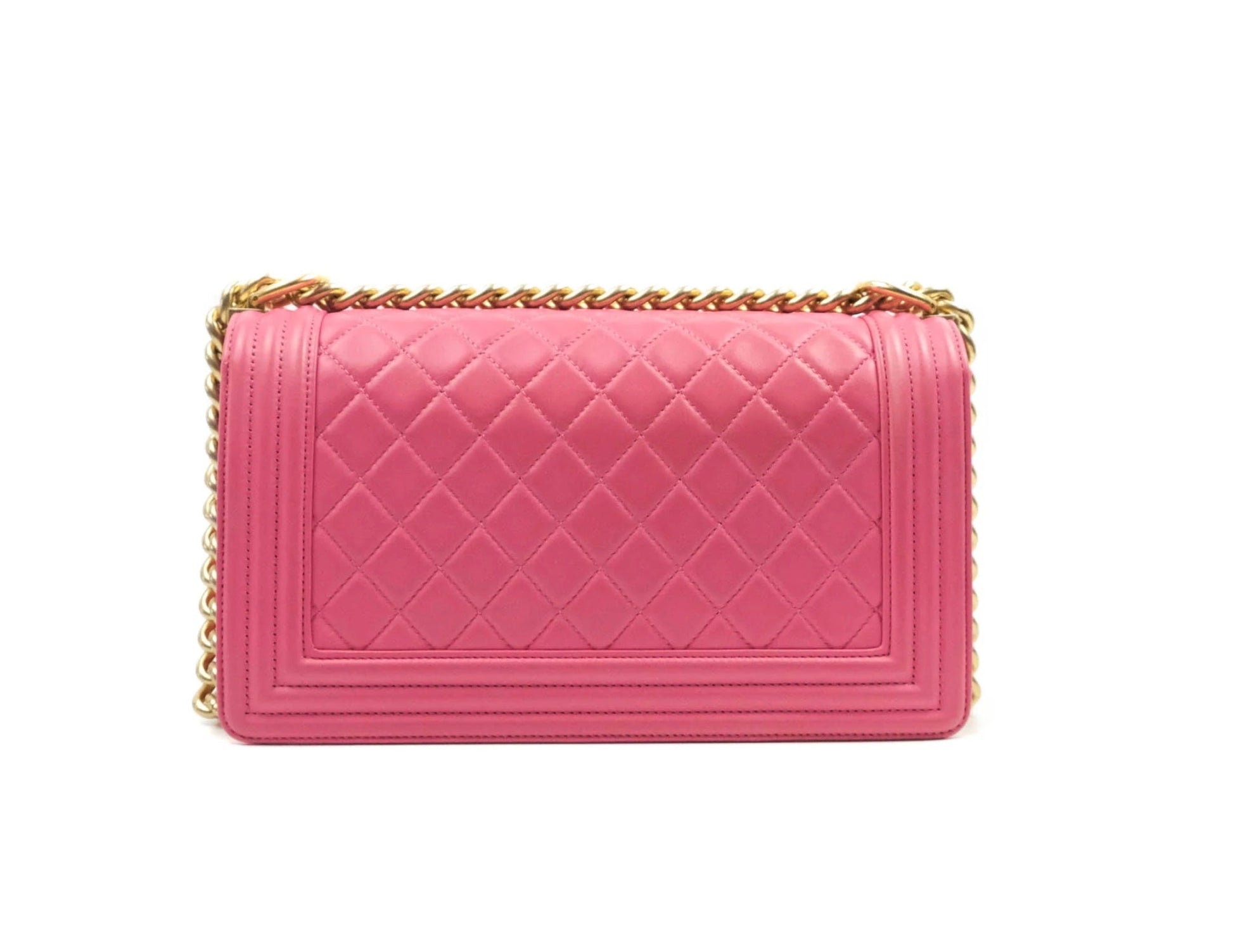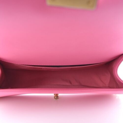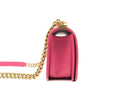 This Stunning Chanel Boy Bag is crafted in durable diamond Lambskin leather in a gorgeous pink. It features a CC push lock and adjustable chain strap in the shiny gold-tone Hardware, it can be on the shoulder as a cross-body.