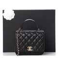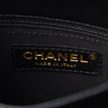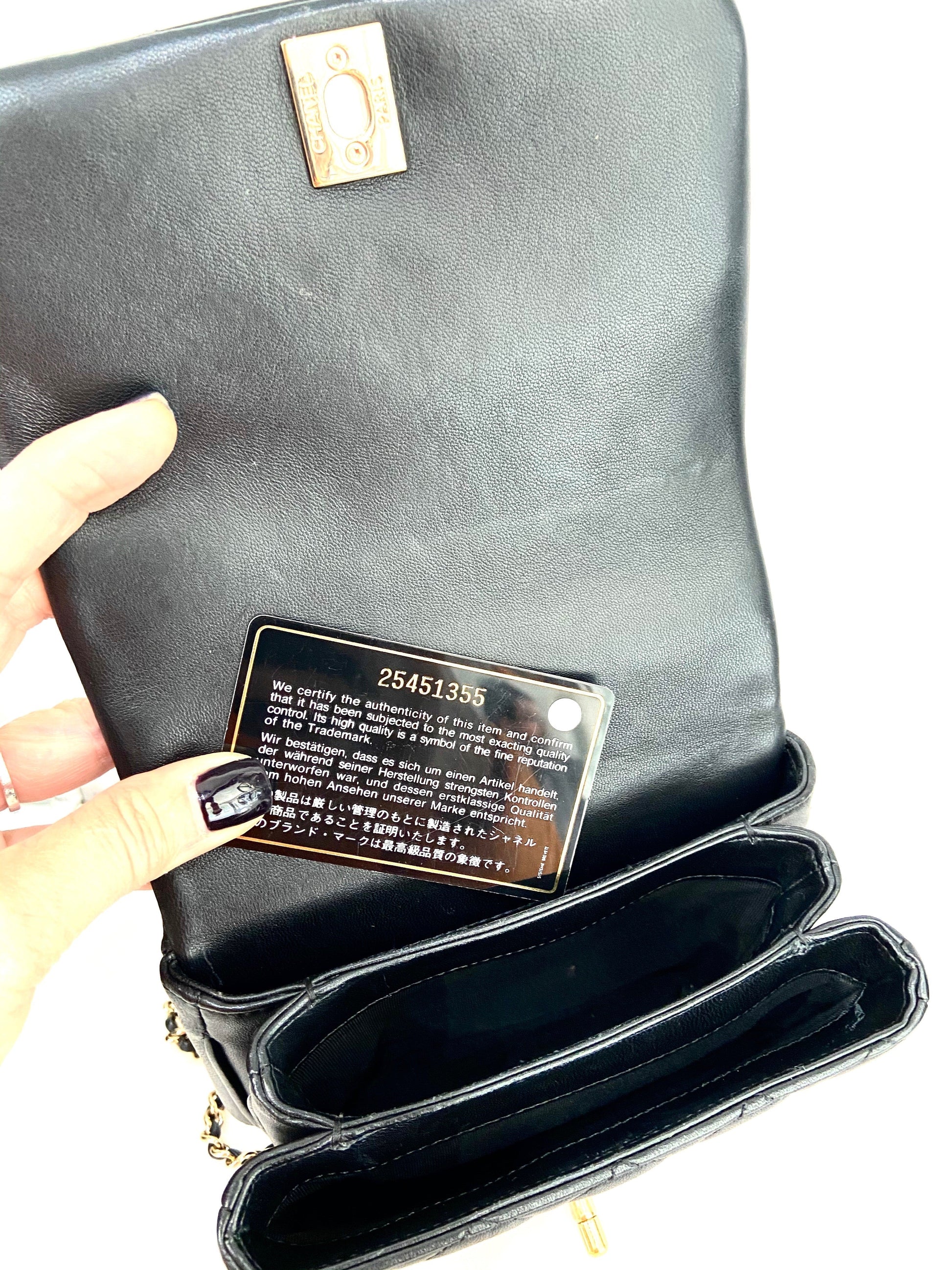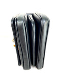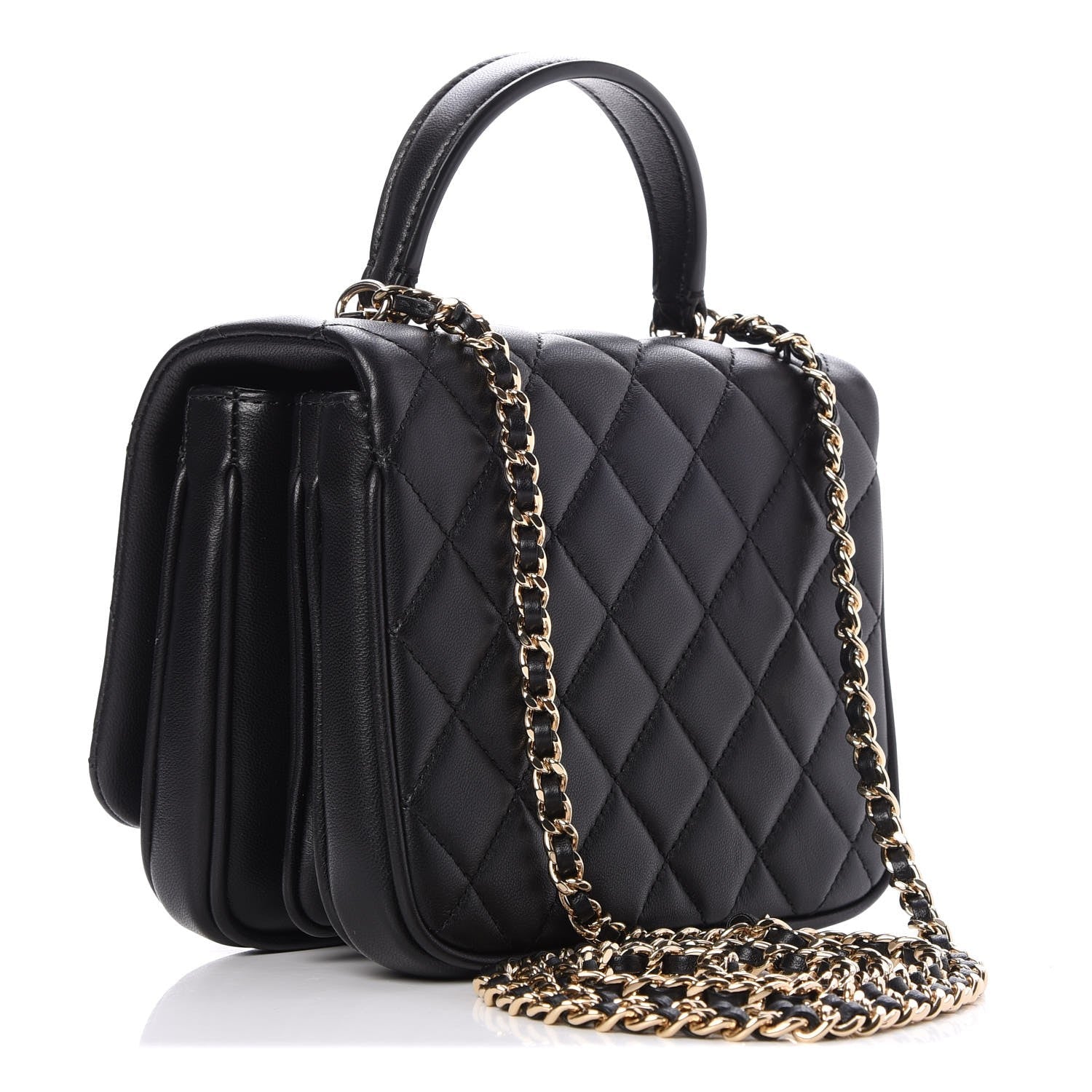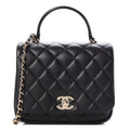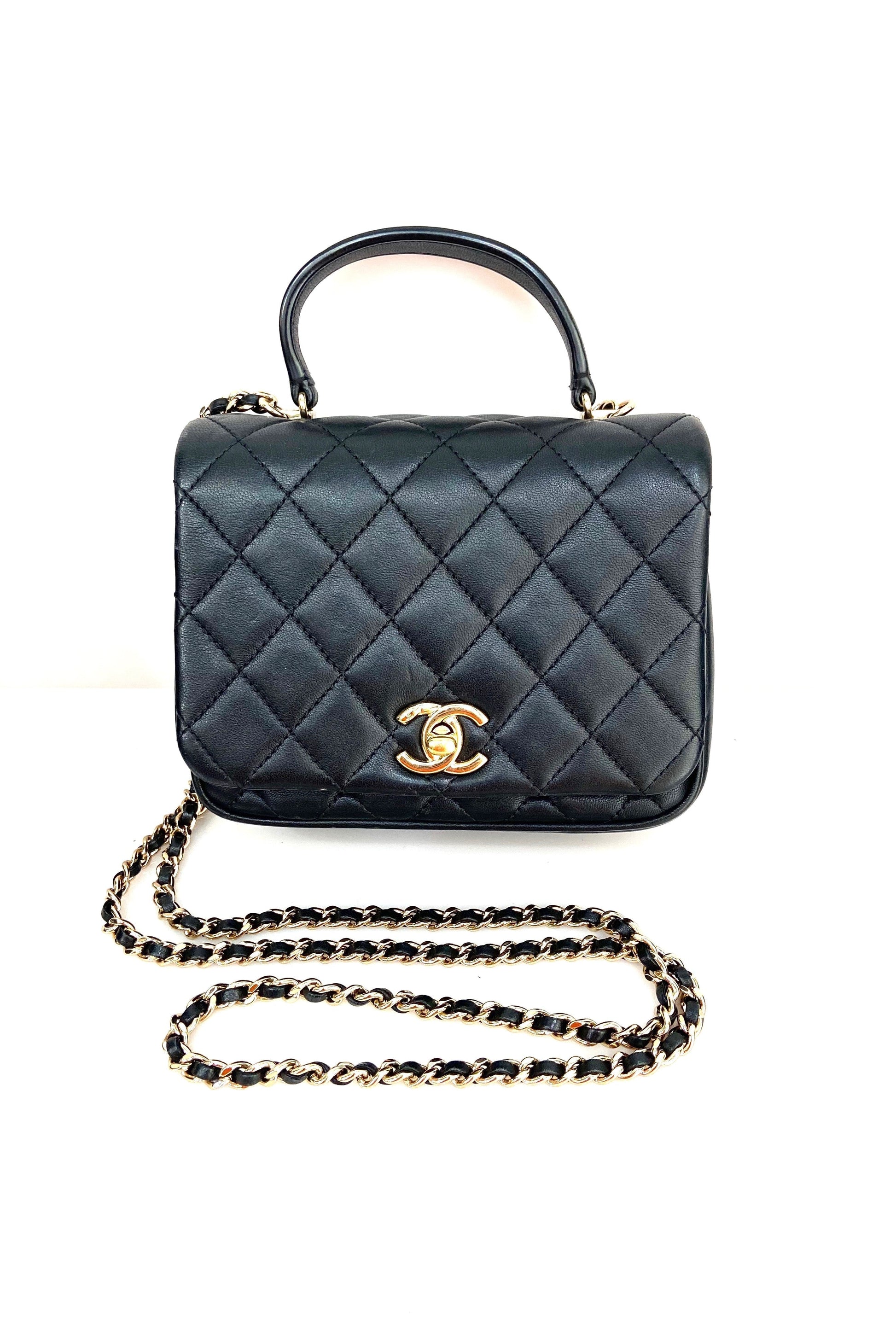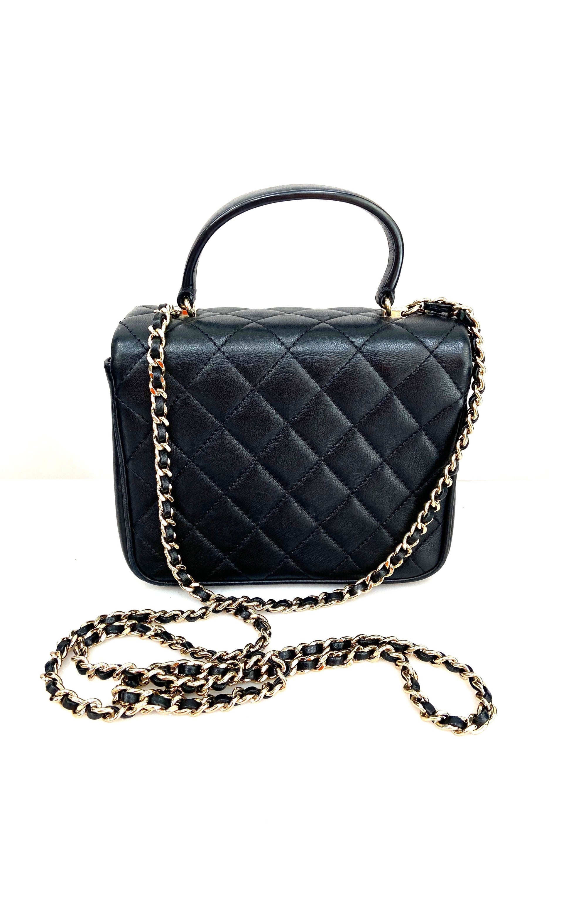 The shoulder bag features a black leather top handle, a polished gold chain link leather threaded shoulder strap, a rear patch pocket and a polished gold CC turn clock closure. This opens the flap to a partitioned black fabric interior with a zipper pocket. This elegant flap bag has room for all your essentials.
