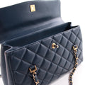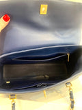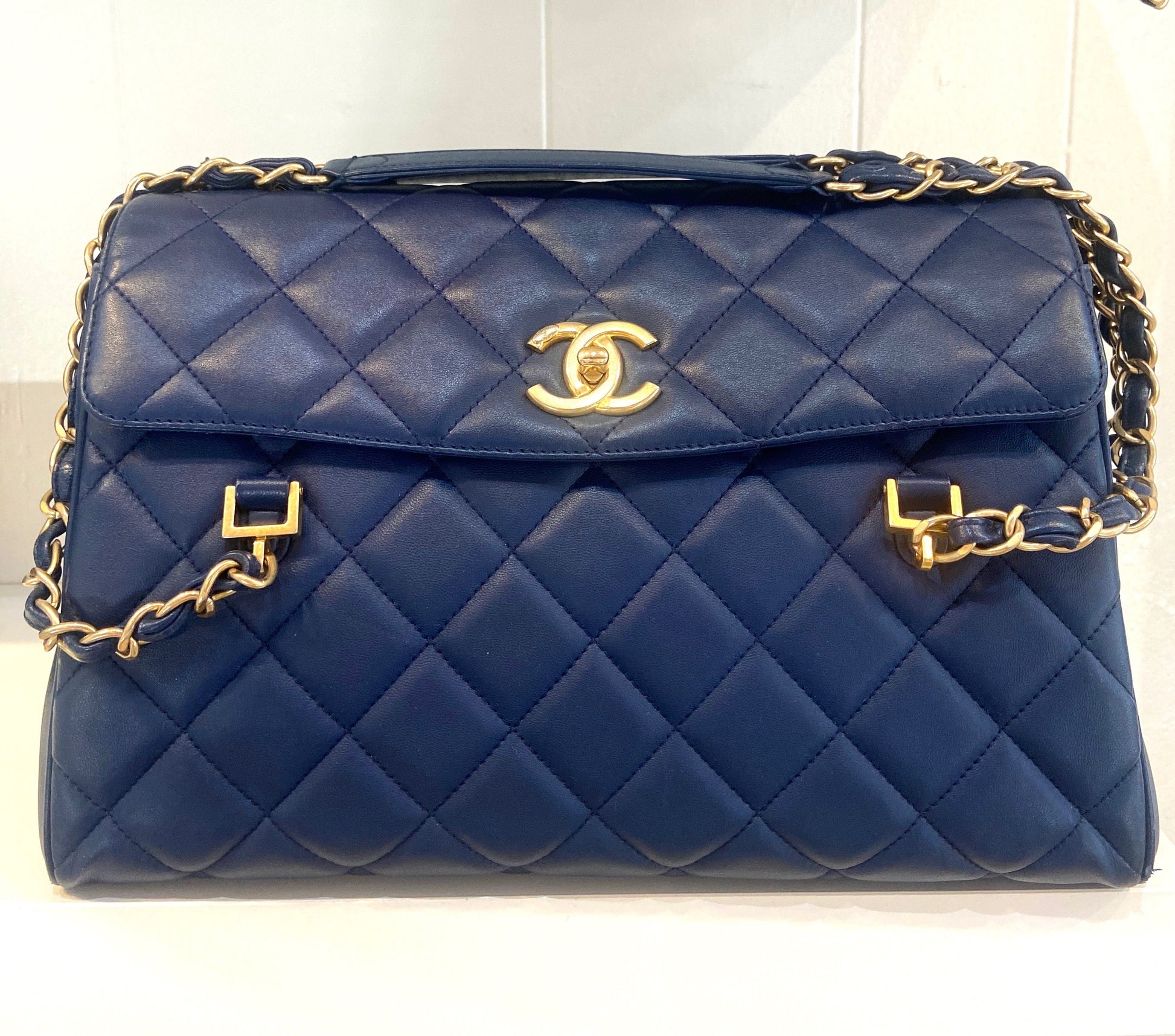 The bag features gold leather threaded chain link shoulder straps with a gold Chanel CC Mademoiselle turn lock for the short top flap. This opens to a leather interior with zipper and patch pockets. This is a marvelous shoulder bag, ideal for a distinctly one-of-a-kind look.