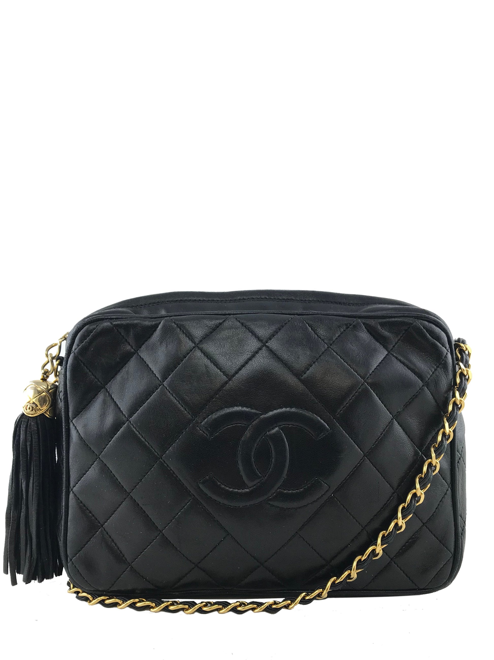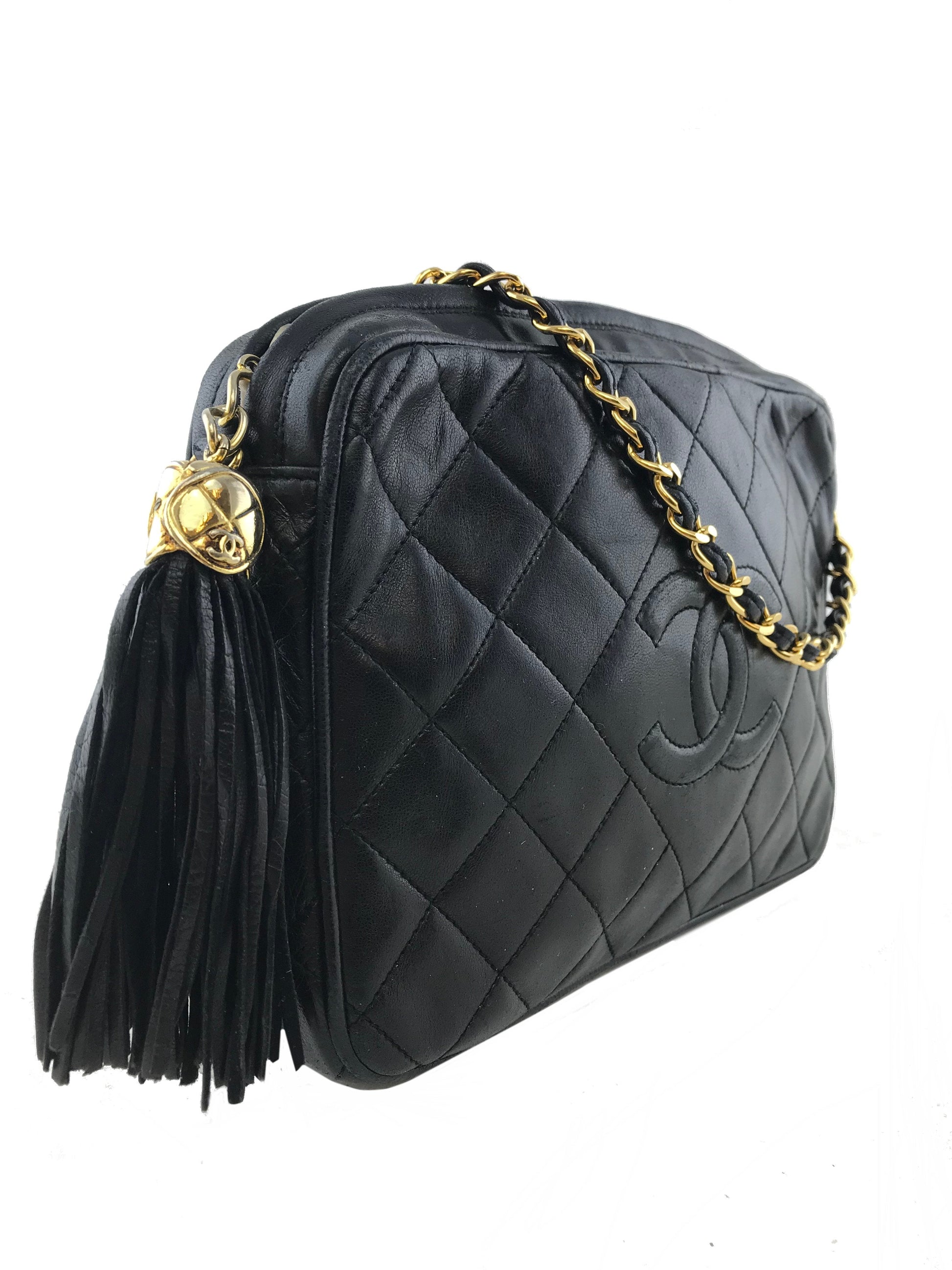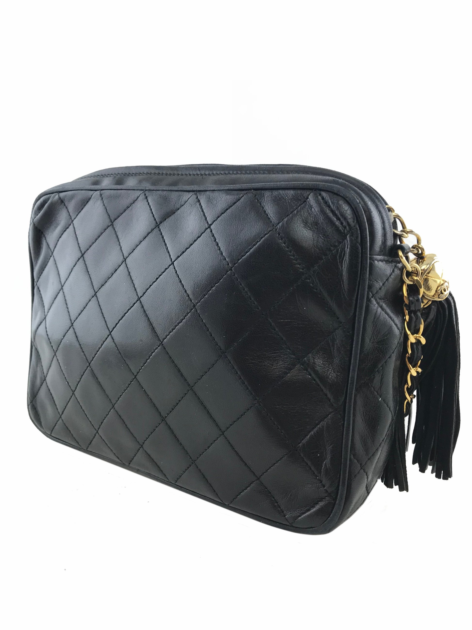 We the ity of this iconic Chanel Quilted Lambskin Tassel Camera Case Bag crafted from soft black diamond quilted lambskin leather with a signature embossed CC logo at front. Featuring a gold-tone and leather chain link shoulder strap and a tassel zipper closure. The interior is beautifully lined in smooth black leather with a single zipper pocket.