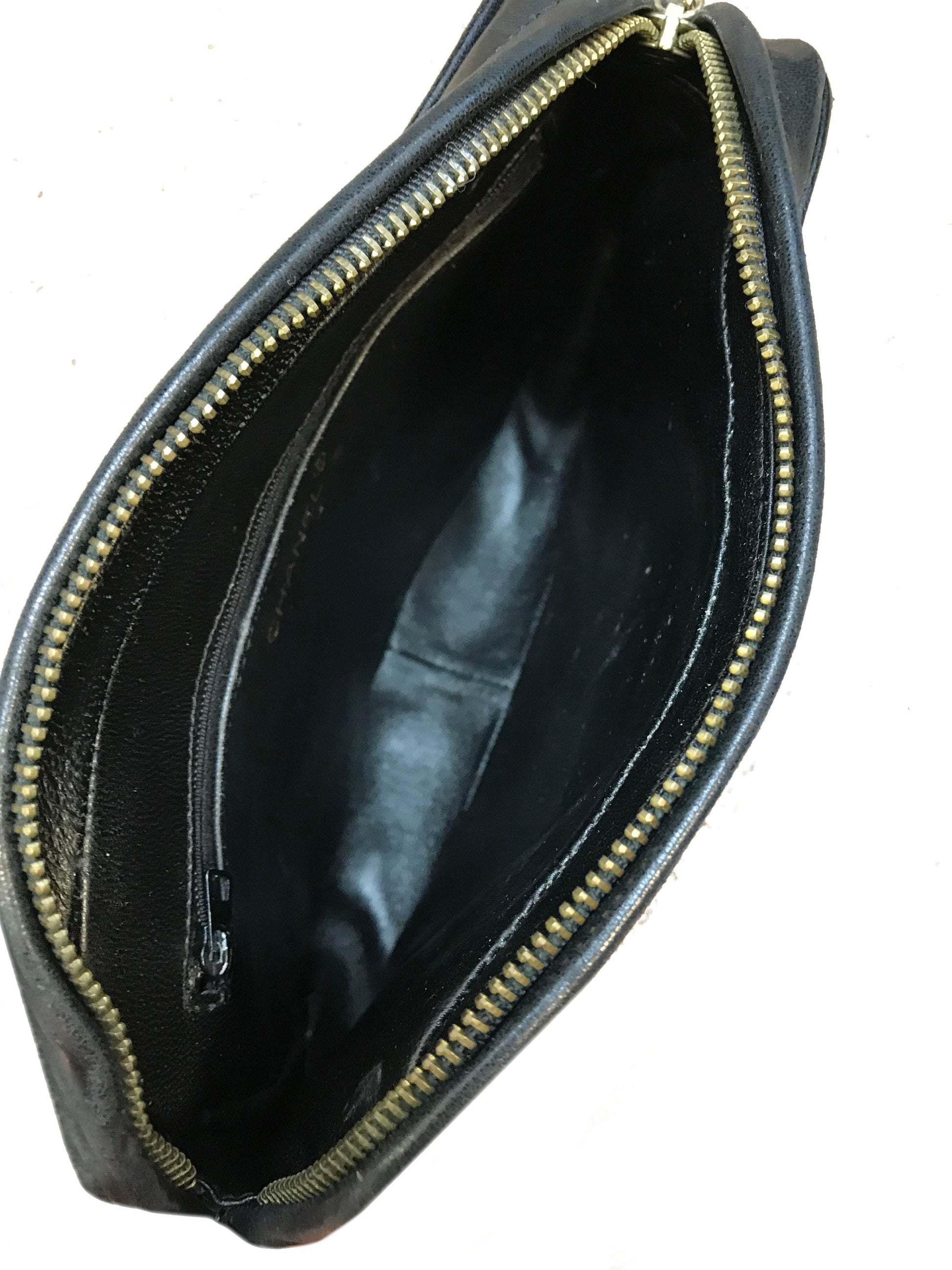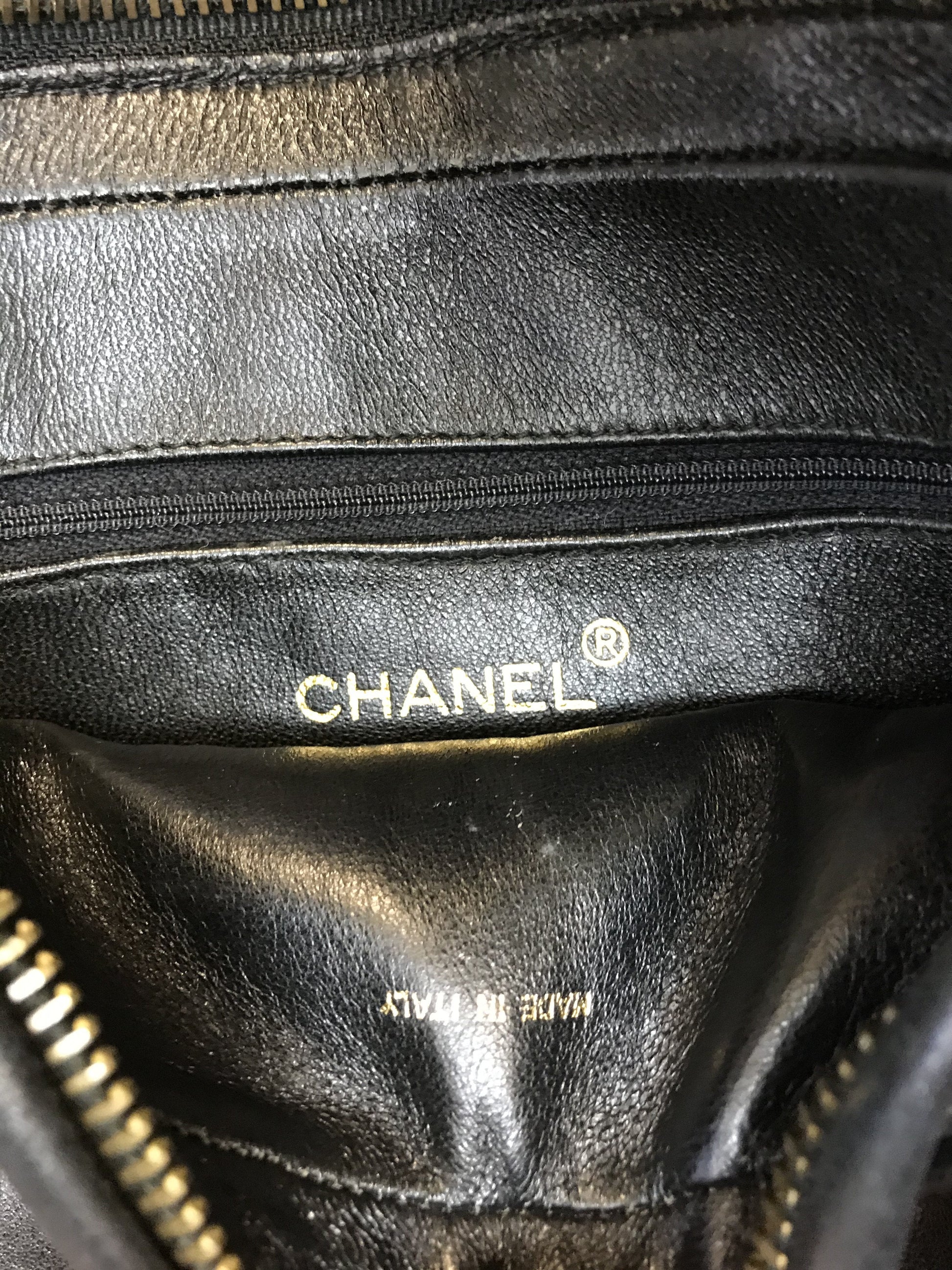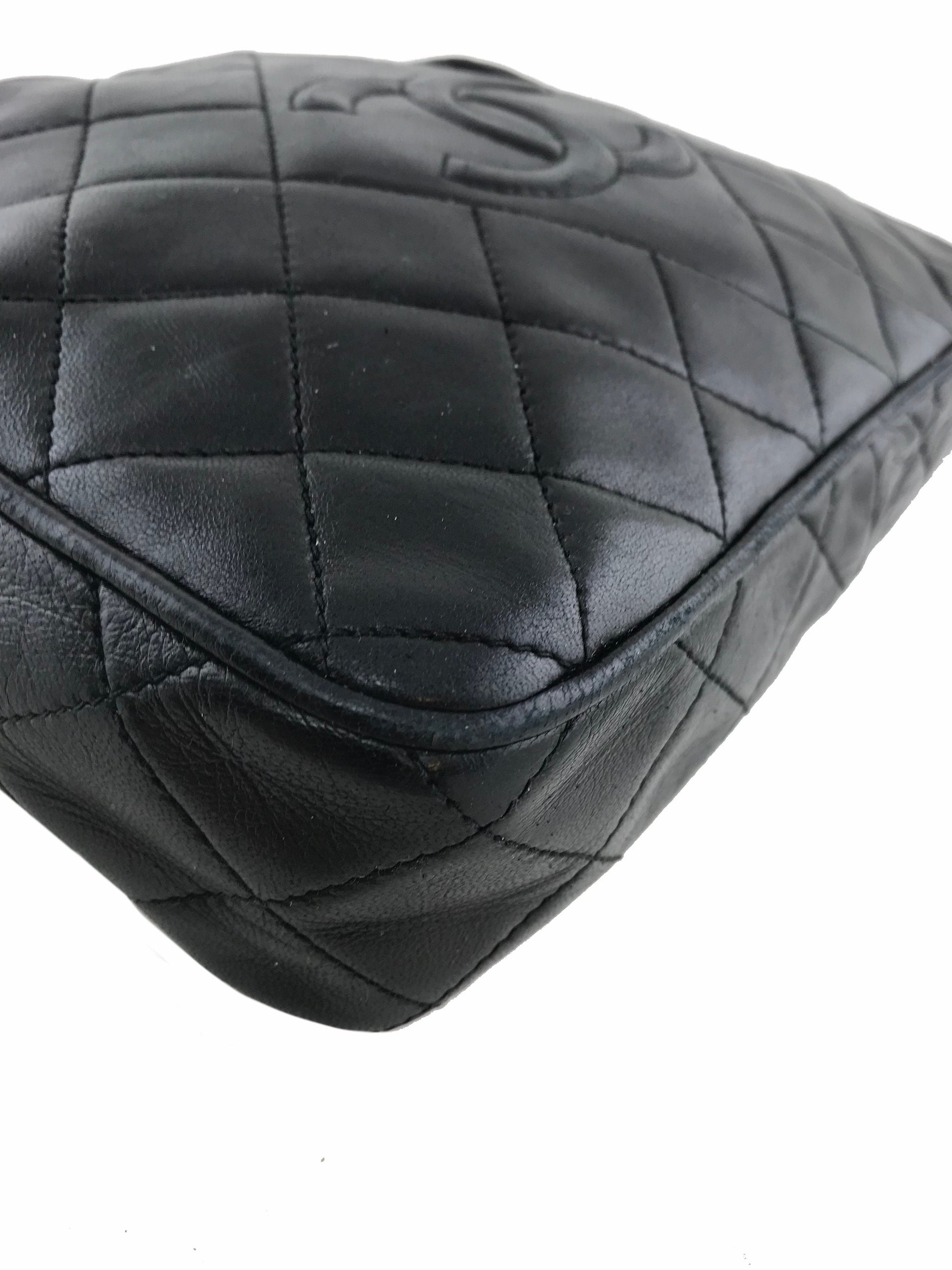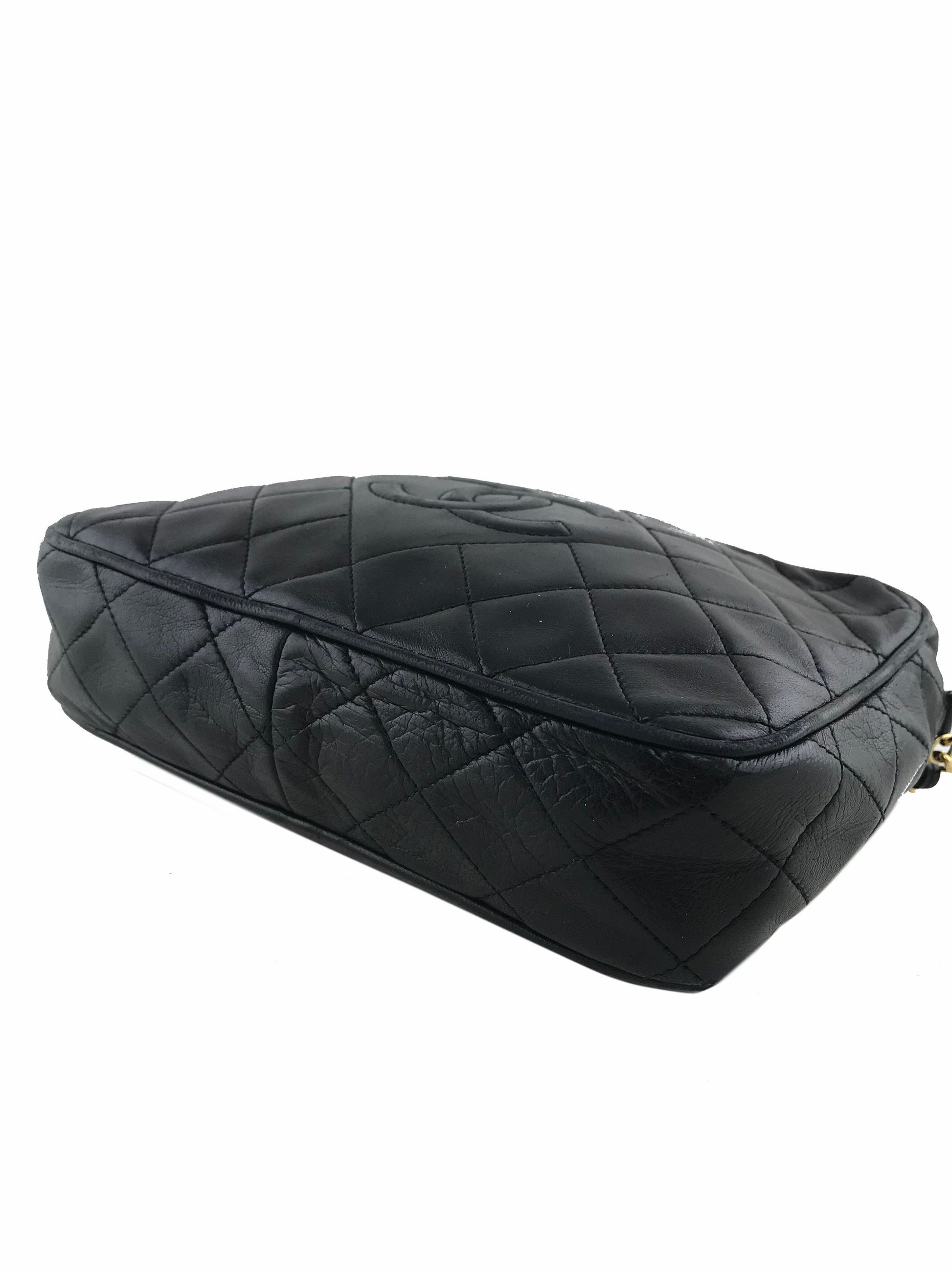 We the ity of this iconic Chanel Quilted Lambskin Tassel Camera Case Bag crafted from soft black diamond quilted lambskin leather with a signature embossed CC logo at front. Featuring a gold-tone and leather chain link shoulder strap and a tassel zipper closure. The interior is beautifully lined in smooth black leather with a single zipper pocket.