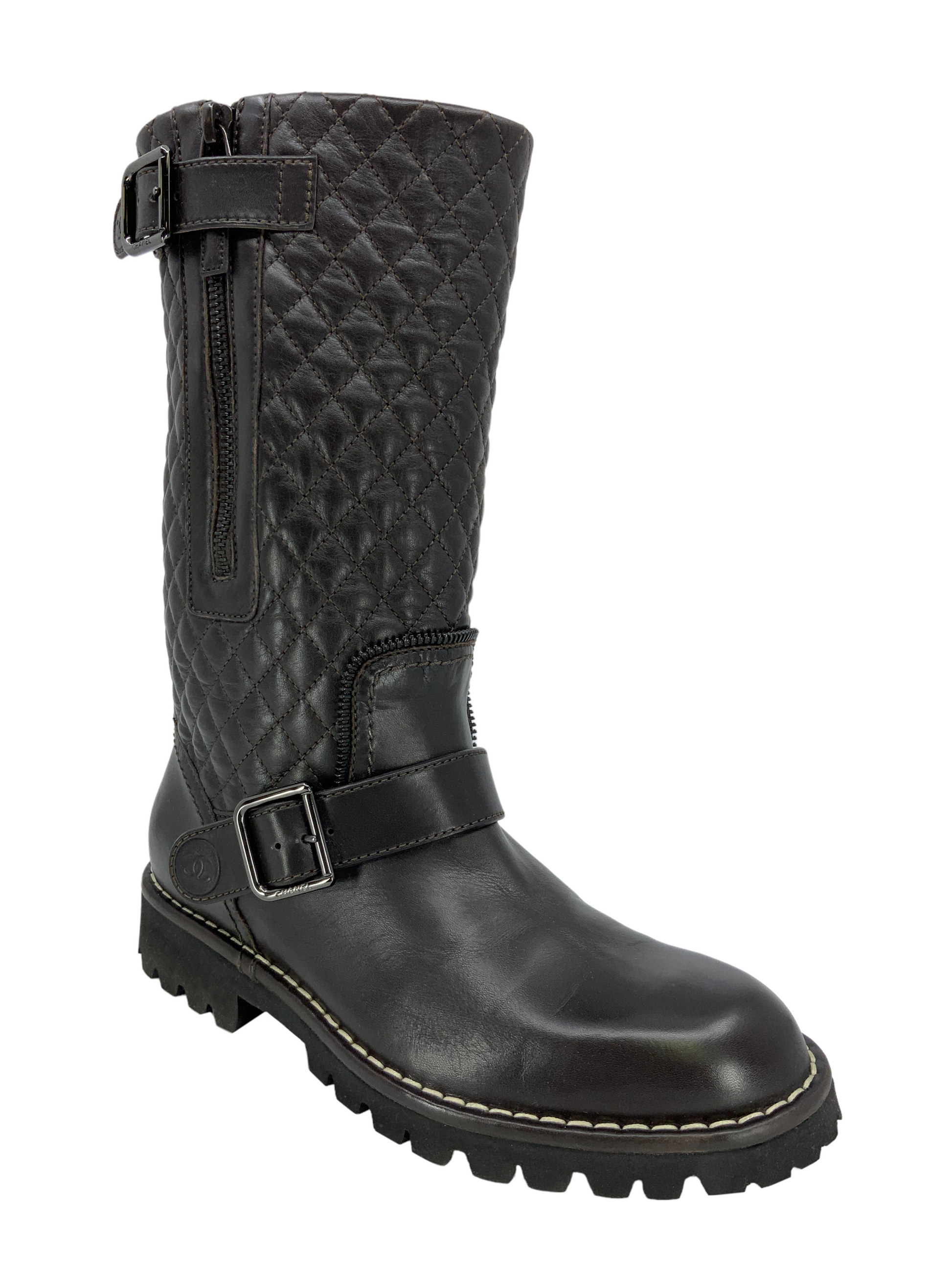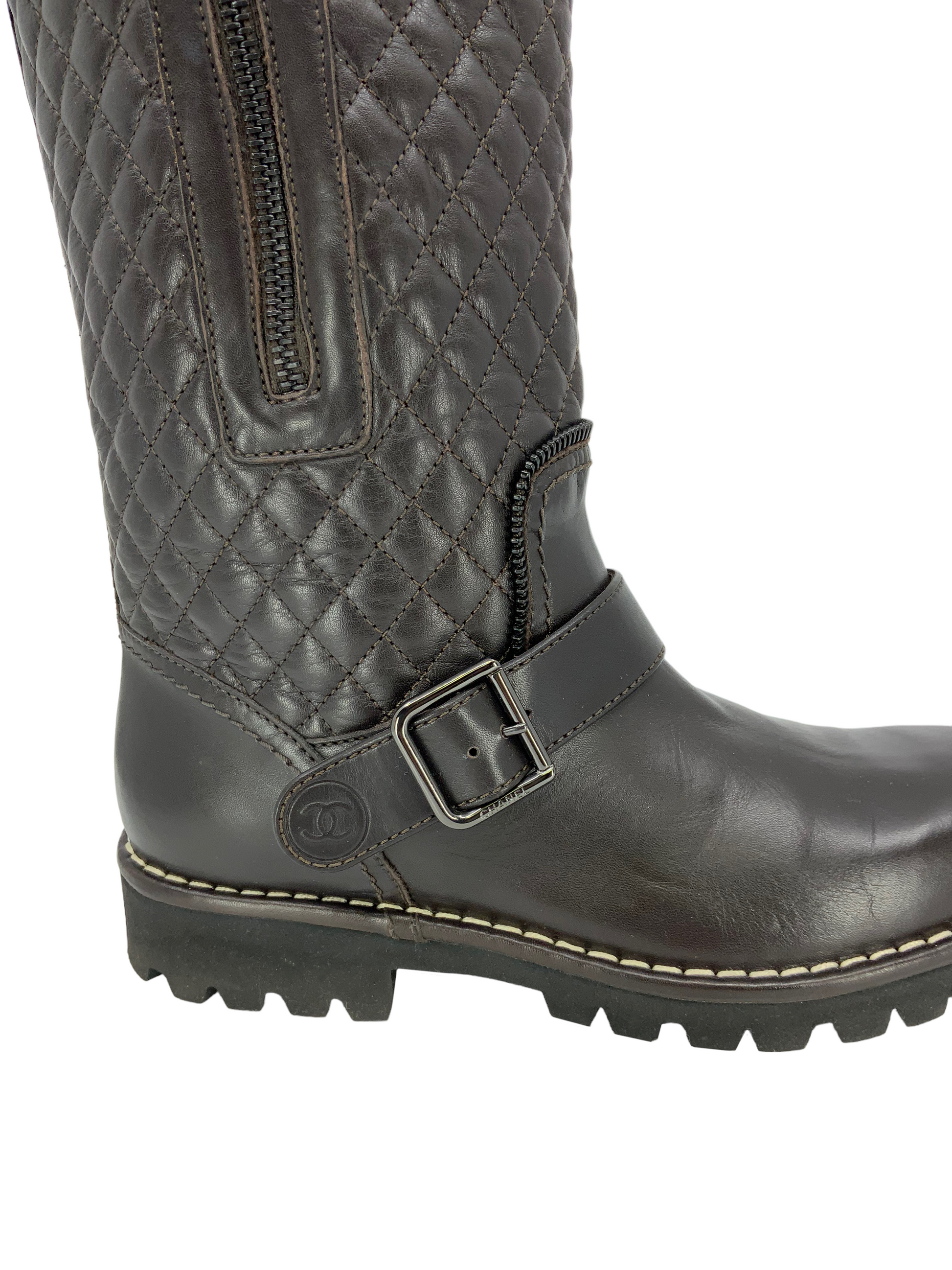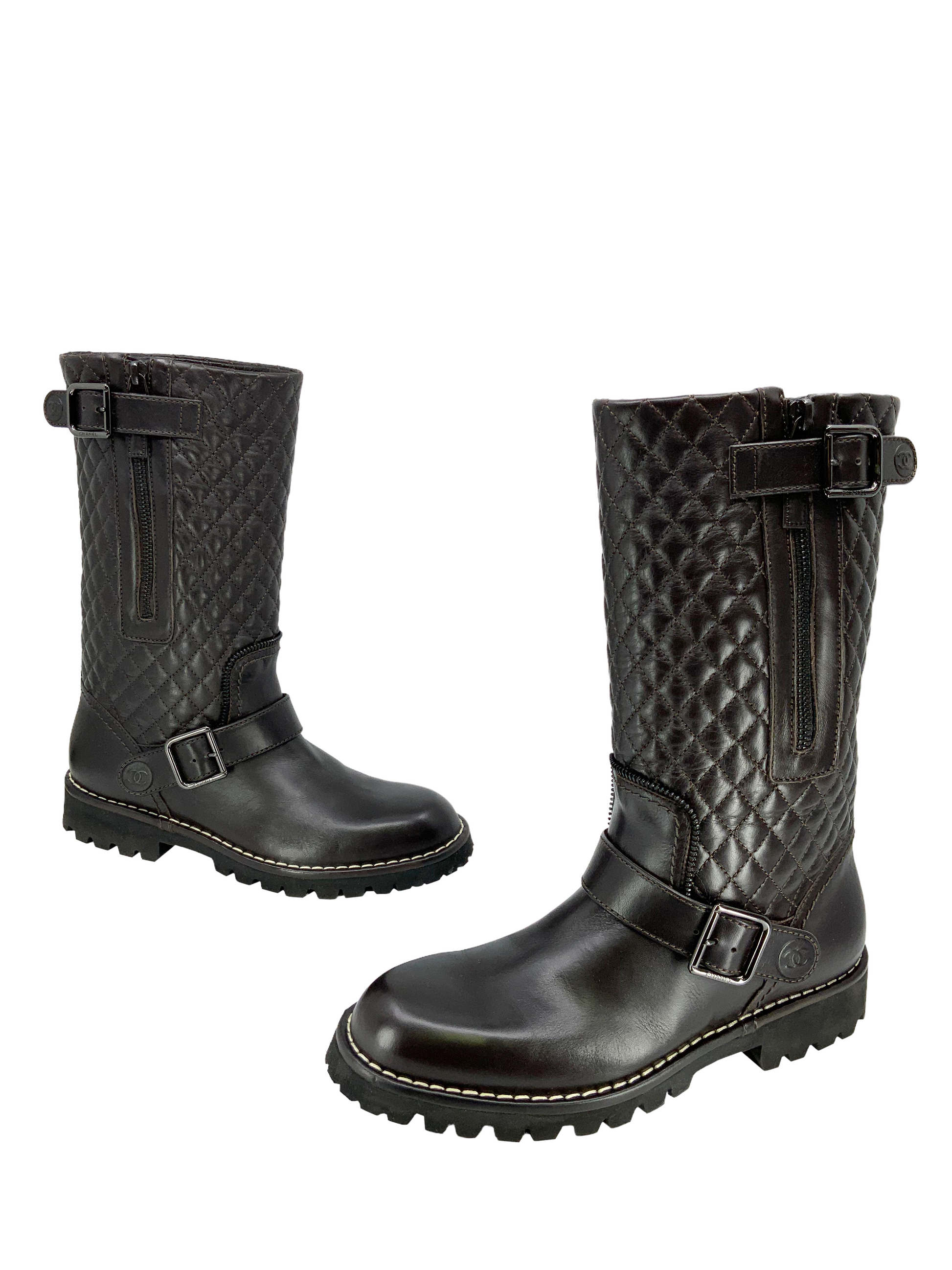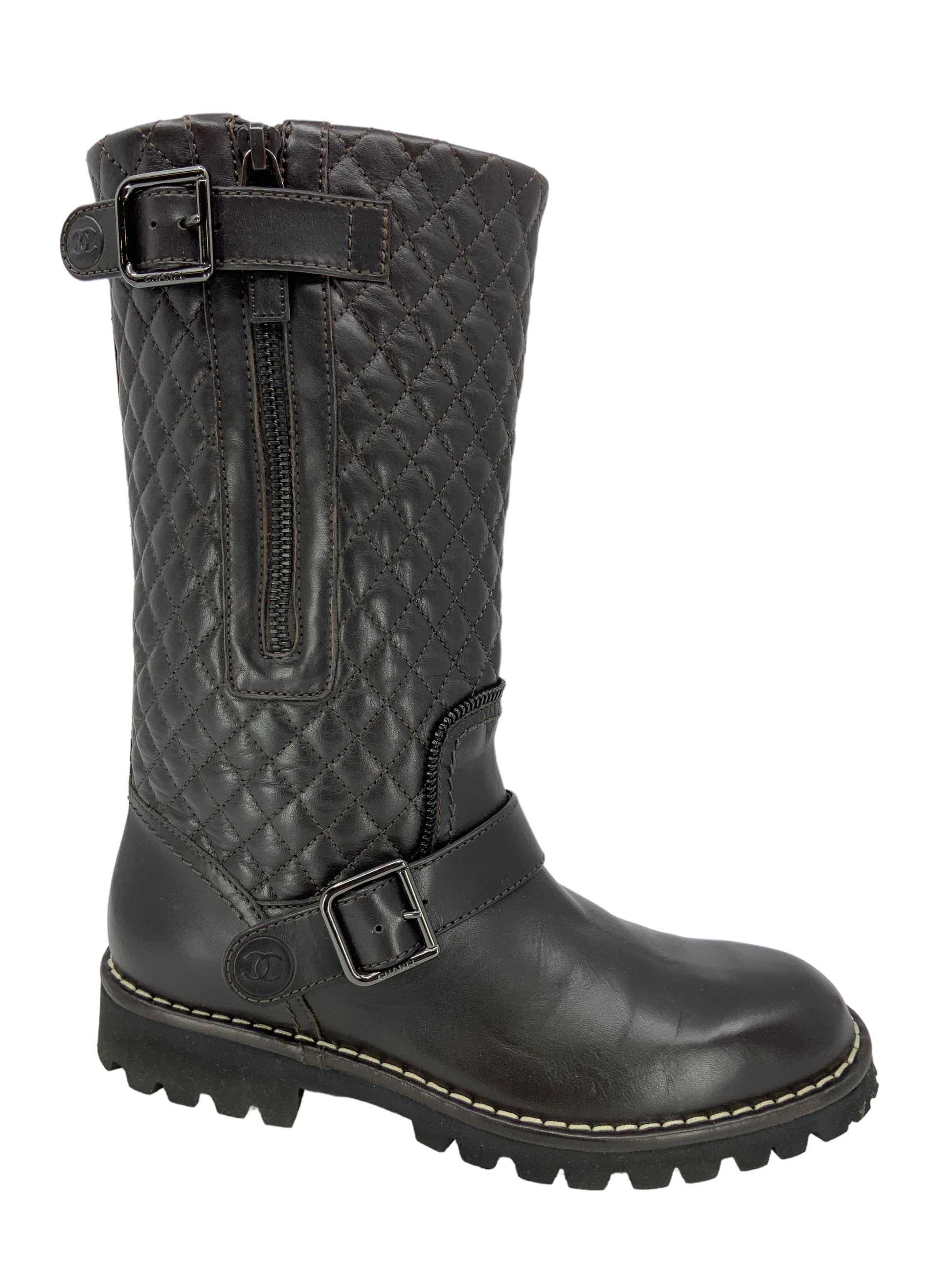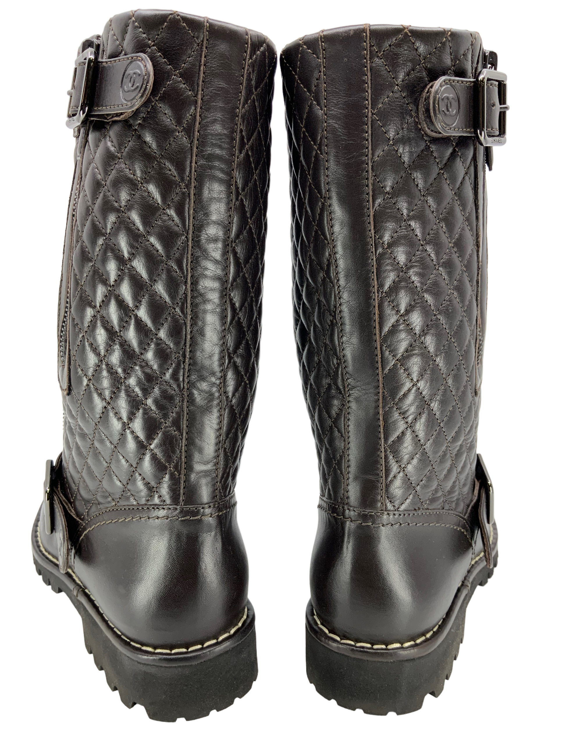 Chanel Quilted Leather Mid Calf Boots Size 7 (IT 37) crafted from brown quilted leather with a round toe. Featuring tonal stitching, rubber soles and buckle and zip closures at the sides.