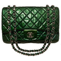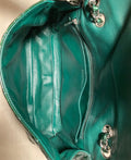 Metallic green quilted patent leather exterior trimmed with silver hardware and signature woven chain and leather shoulder strap.