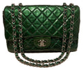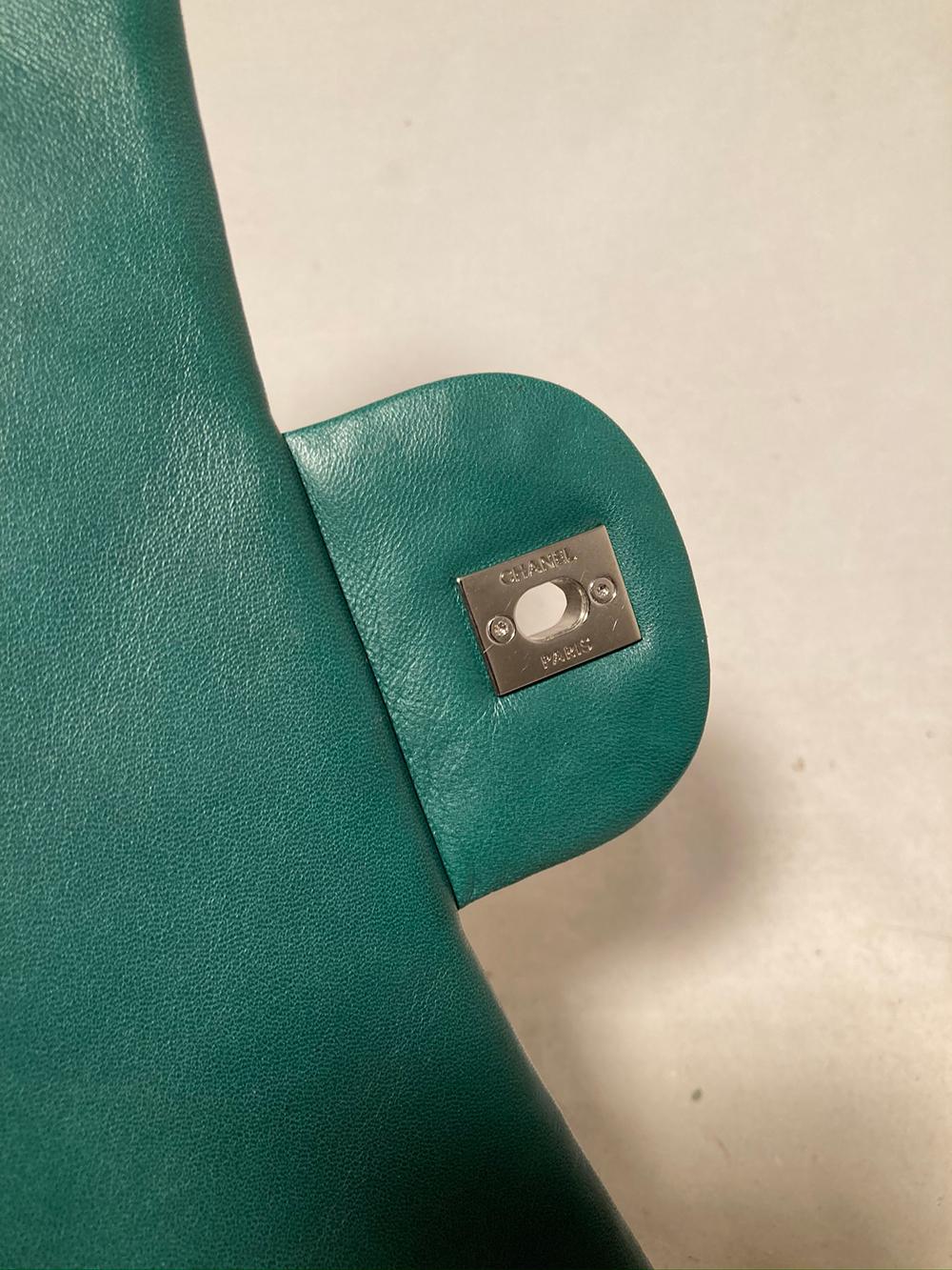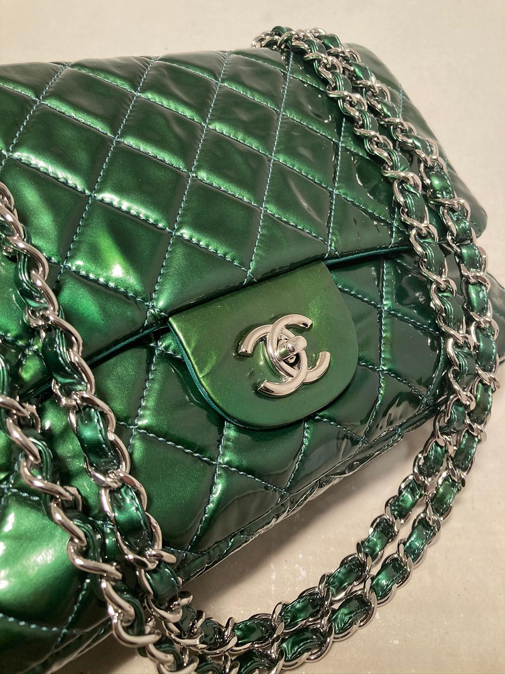 CHANEL RARE Metallic Green Patent Leather Jumbo Classic Flap