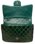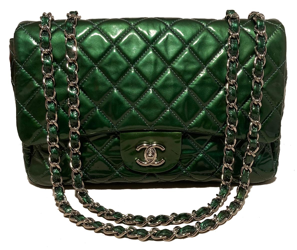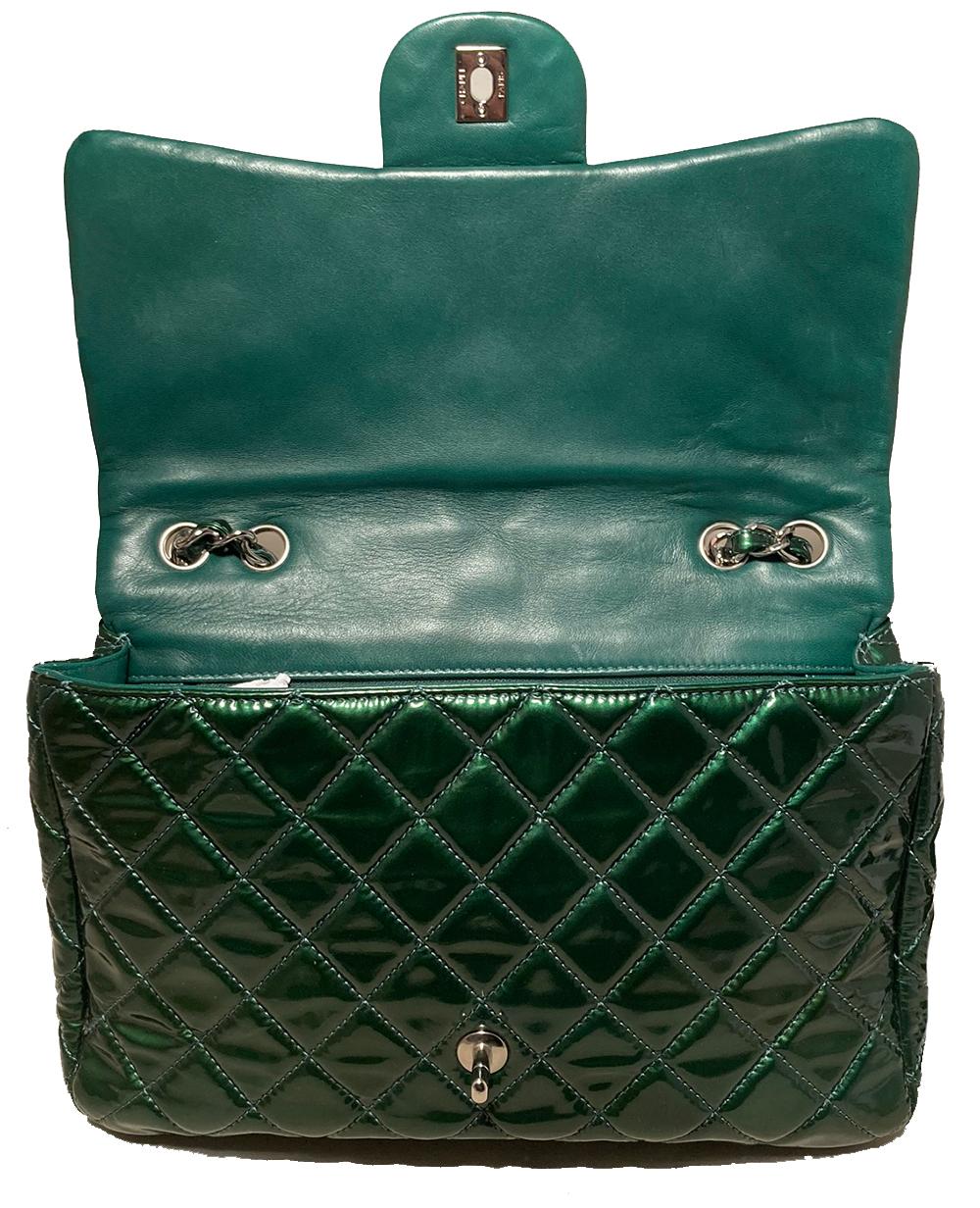 Chanel Metallic Green Patent Leather Jumbo Classic Flap in excellent condition.