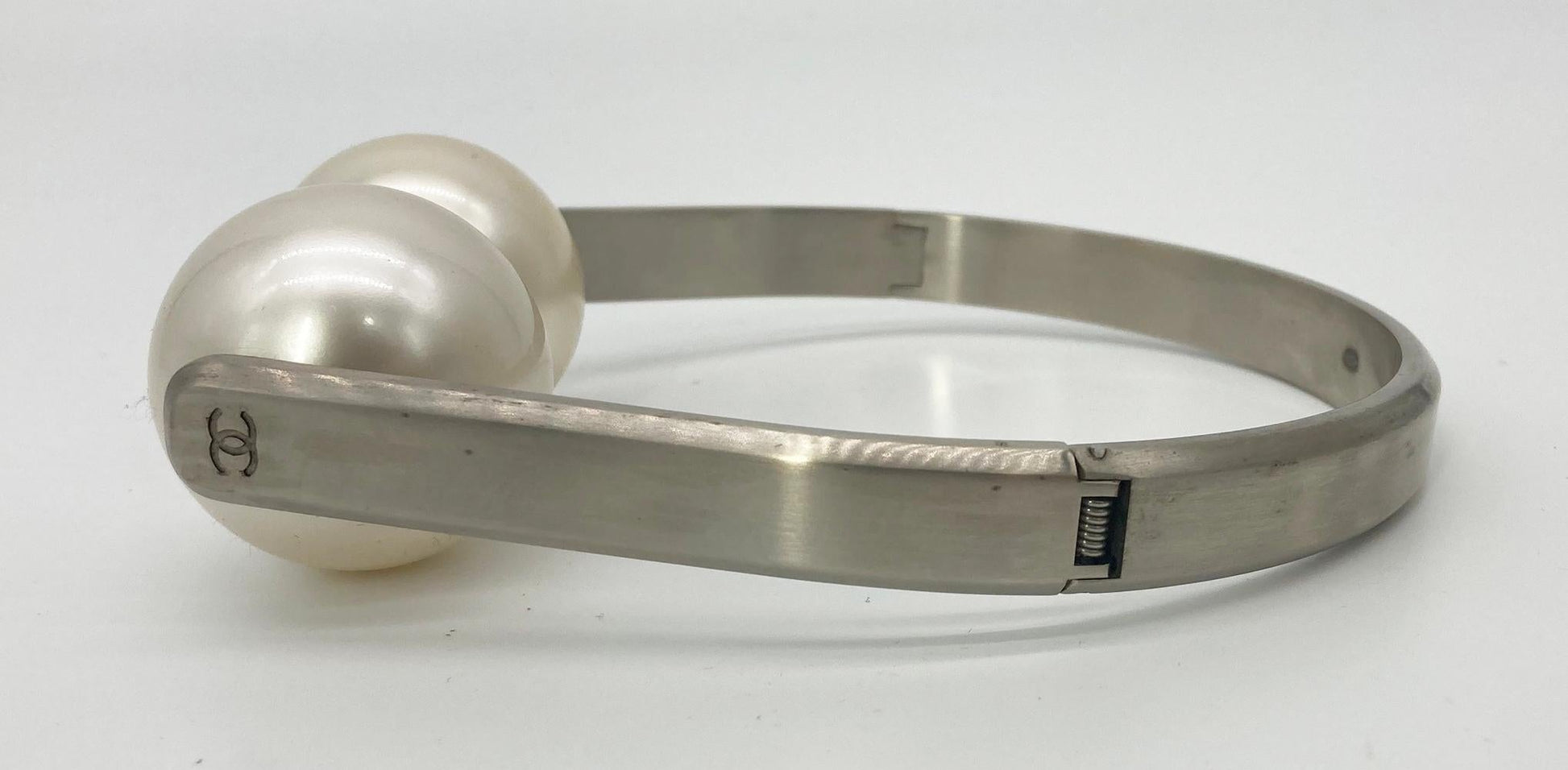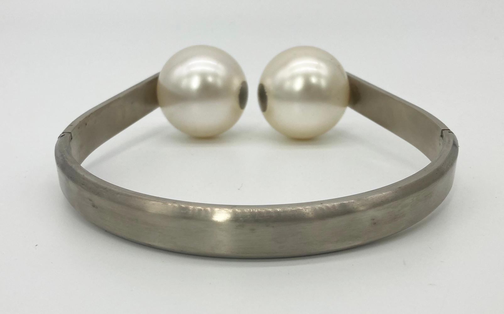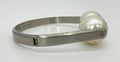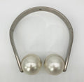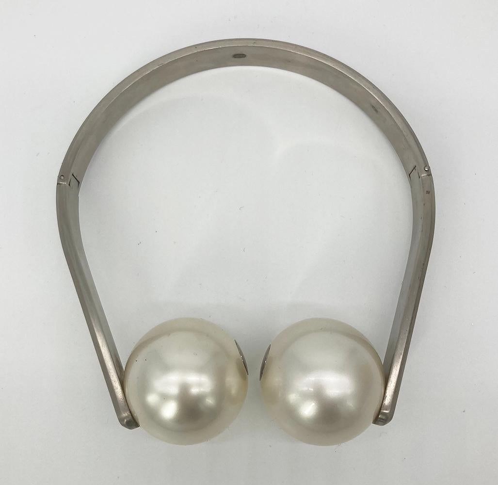 Two large pearls at either end, brushed silver hardware, hinged closure design.