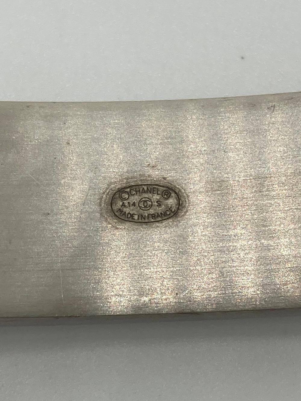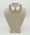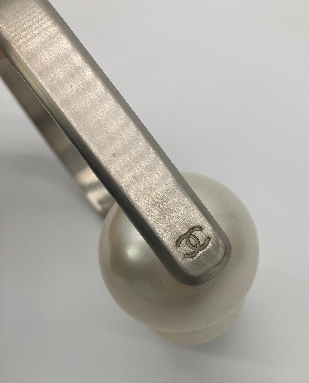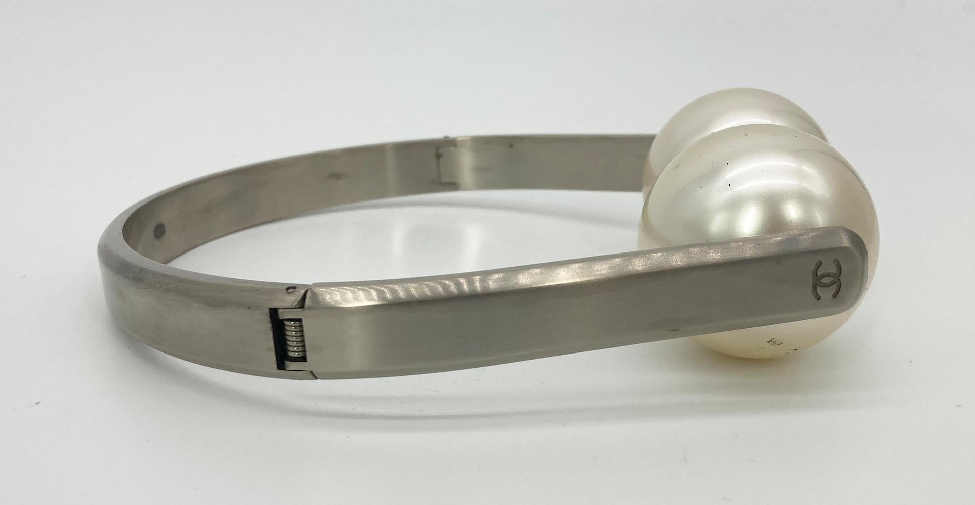Two large pearls at either end, brushed silver hardware, hinged closure design.
