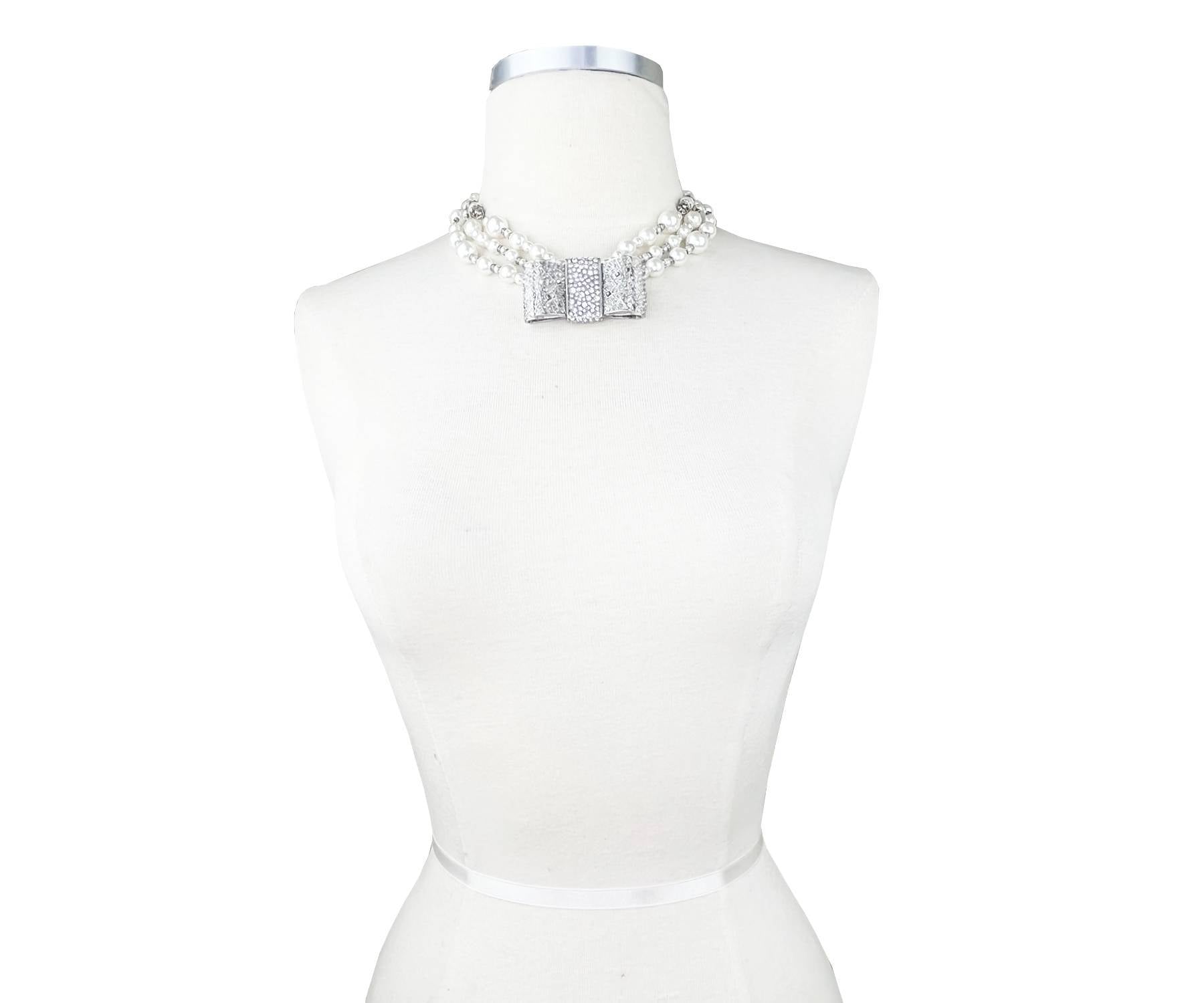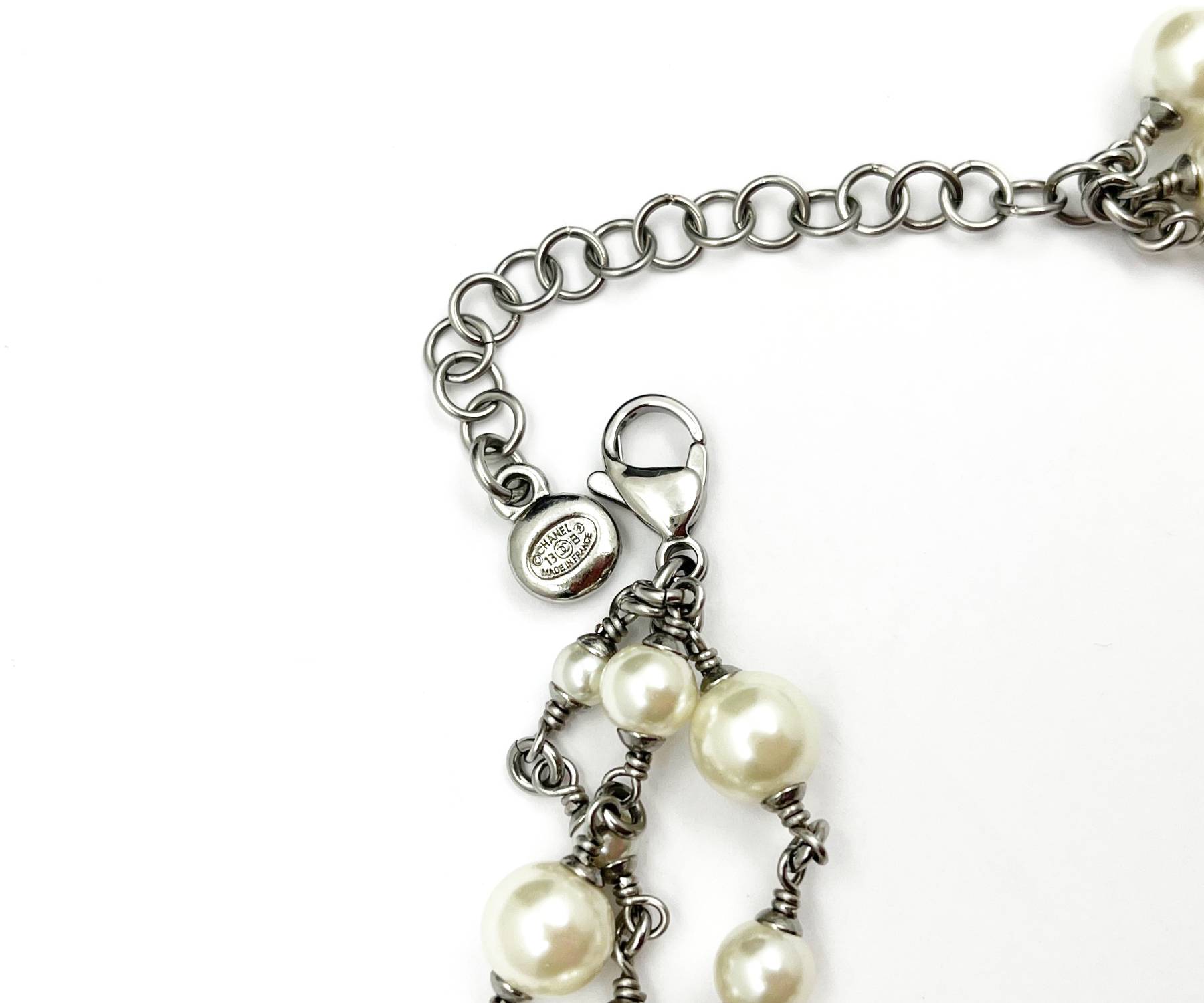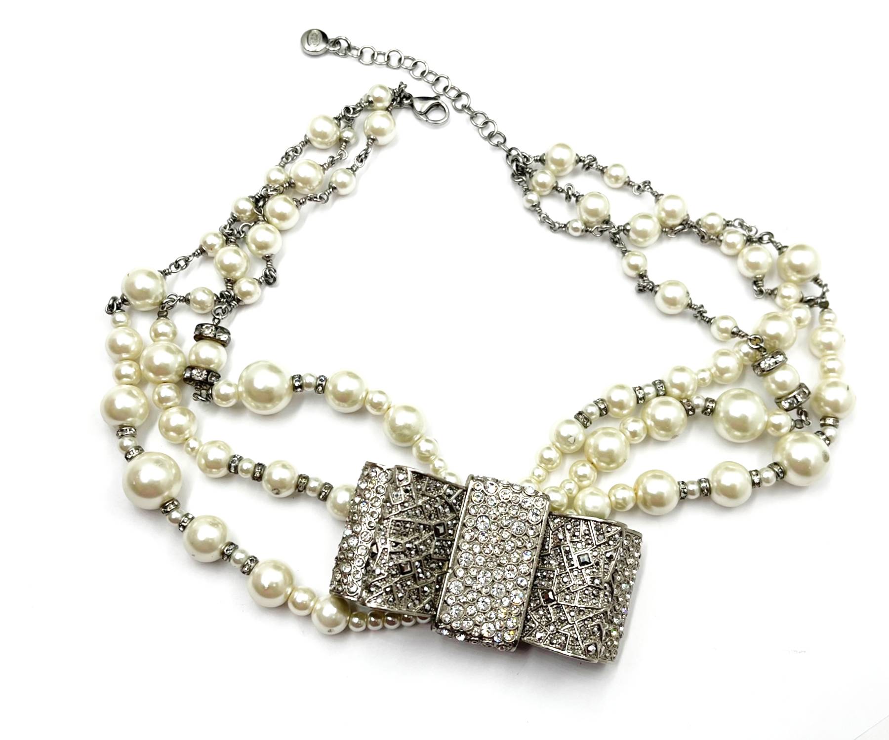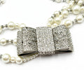 Chanel Rare Silver Large Bow Crystal 3 Strand Pearl Necklace.