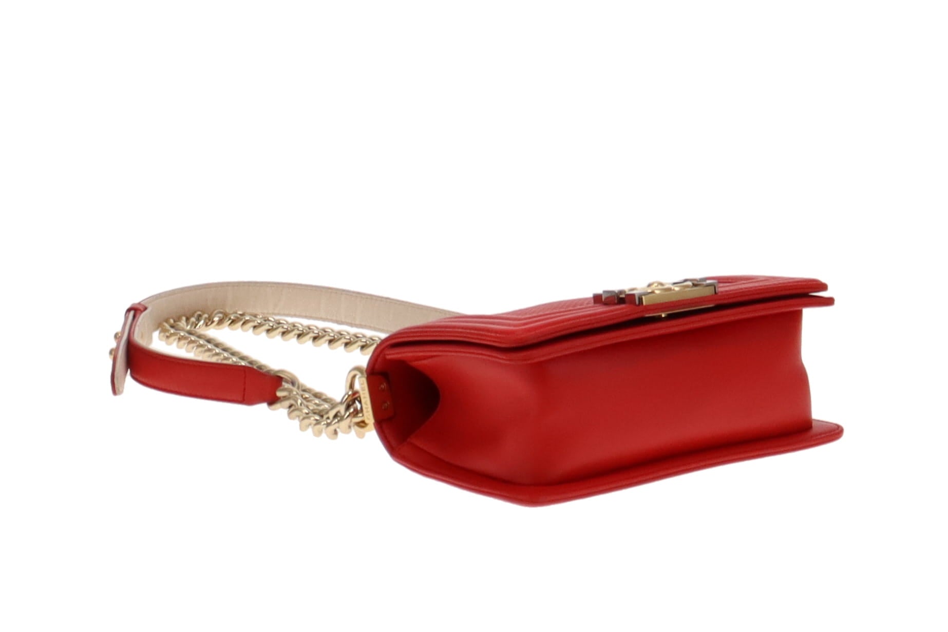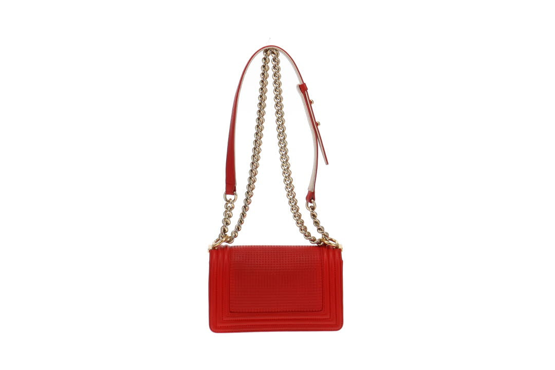 "Step up your fashion game with the Chanel Red Cube Embossed Leather Small Boy Bag from 2013/14. Made with high-quality leather, this bag features a unique cube embossed design and a playful play on words in its name. Make a statement and stand out from the crowd with this quirky and stylish bag!"