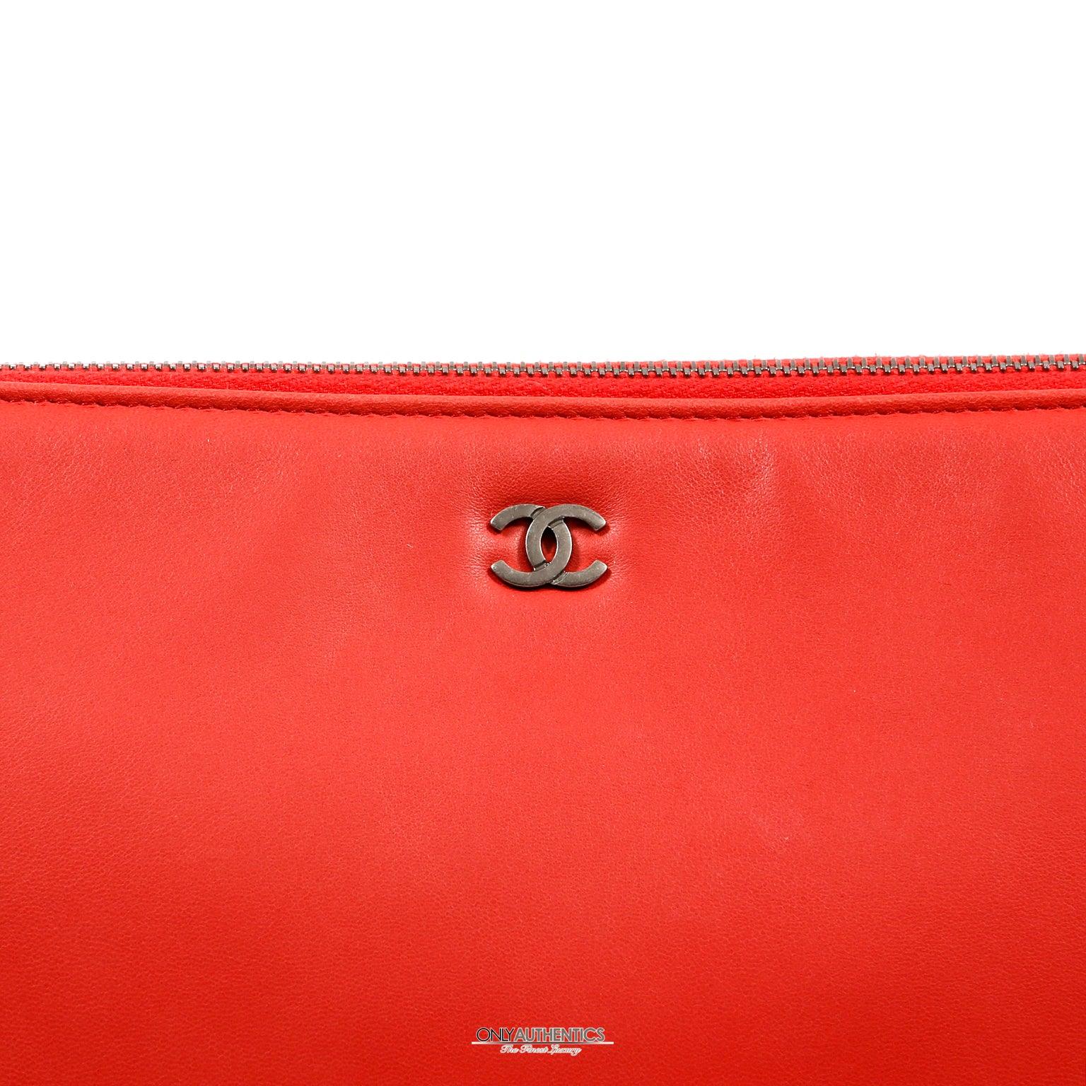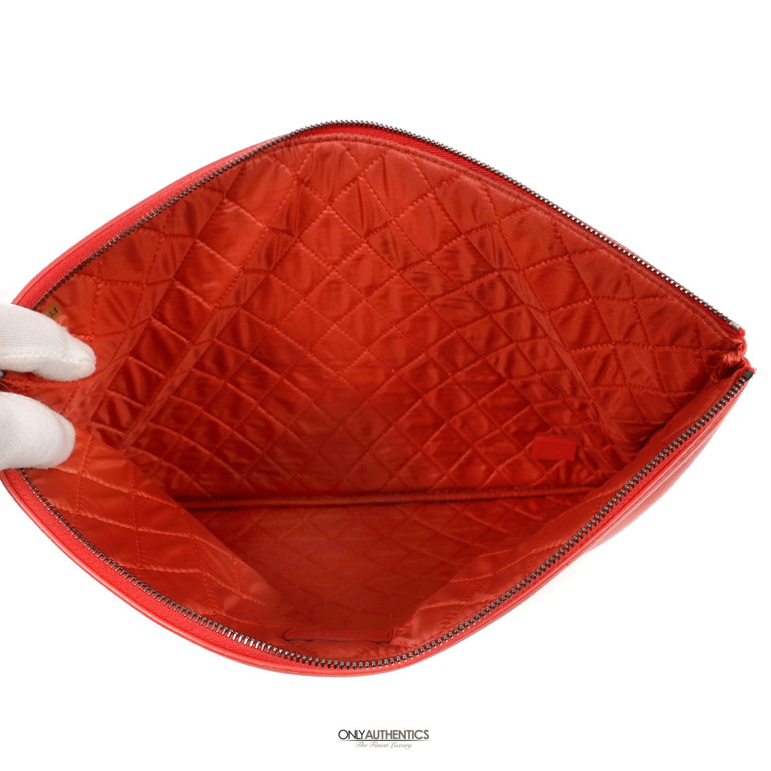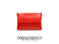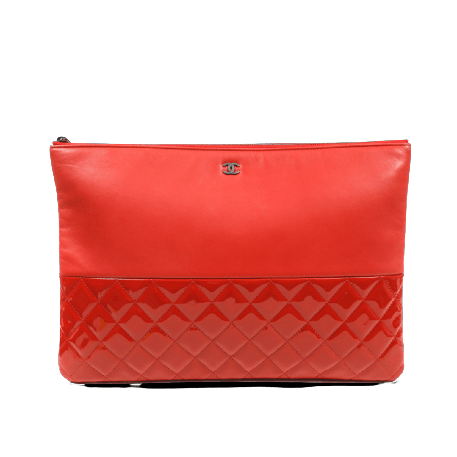 This Chanel Red Lambskin and Patent Leather Clutch is in excellent condition. The simple silhouette gets a boost with a mixed texture and fiery red color.