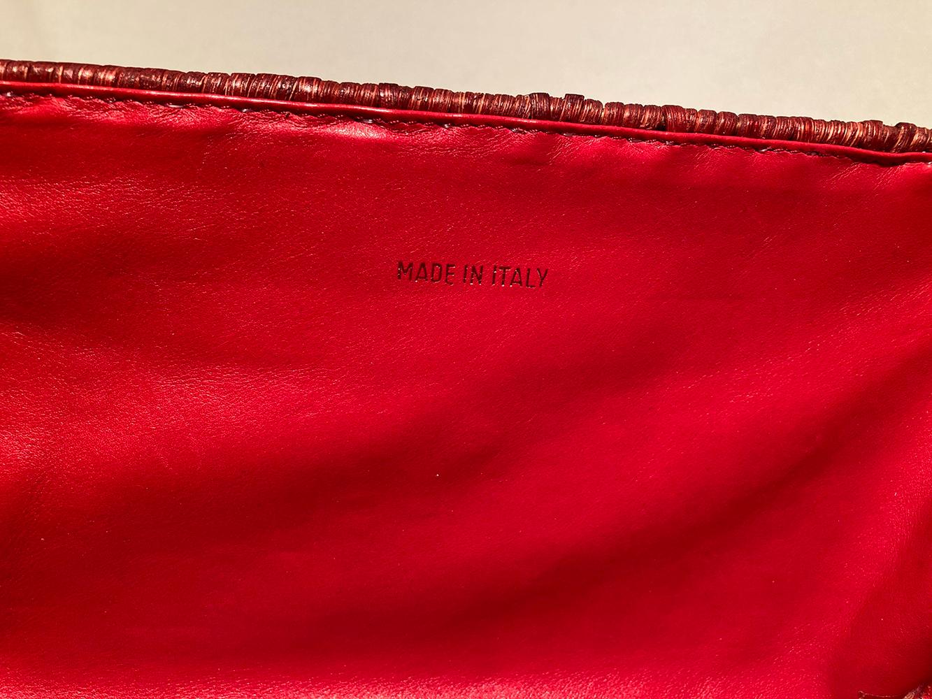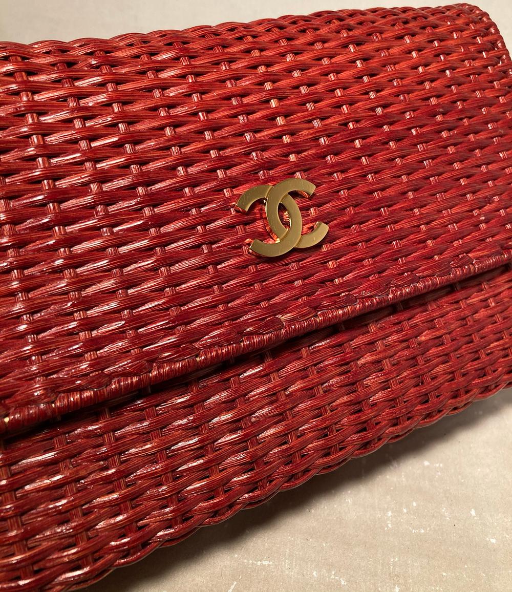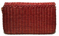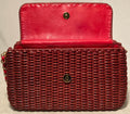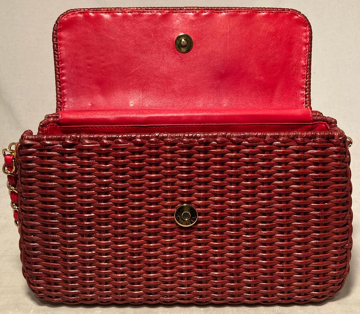 Red wicker exterior trimmed with gold hardware and signature red leather and chain woven shoulder strap.