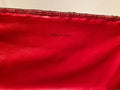 Front top flap magnetic snap closure opens to a red leather lined interior with one side slit pocket.