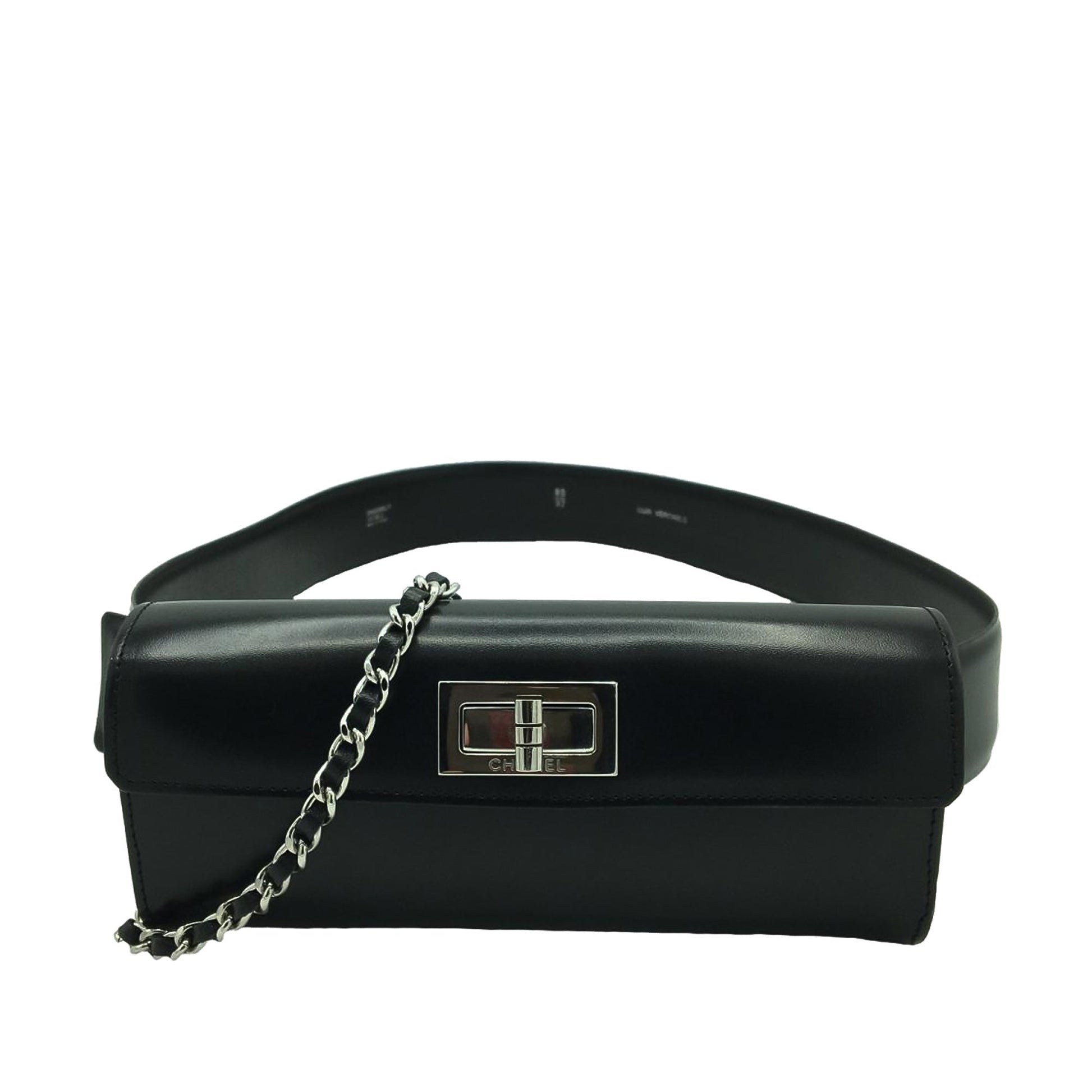 Chanel Reissue Leather Belt Bag Black. This belt bag features a leather body, a flat waist strap, a top flap with turn lock closure, and interior zip and slip compartments.
