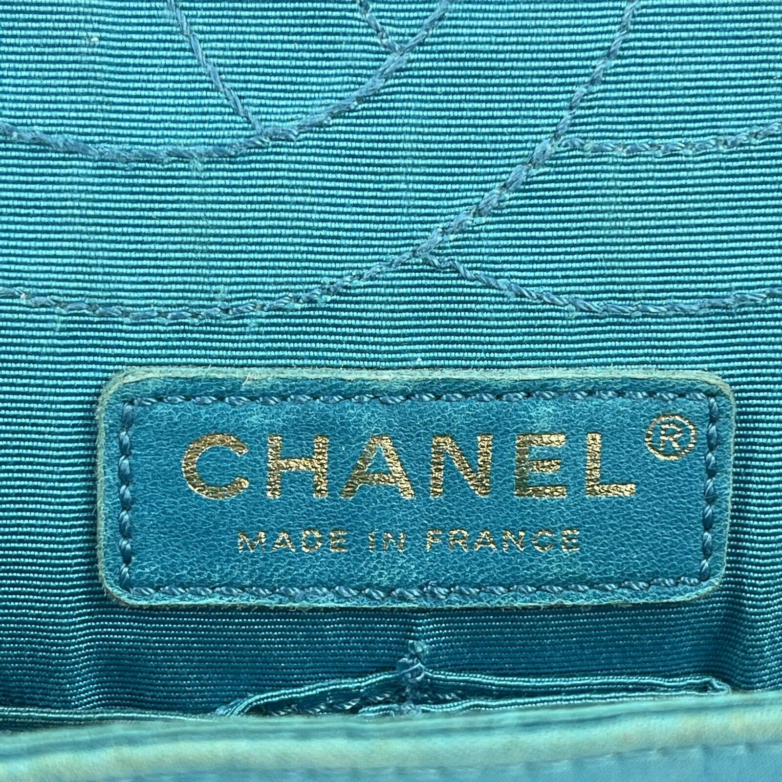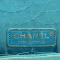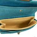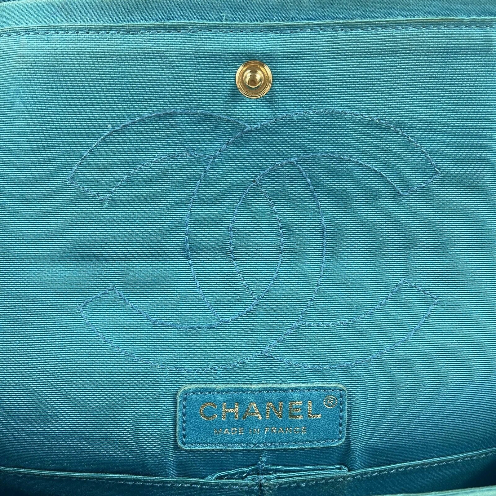 * The front flap opens using a turn-lock that is engraved "CHANEL" to a matching turquoise satin lined zipper pocket, slip pocket, and another flap that contains a mirror.