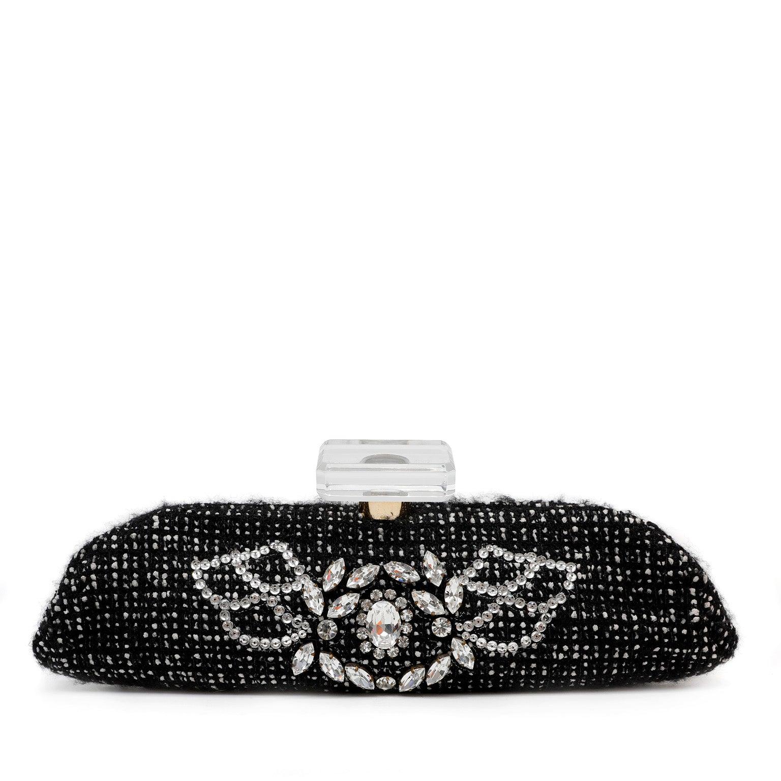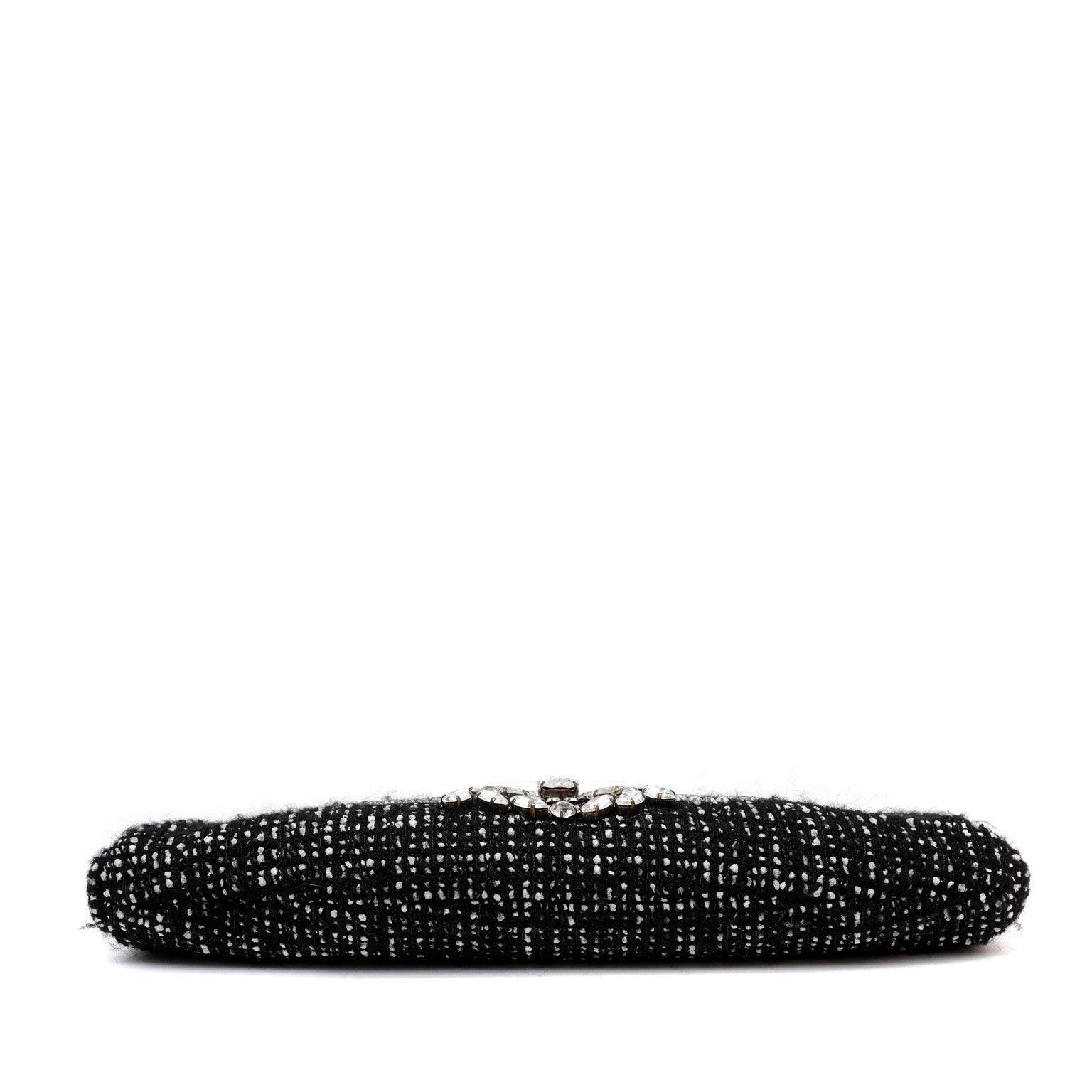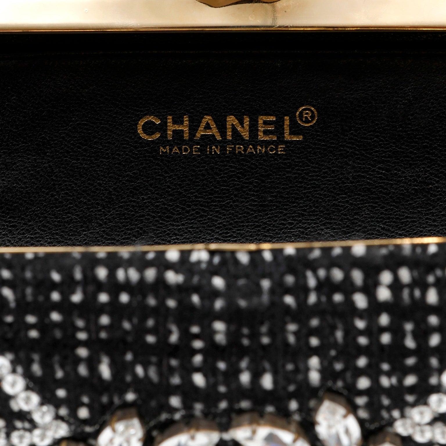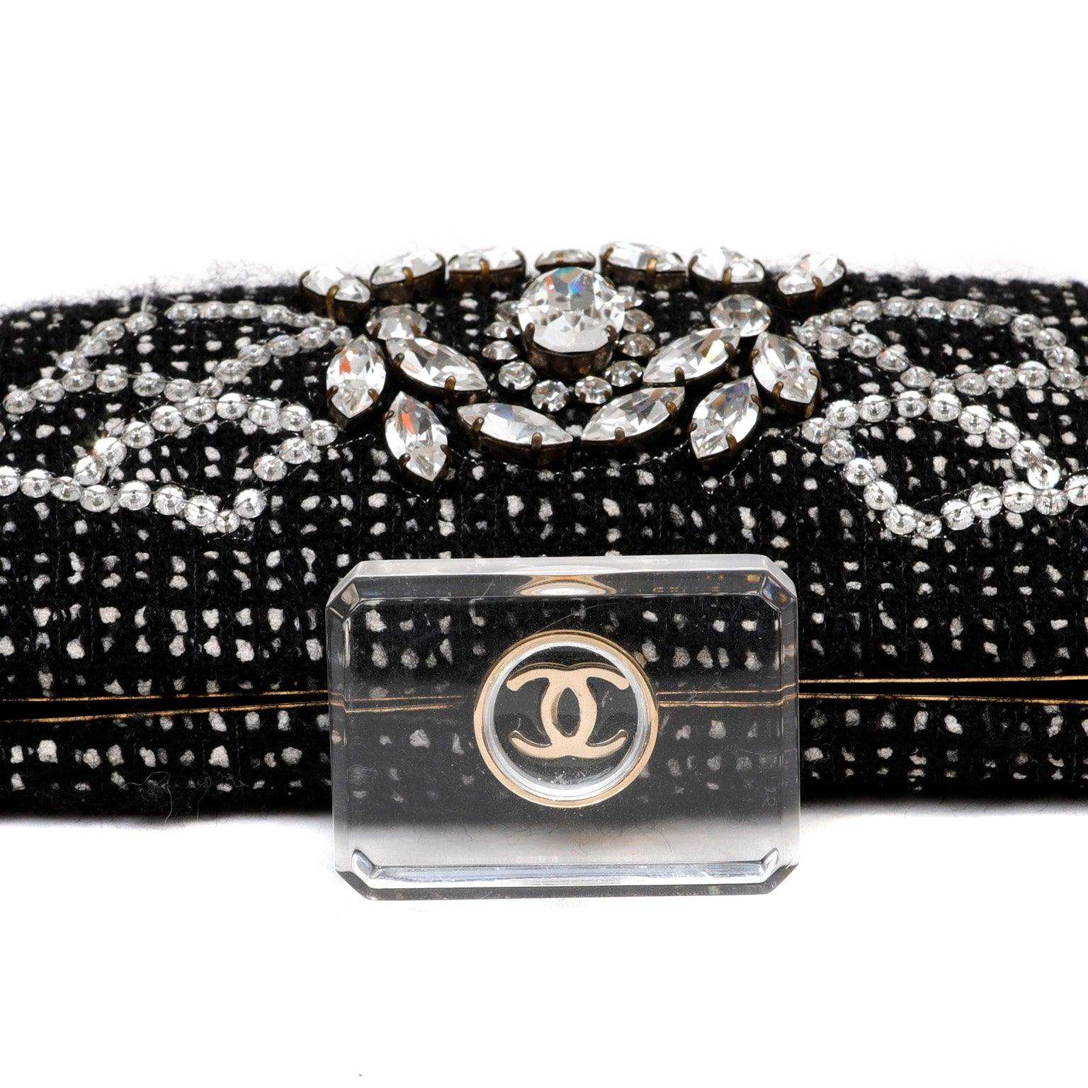 This Chanel Black Tweed and Rhinestone Runway Clutch is in pristine condition. Enhanced with ornate crystals and a Lucite clasp, this spectacular piece from the 1990’s is a fantastic addition to any sophisticated collection. Black and white tweed wool blend is adorned with intricate crystal and rhinestone decoration. Gold framed top is capped with a clear Lucite kiss lock clasp evoking a perfume bottle stopper. Black leather interior. Made in France. Chanel dust bag included.
