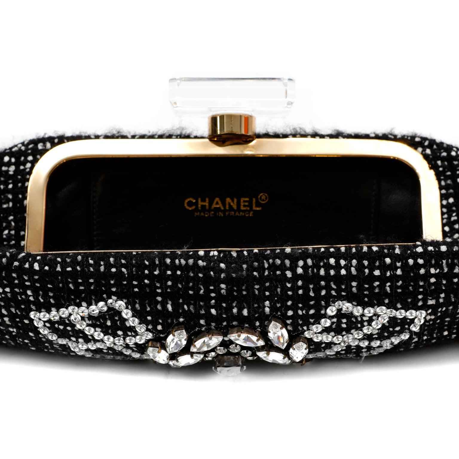 Chanel Runway 1990s Rhinestone Perfume Bottle Black Tweed/Leather Clutch