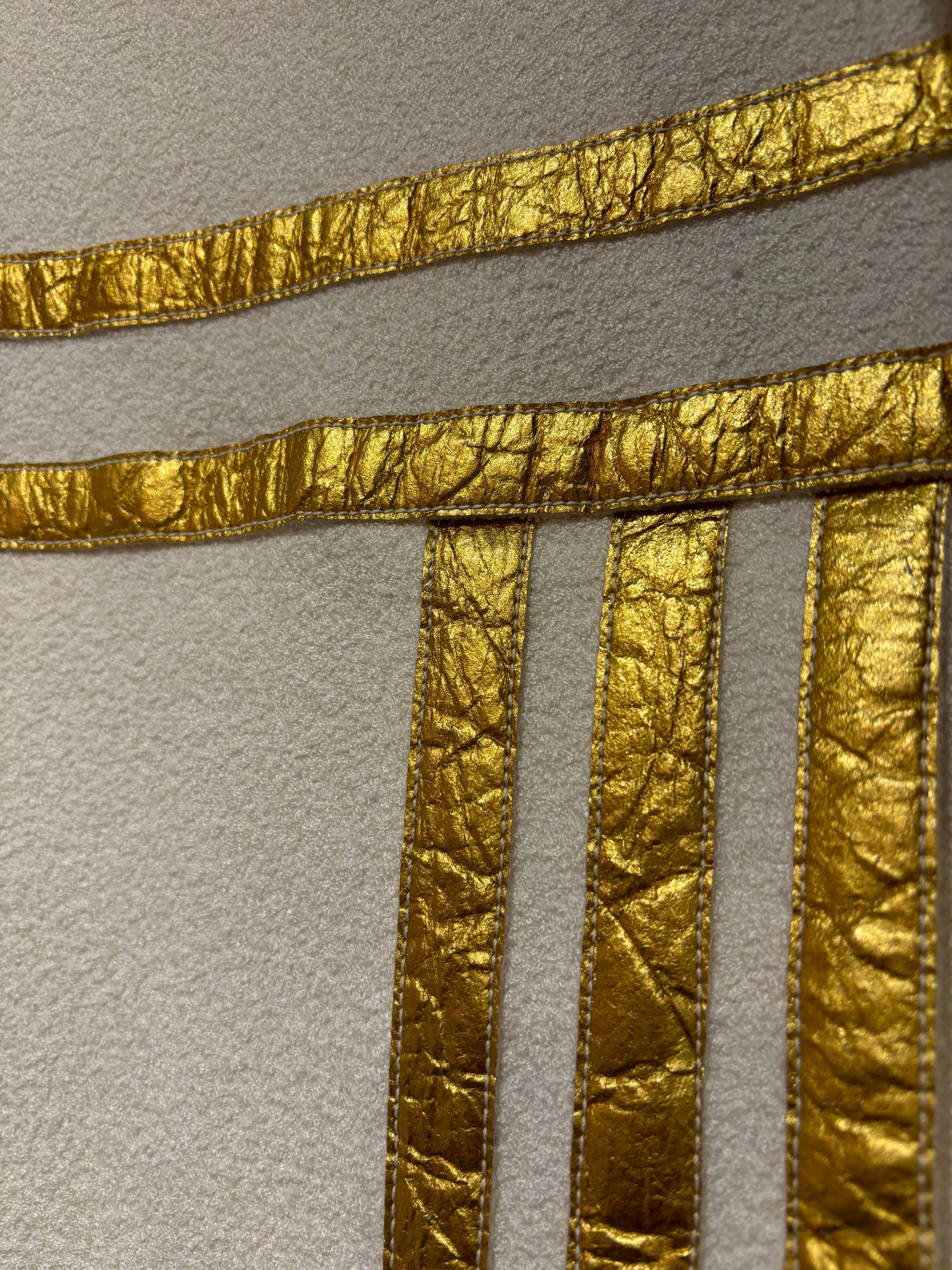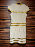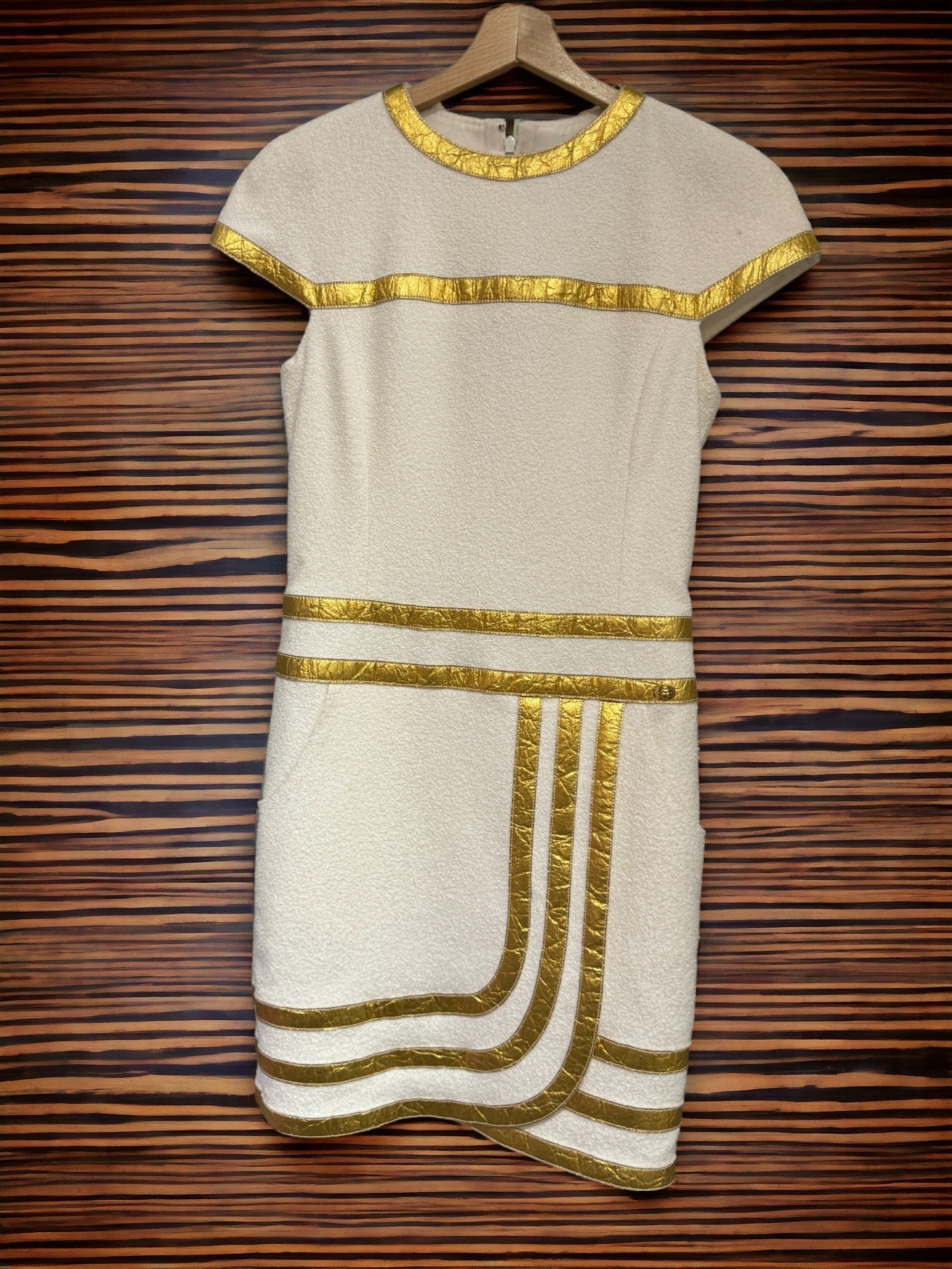 Profitez d'une robe élégante et luxueuse avec cette robe Chanel T34. En soie et coton, cette robe dispose également de finitions dorées en cuir végétal faites à partir de fibres d'ananas.