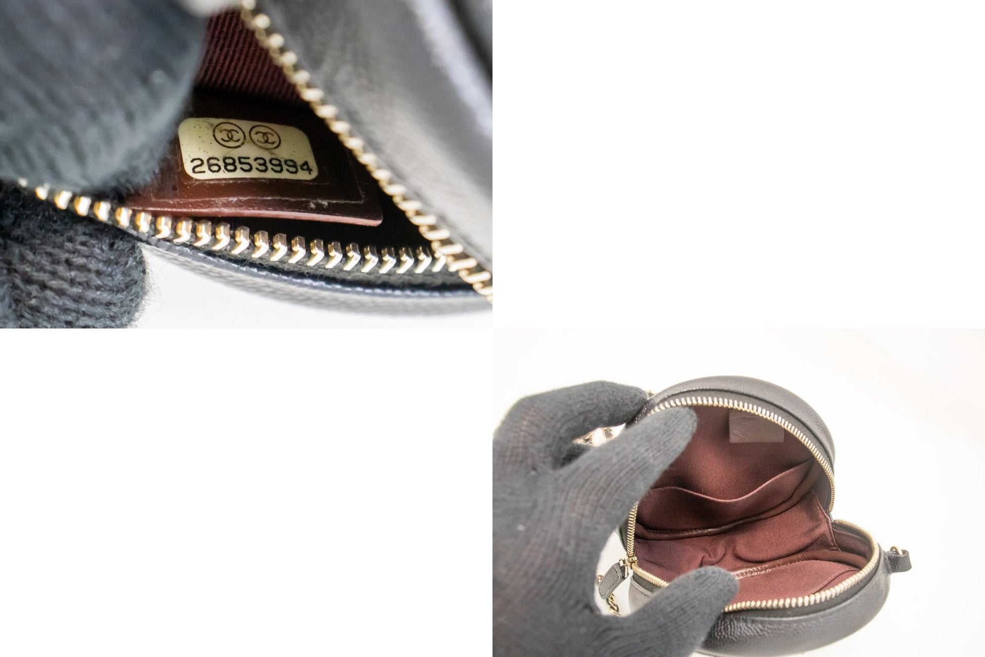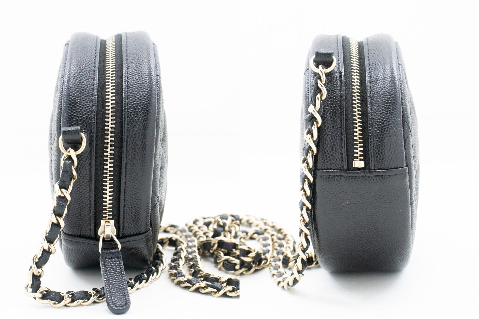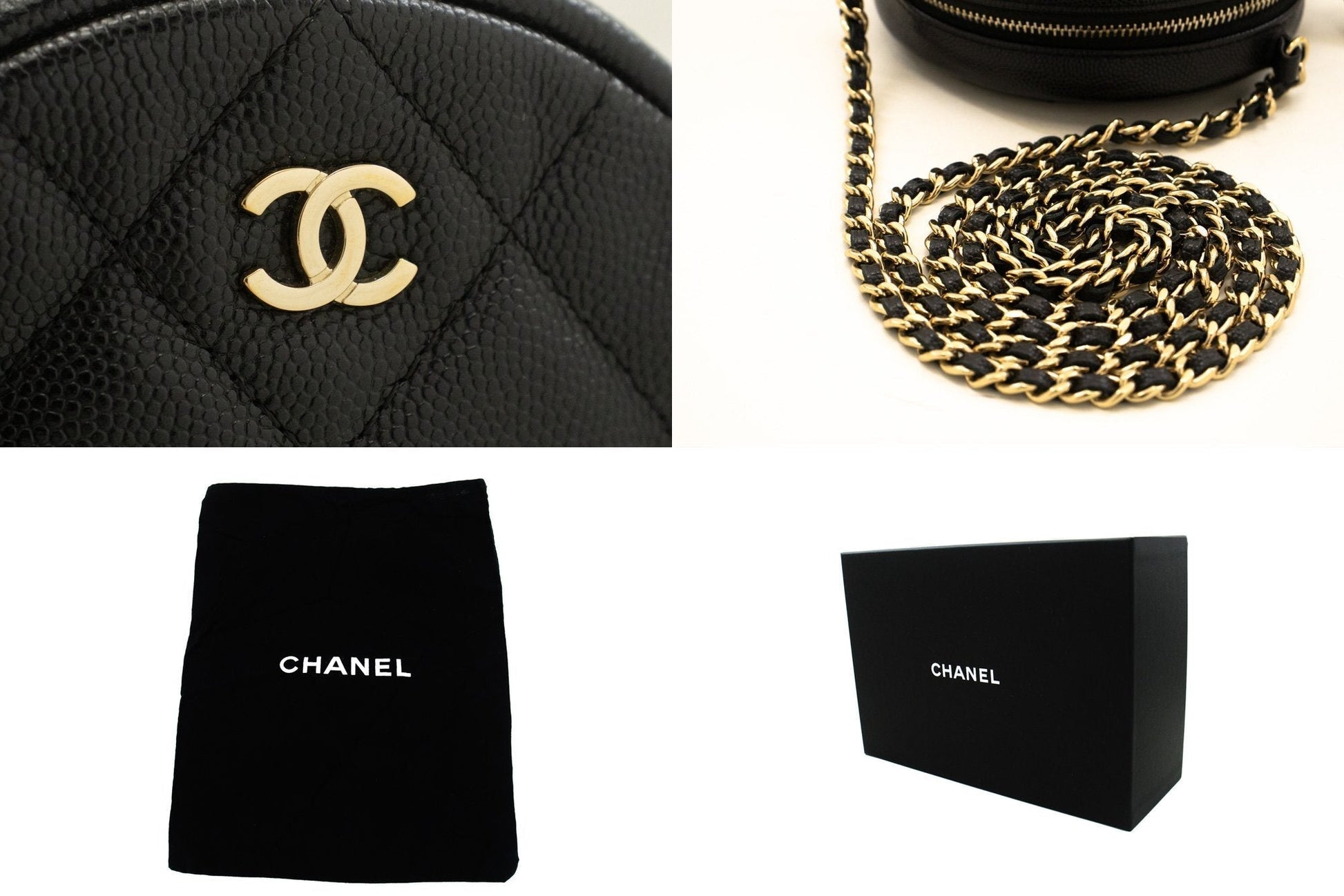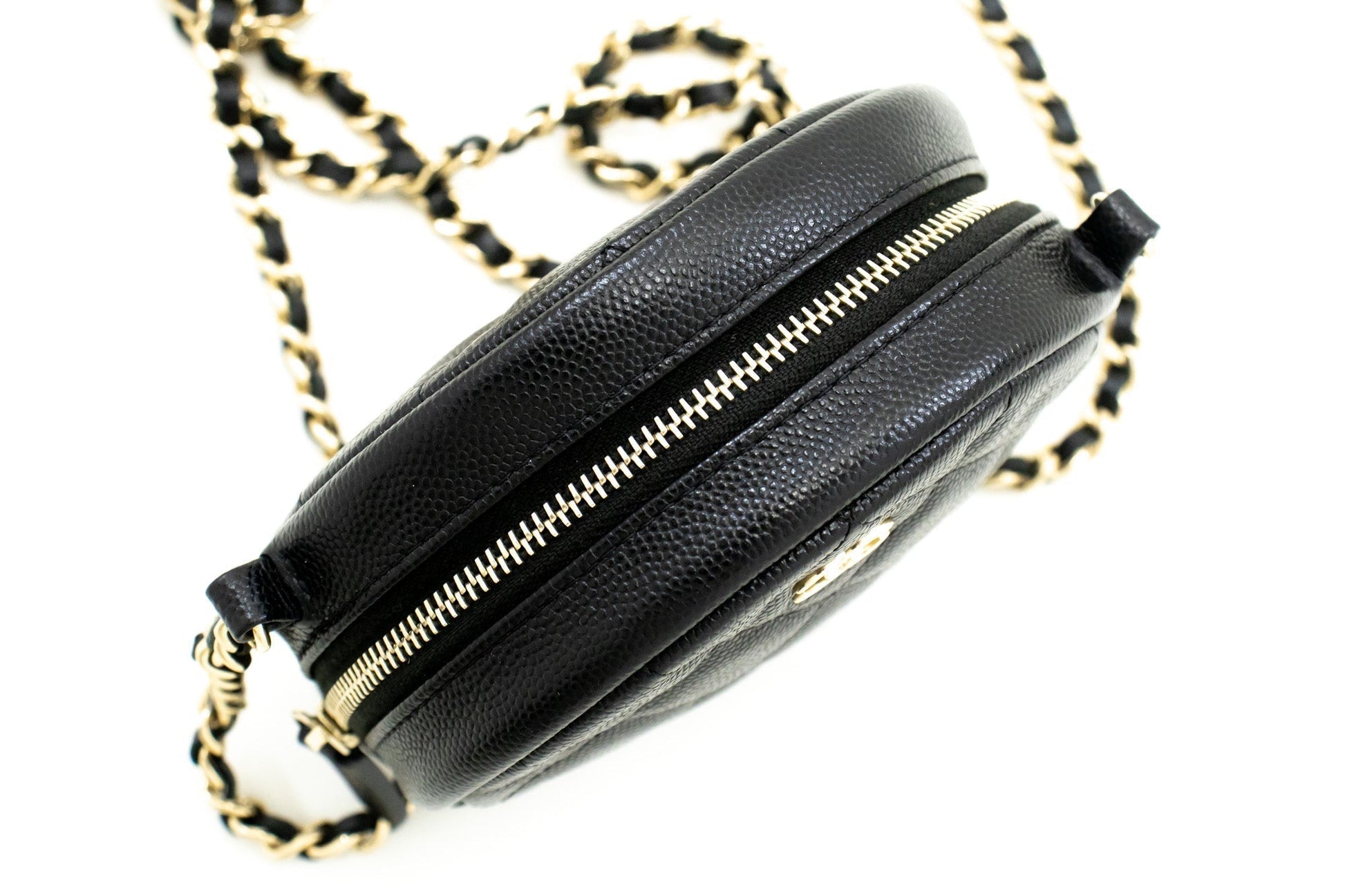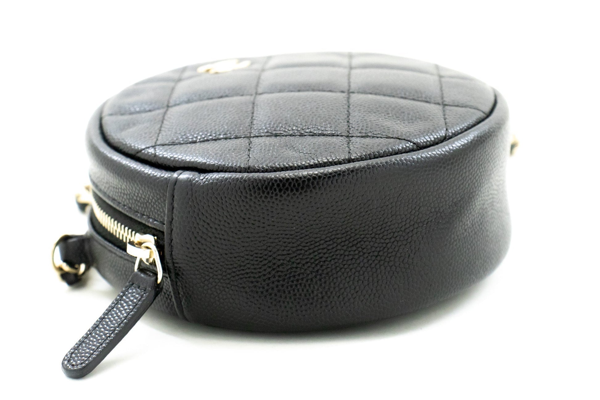An CHANEL Round Zip Caviar Small Chain Shoulder Bag Black Quilted.