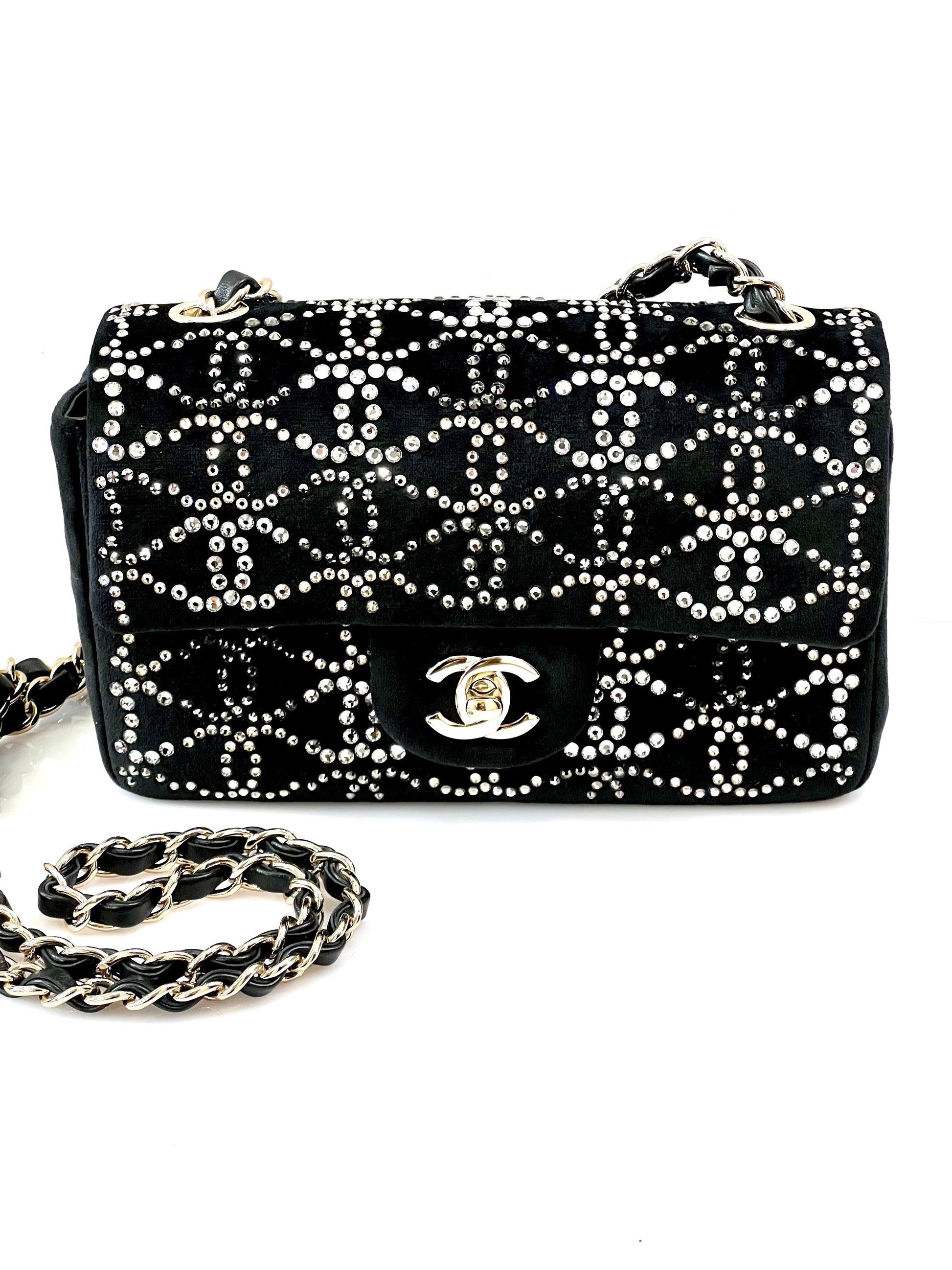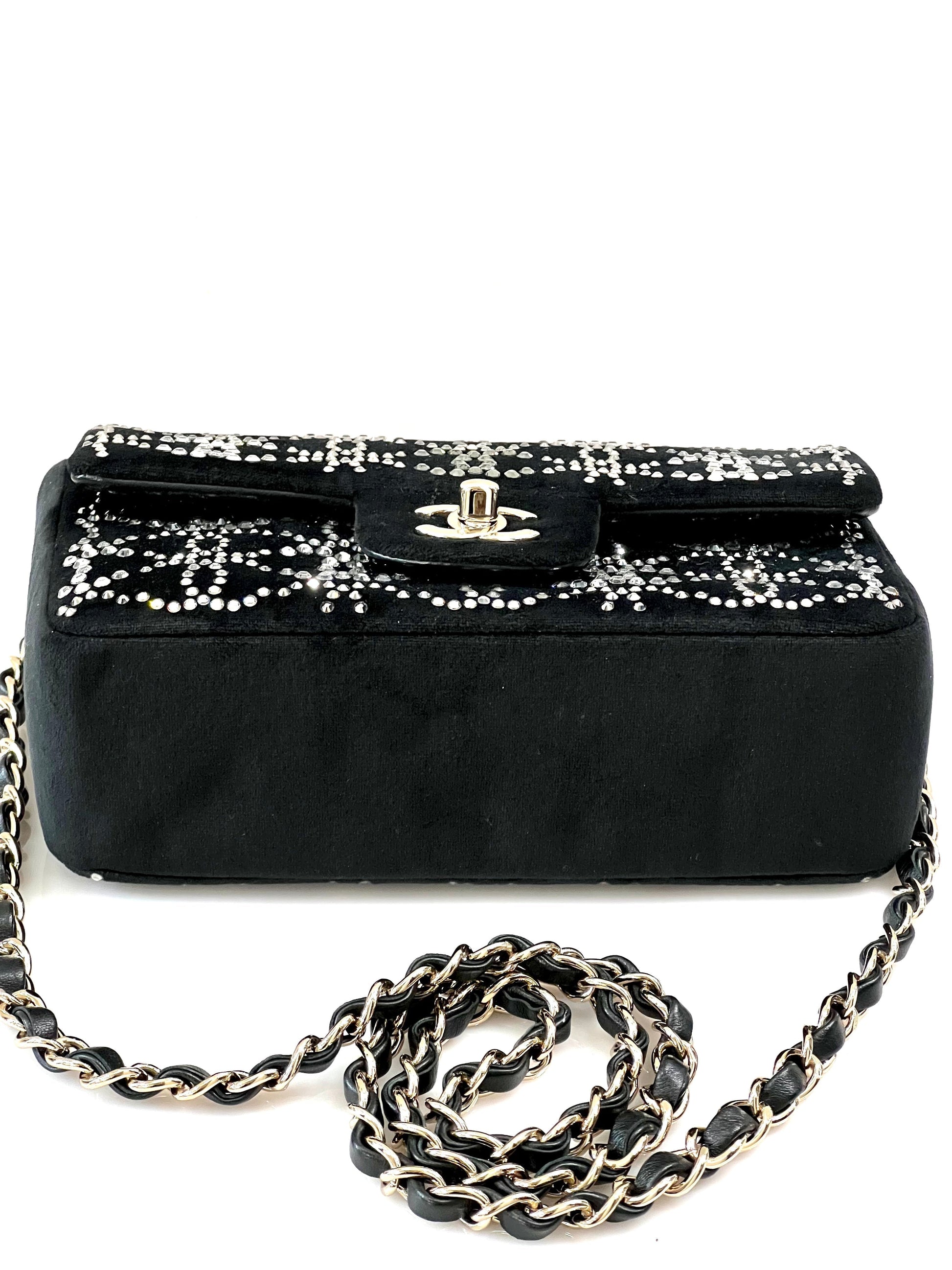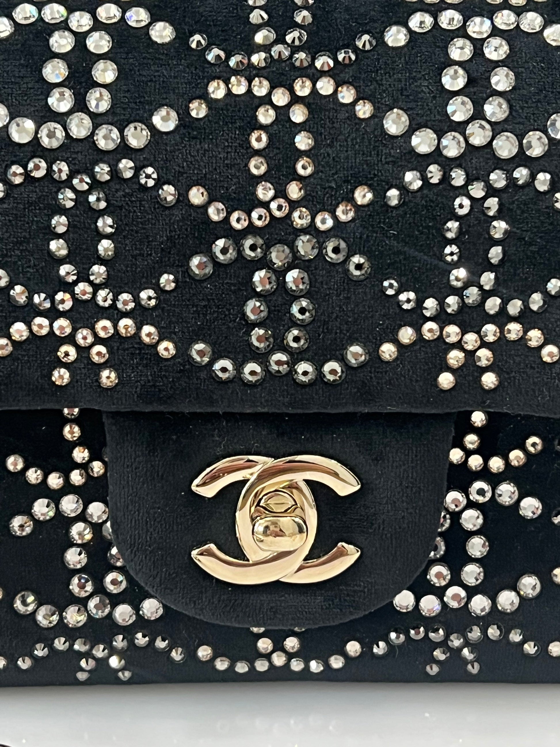 Chanel Black Velvet, Gold, Silver, Ruthenium Strass Crystal Embellished Rectangular Mini Classic Flap Gold Hardware, 2020