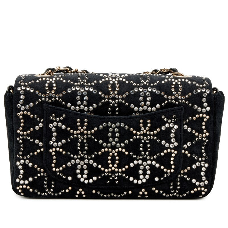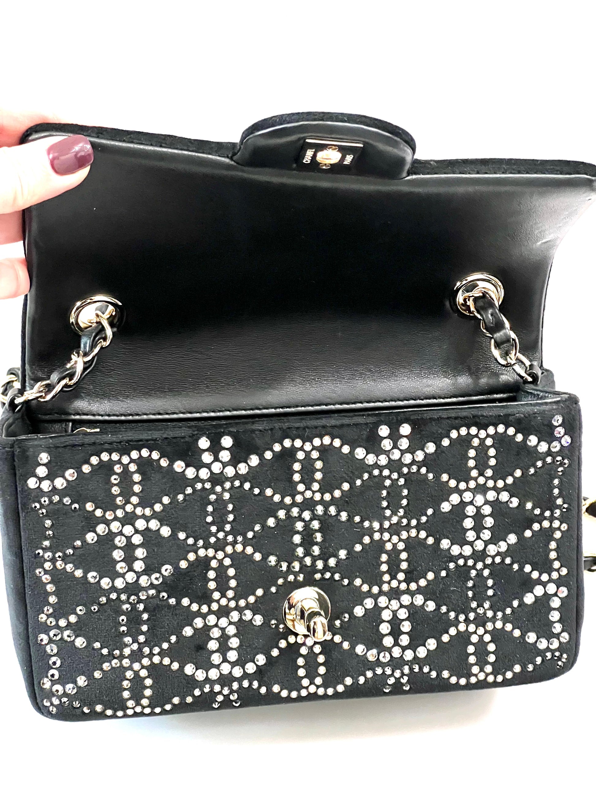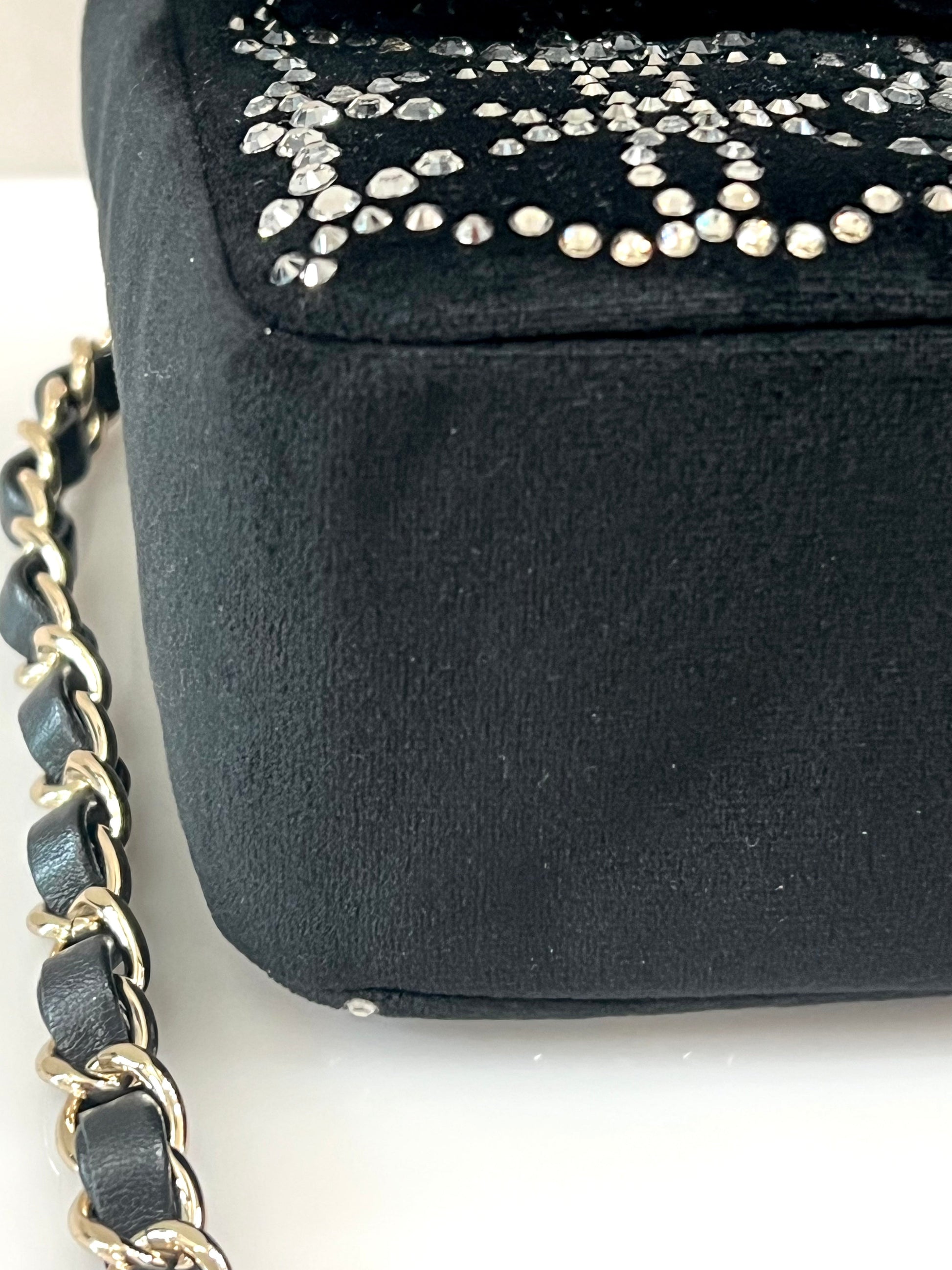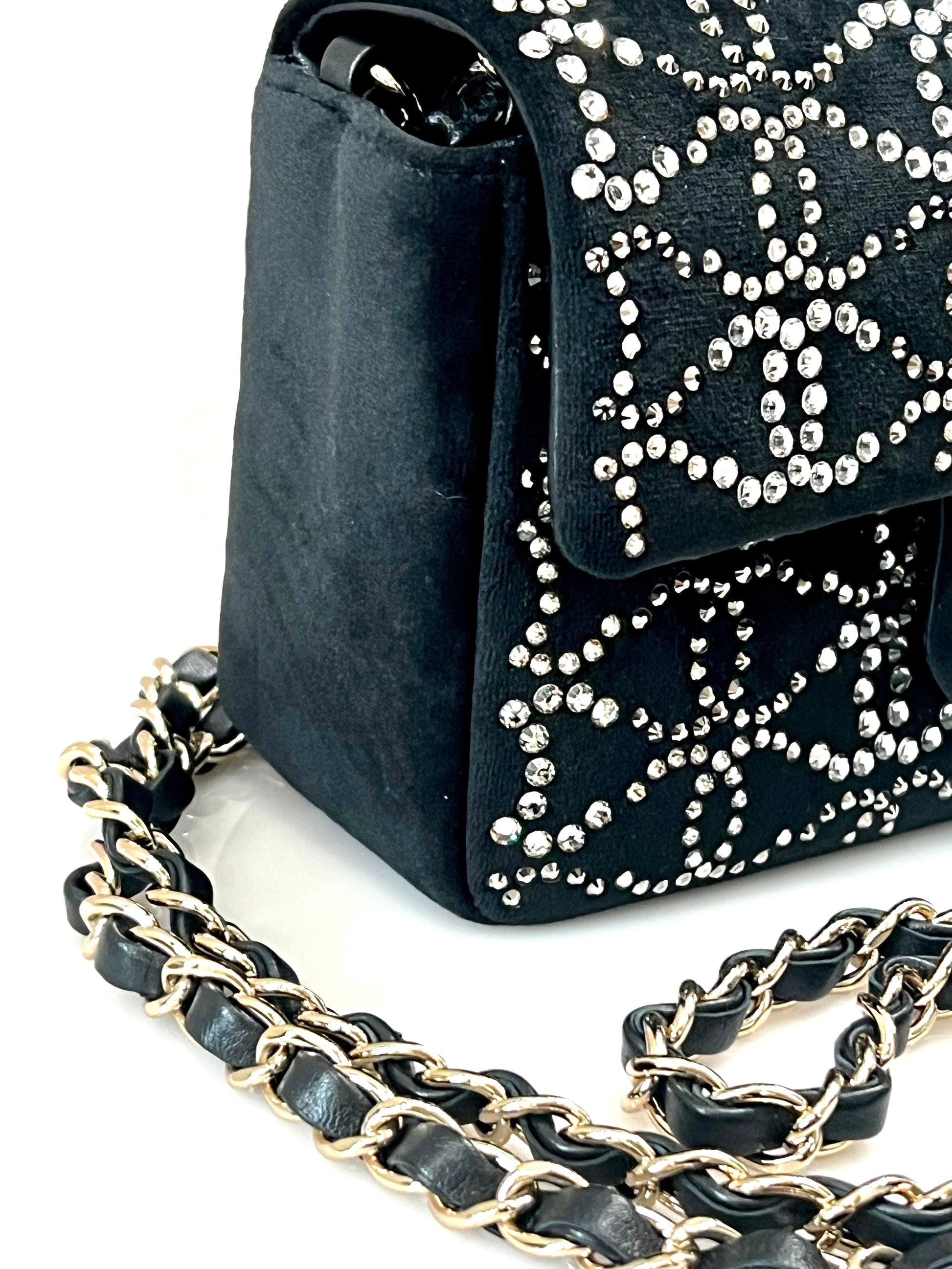 Chanel Black Velvet, Gold, Silver, Ruthenium Strass Crystal Embellished Rectangular Mini Classic Flap Gold Hardware, 2020