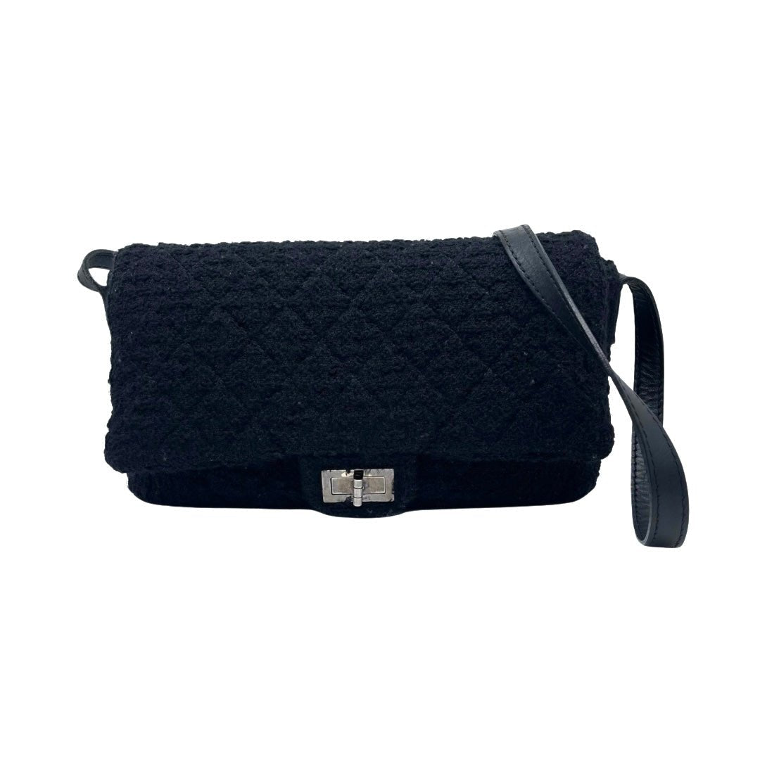 Sac 2.55 en tweed noir avec une bandoulière.