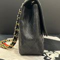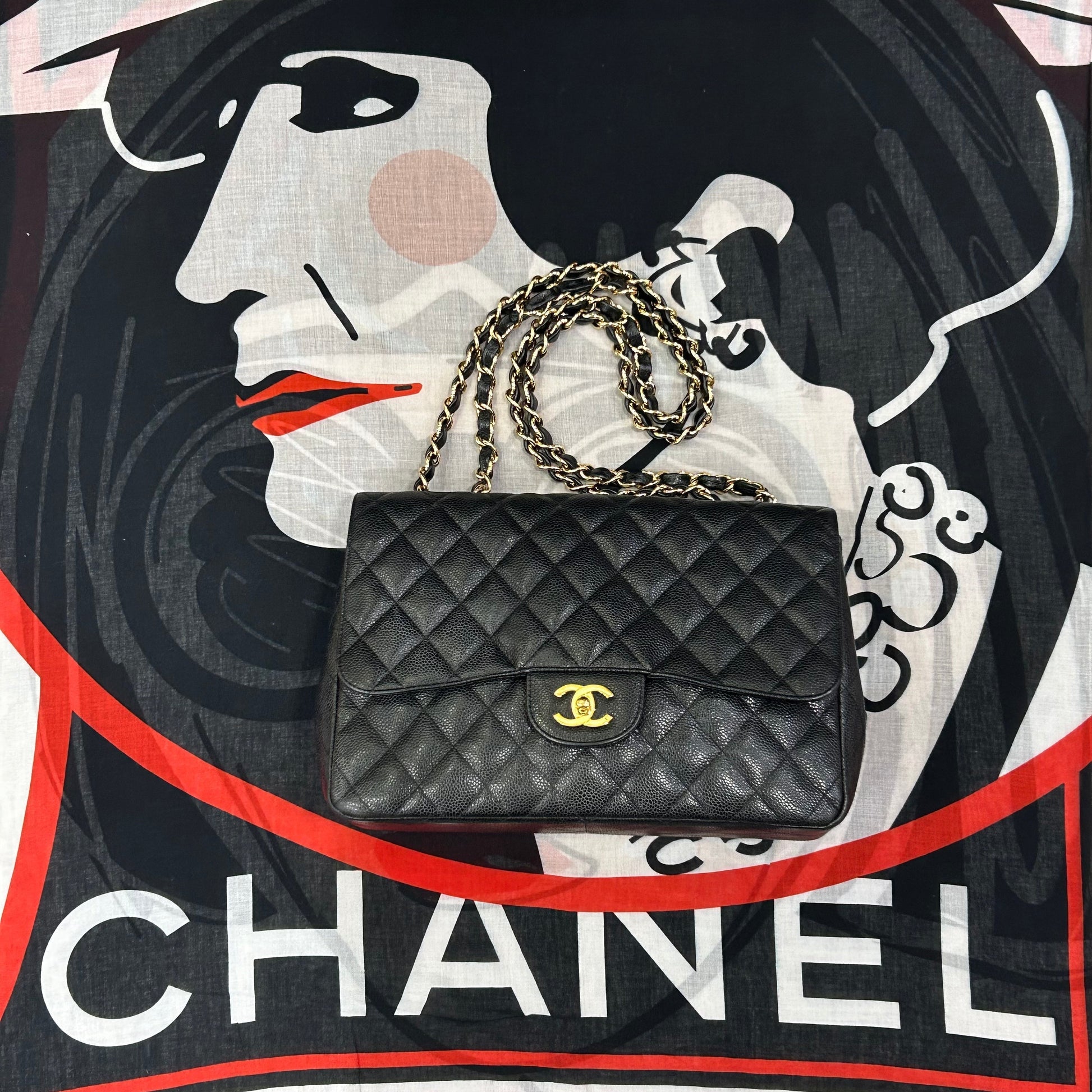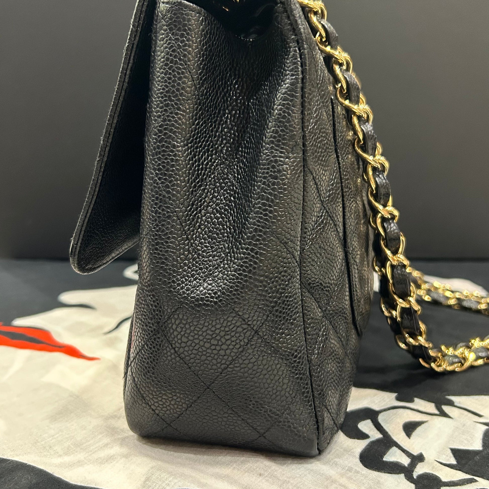 Le sac Chanel Jumbo en cuir caviar noir présente un design emblématique. Fabriqué à partir de cuir de haute qualité, il offre une texture distincte et une résistance accrue aux éraflures. À l'intérieur, on trouve un espace organisé avec des poches pour répondre aux besoins du quotidien, faisant de ce sac un accessoire chic et polyvalent.
