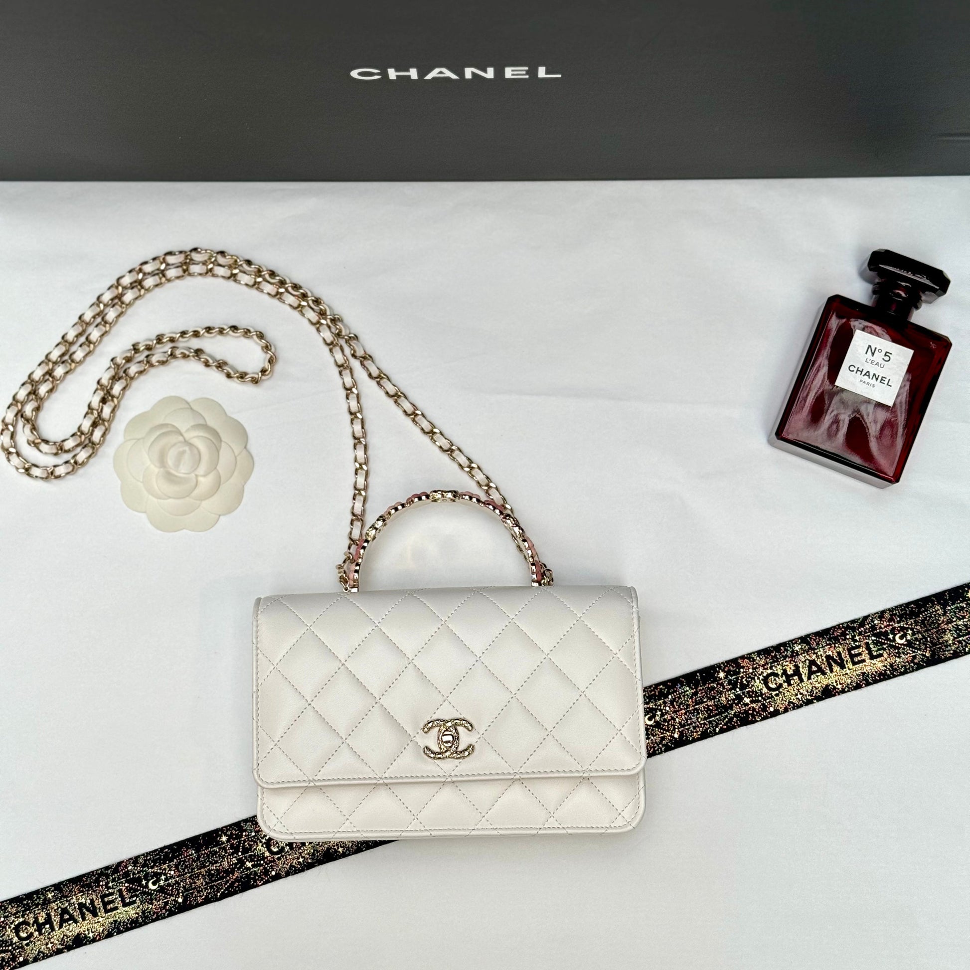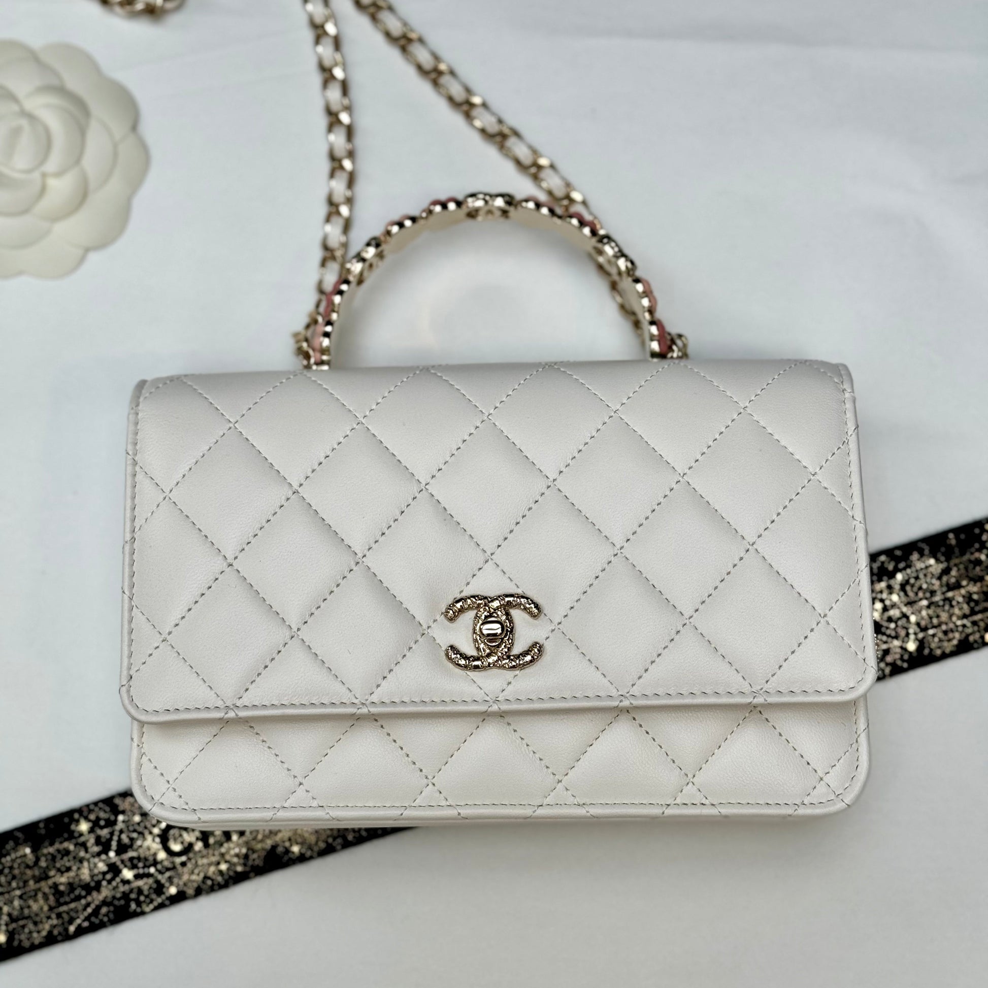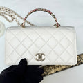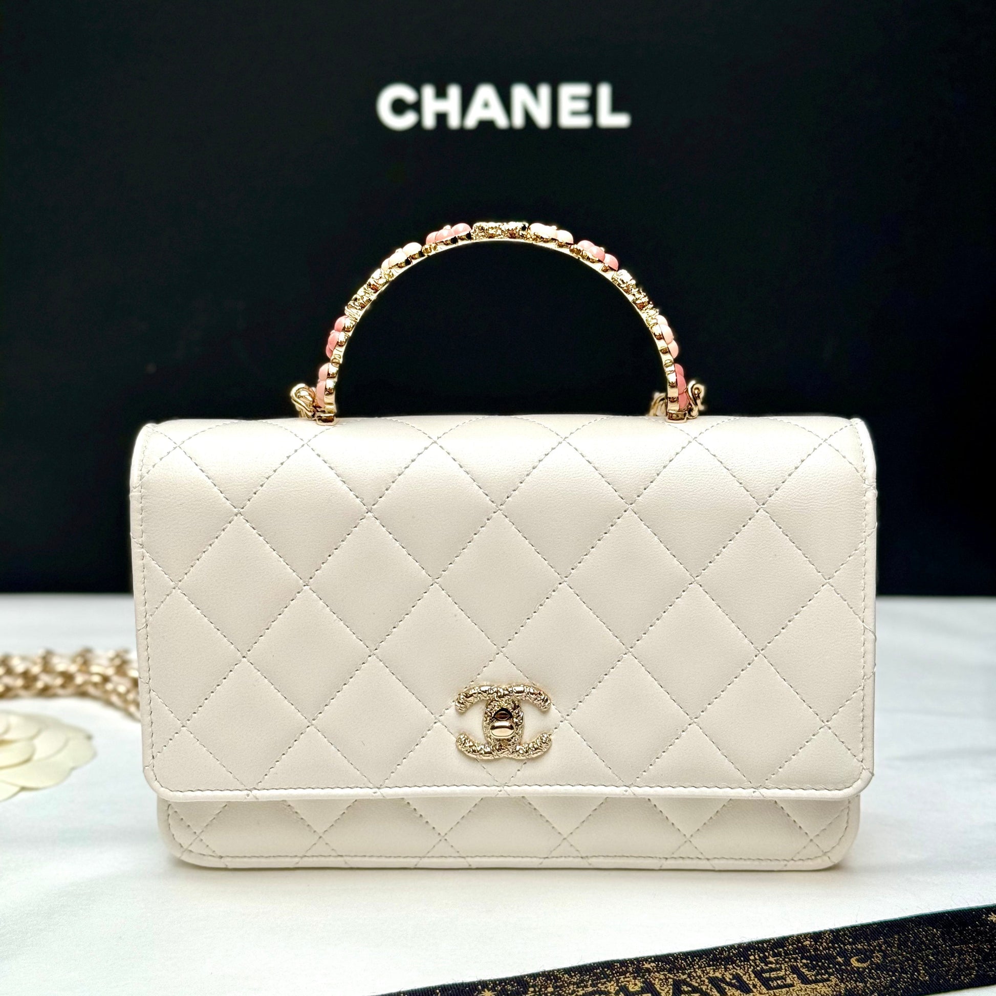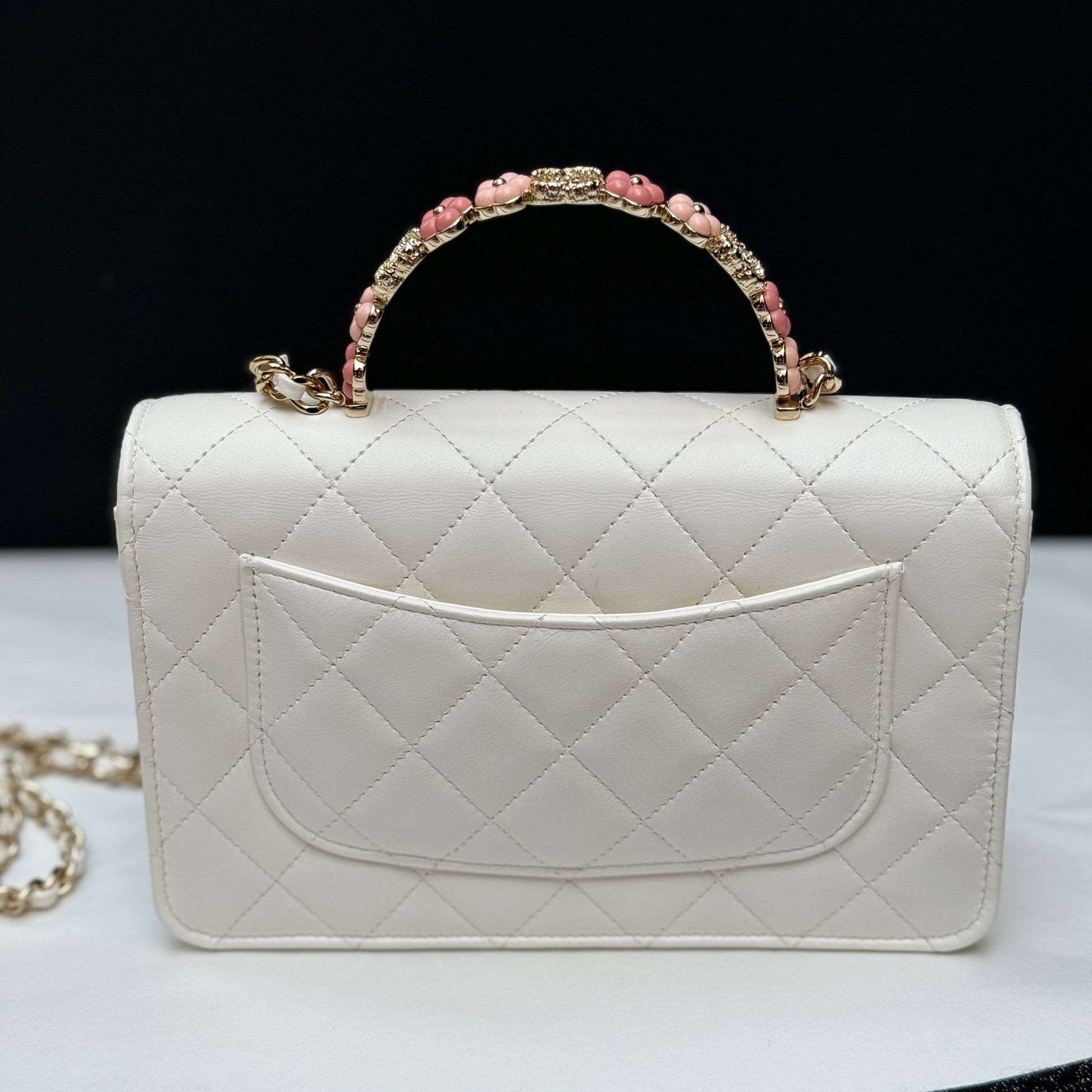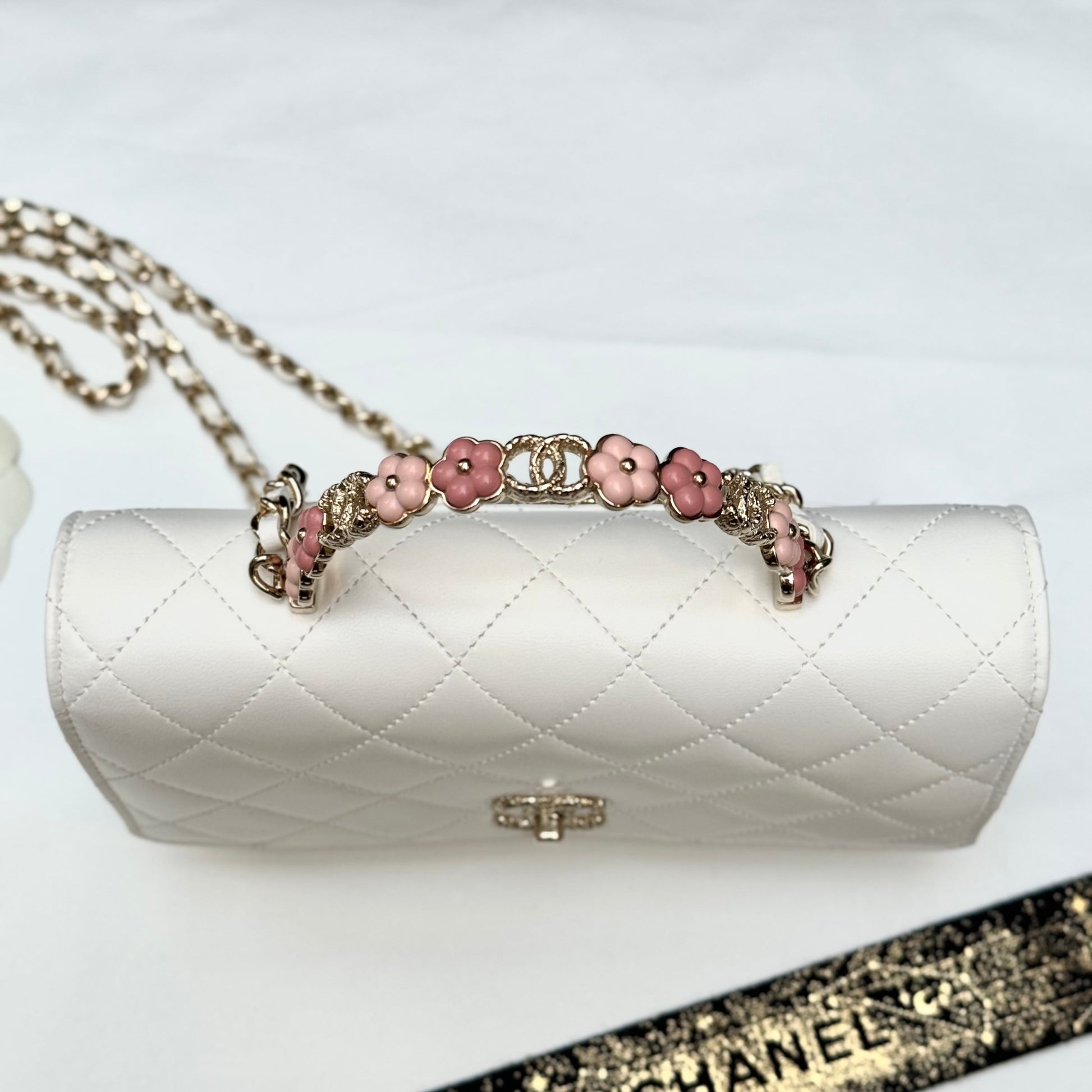 Ce sac à Rabat avec poignée petit modèle est réalisé en cuir de veau souple blanc et doté de finition doré. L’anse supérieure arrondie ornée de fleurs roses donne au design iconique de Chanel une touche d’originalité.