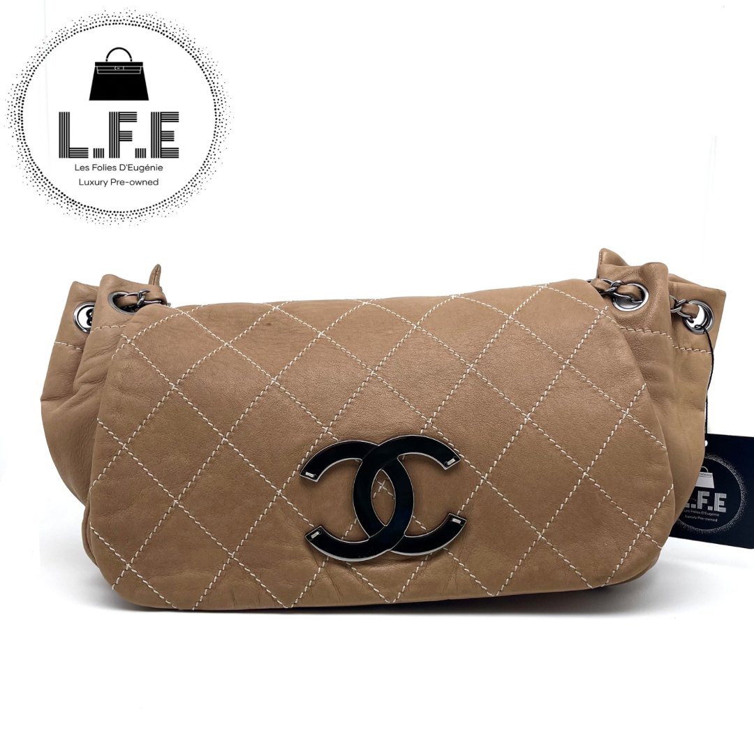 Ce magnifique sac beige en cuir de veau comporte un large rabat sur le devant. Il est en bon état mais possède des traces d'usure sur l’arrière du sac. Quelques imperfections sont visibles sur le devant du sac.