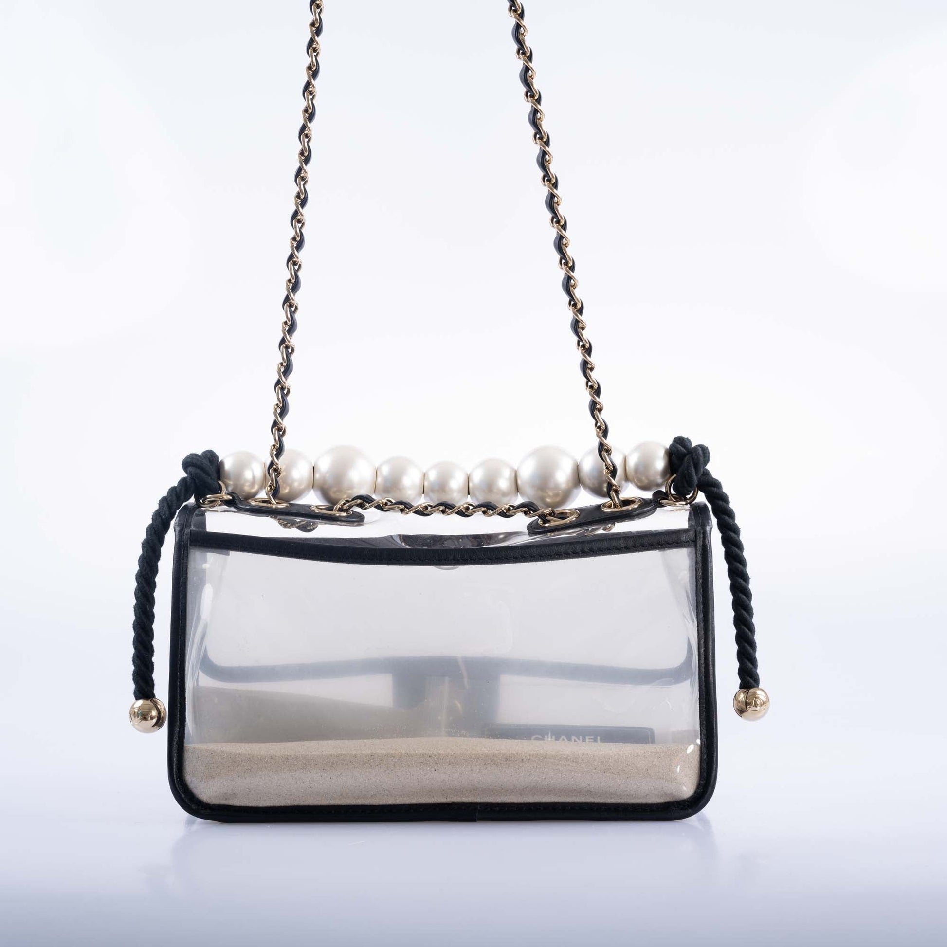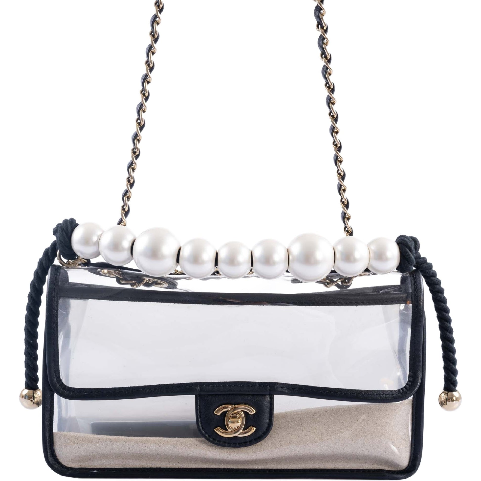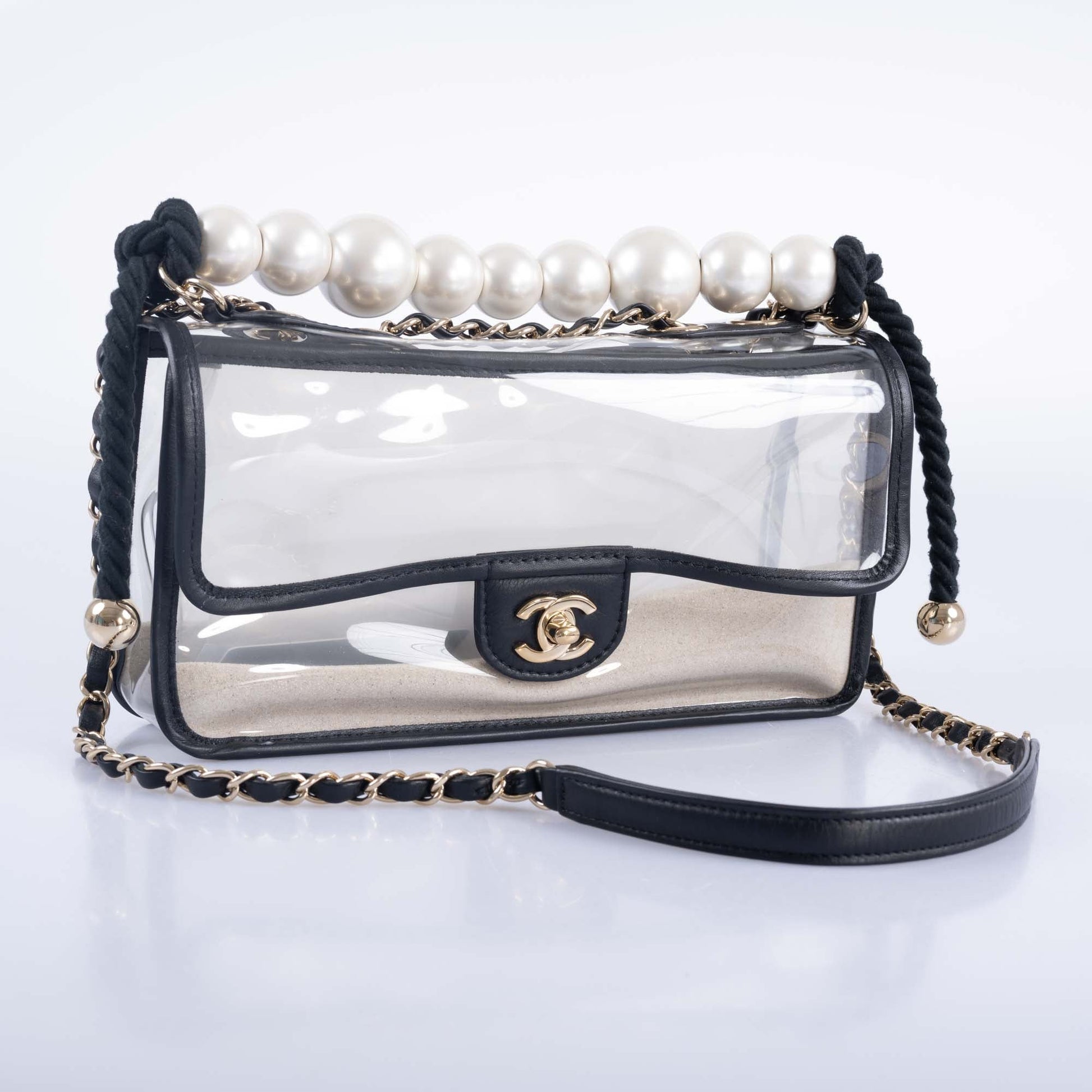 Note: Our Items are totally New High quality Brand Inspired Refurbished. Please make sure you are well aware of it before buying any of the Item. T&C's Apply in case of refunds.Please send us message on below chat to confirm availability. We will send the Refurbished Model in case you place an order with us. Enjoy Shopping.Always Send Us message to confirm availability before buying, In case of refund the transaction fee remains non refundable. Thank you.="1">The Chanel Sand By The Sea PVC Flap Bag is truly a statement piece that captures the eye. Hailing from Chanel's 2019 Runway collection, this shoulder bag boasts an unexpected flair with its sand-filled sides, all wrapped up in transparent PVC and accented with black leather trim. What elevates it further is the pearl strap, making it not just visually stunning but also practical. It's meticulous down to the last detail, coming with its original box, dust bag, ribbon, camellia flower, and an ity card—everything you'd expect from a luxury fashion house like Chanel.