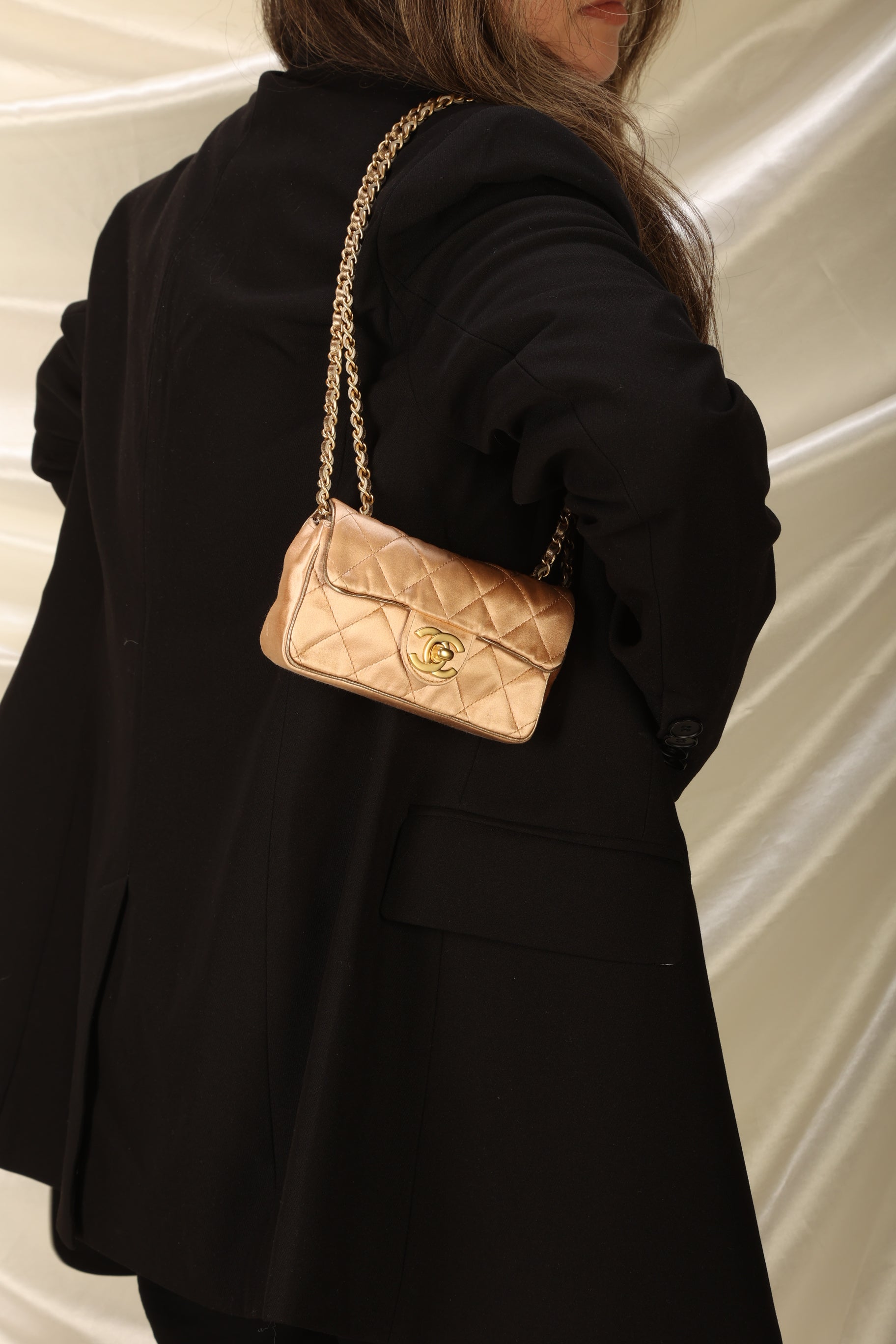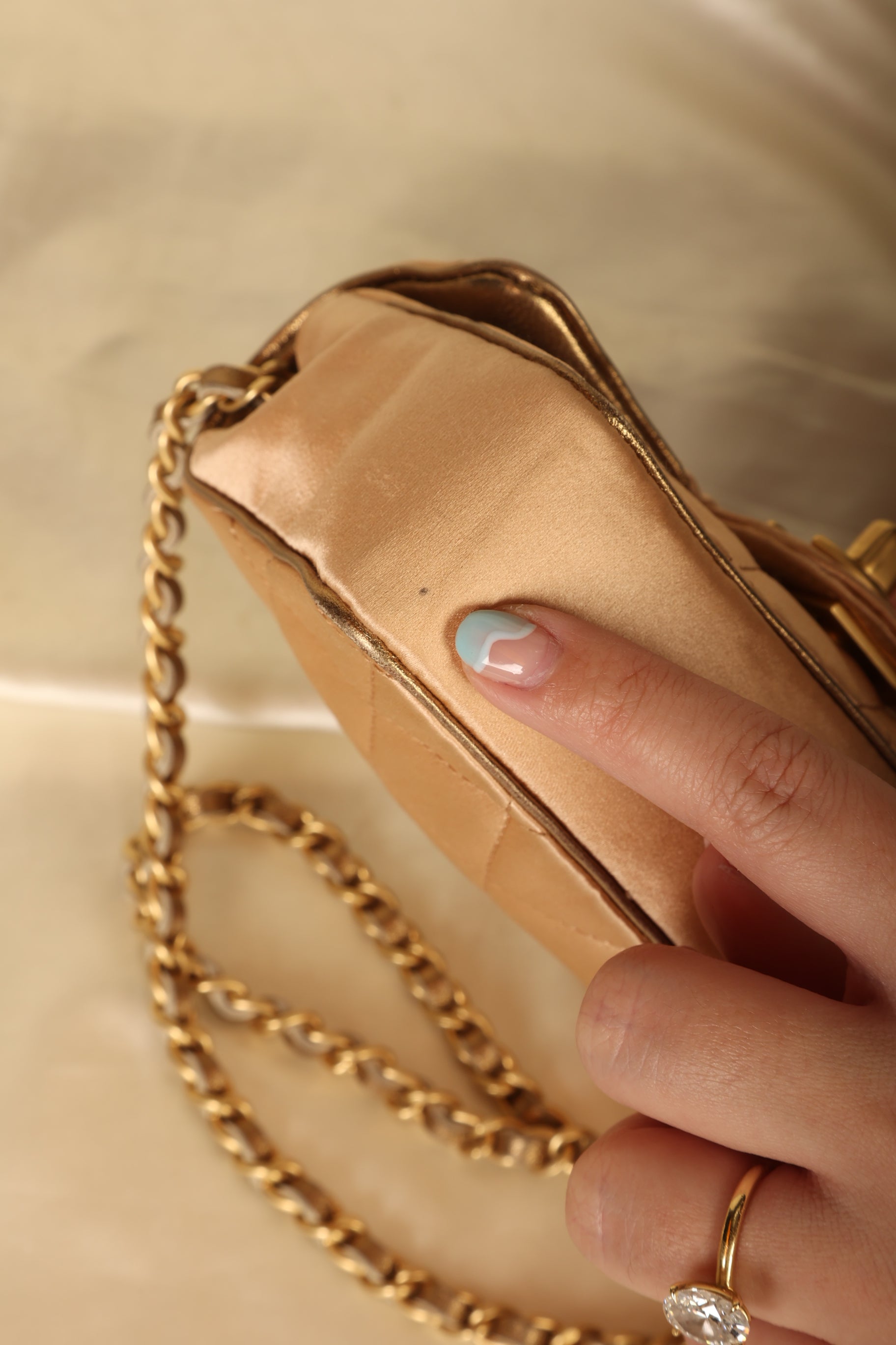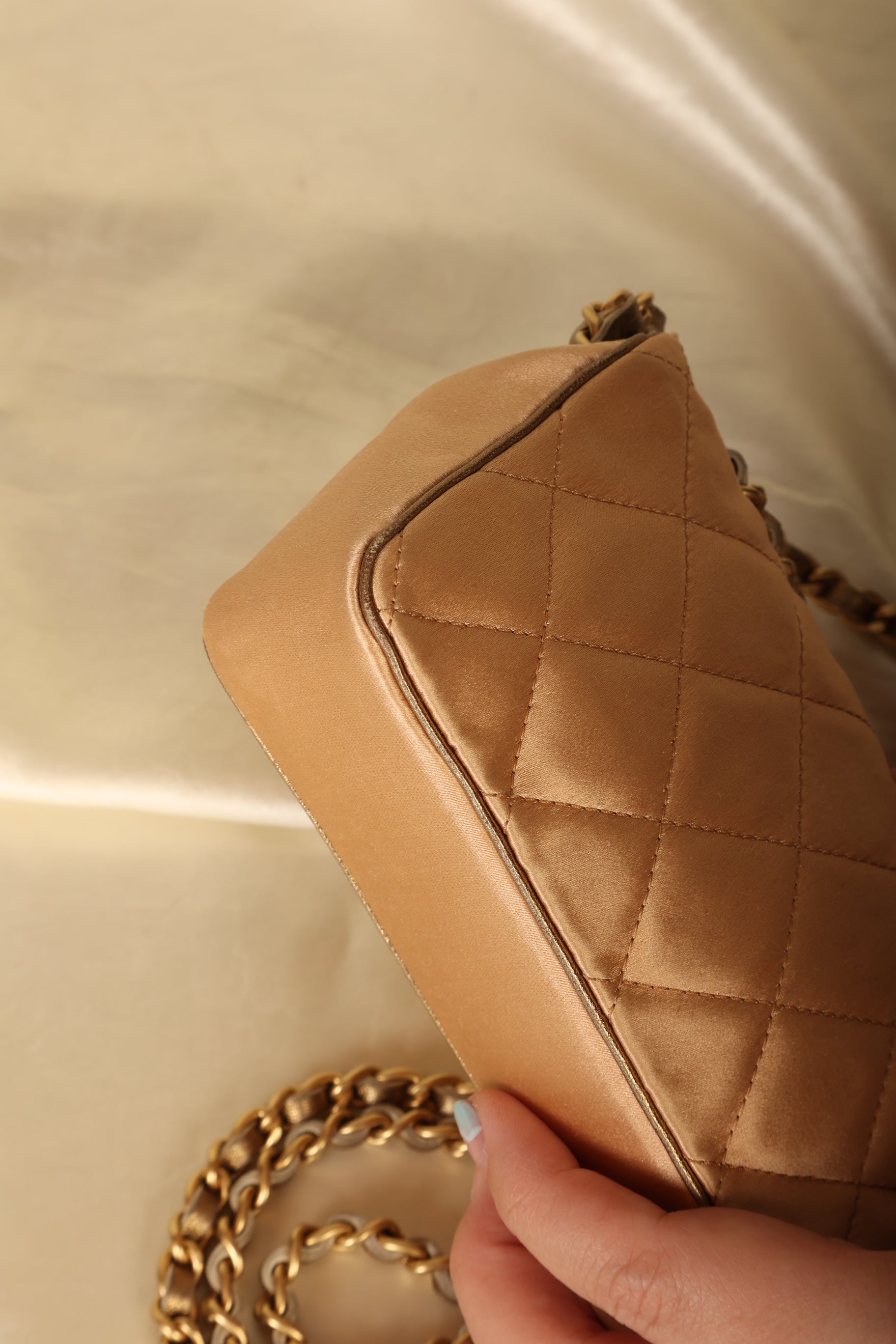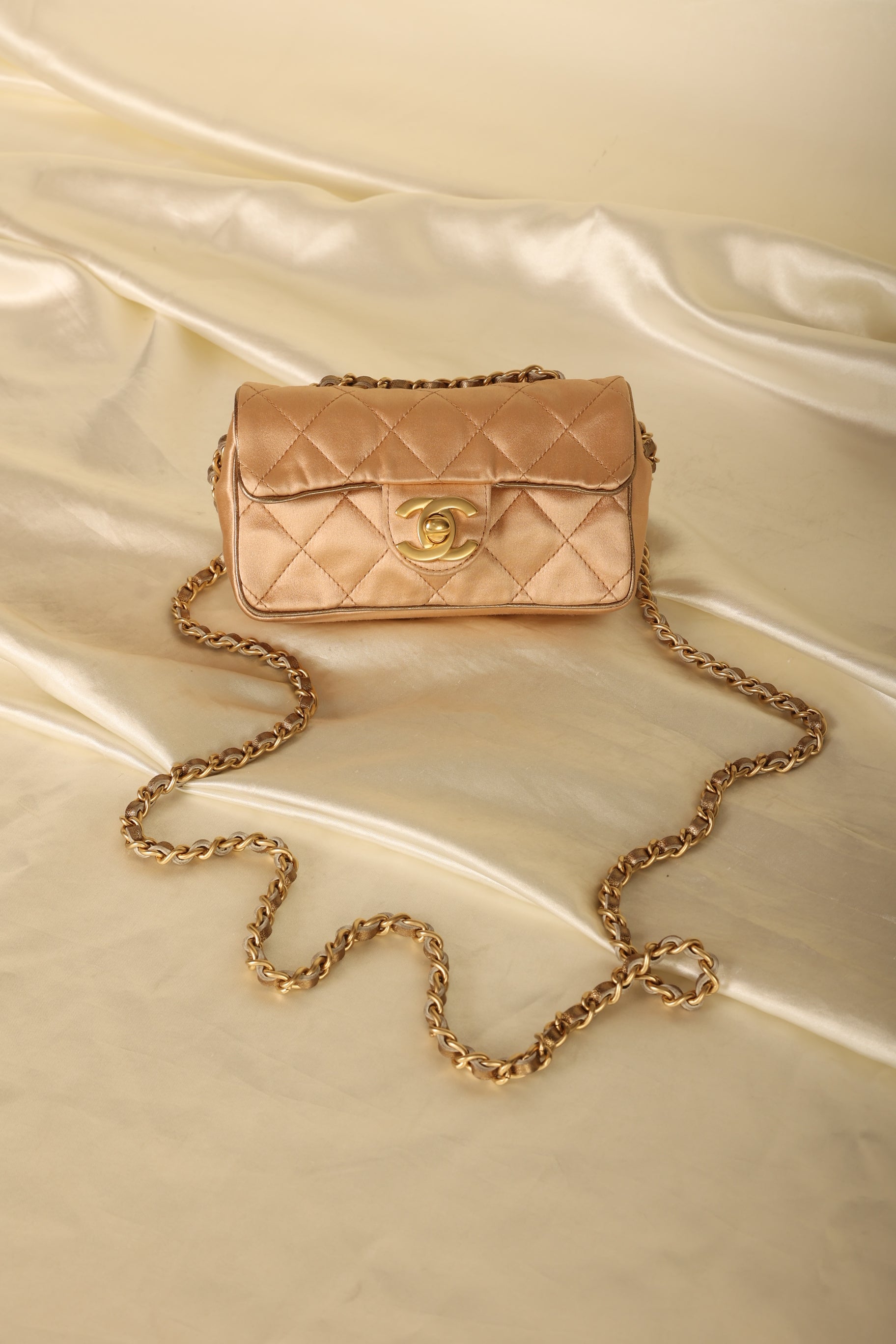 Twin with me!?ÿI have the same exact bag and love her!!?ÿA champagne satin Chanel mini bag that has light brown iridescent?ÿpiping and champagne gold hardware. Rare piece. Can fit some small phone models and keys.