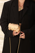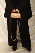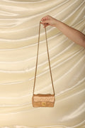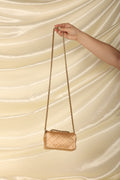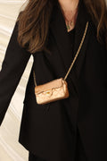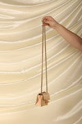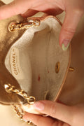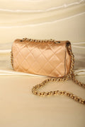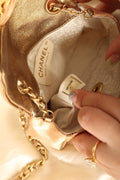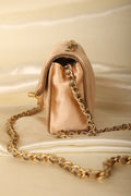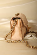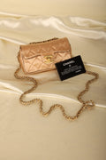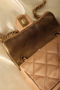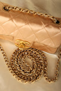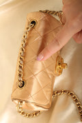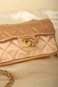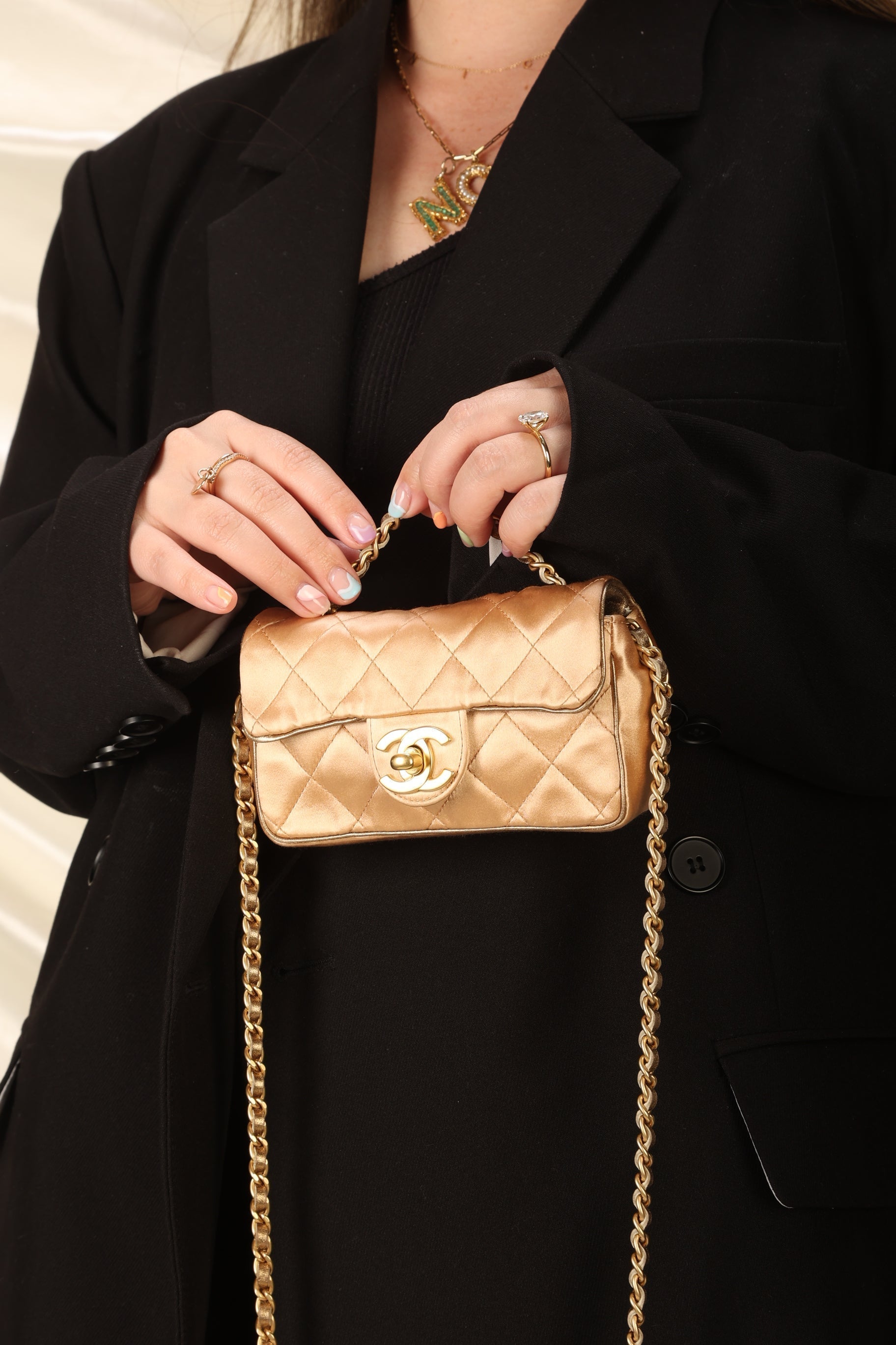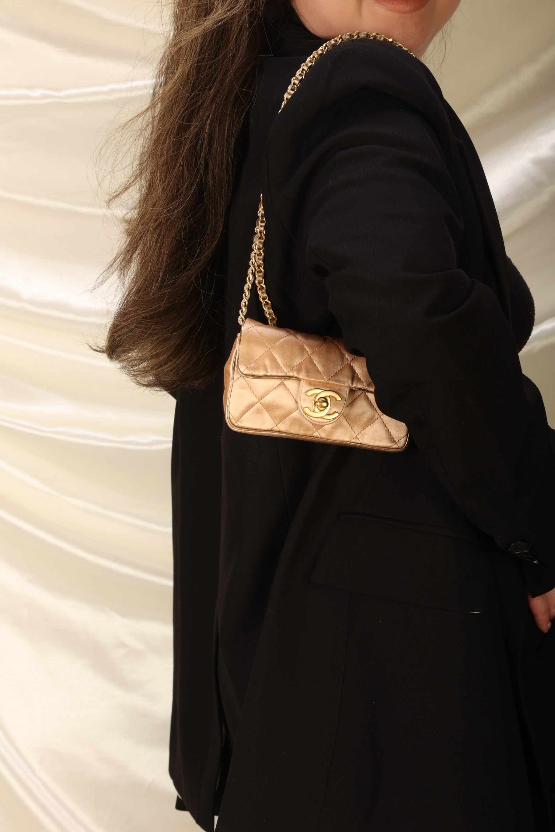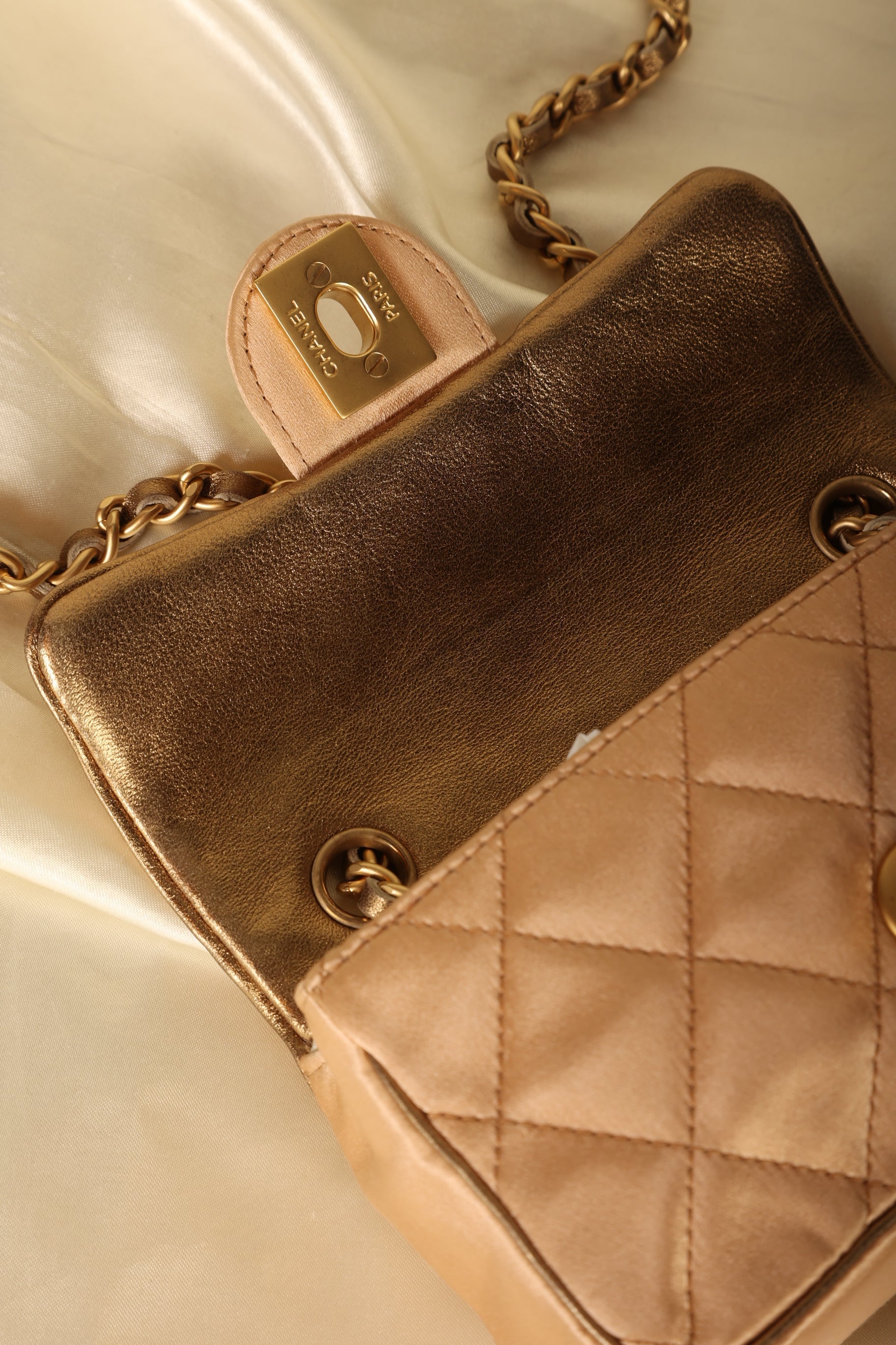 Twin with me!?ÿI have the same exact bag and love her!!?ÿA champagne satin Chanel mini bag that has light brown iridescent?ÿpiping and champagne gold hardware. Rare piece. Can fit some small phone models and keys.