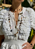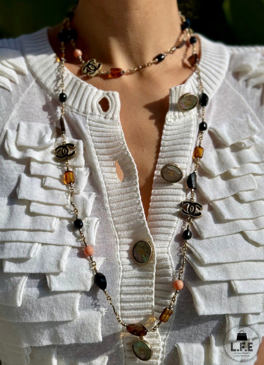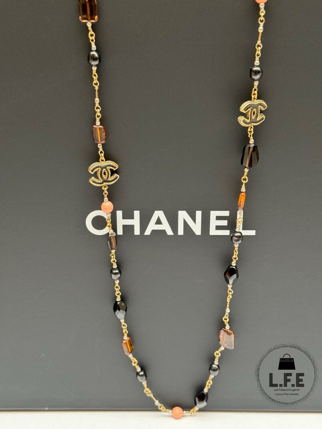 Elégant sautoir Chanel composé de perles de verre ambre, marron et rose et du logo CC sur une chaîne en métal doré. Il peut être porté en deux tours. Avec poinçon Chanel.