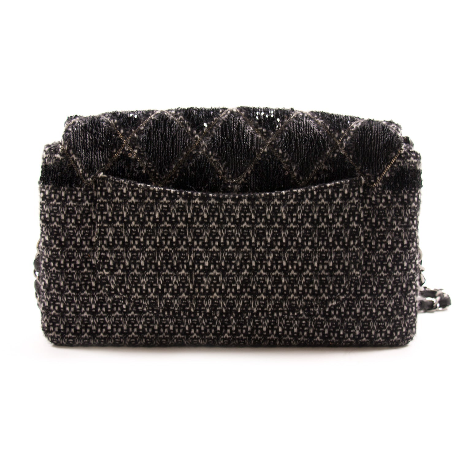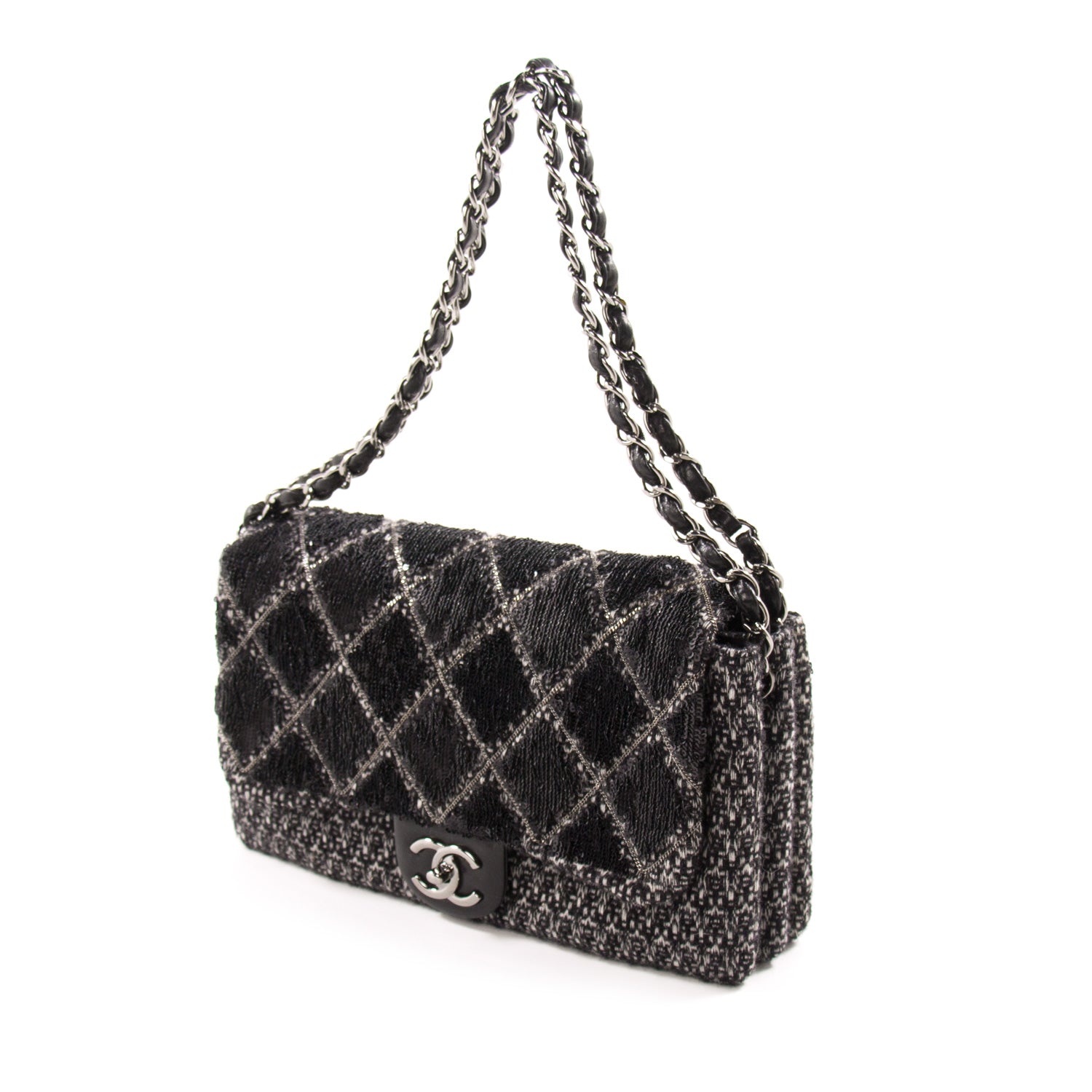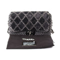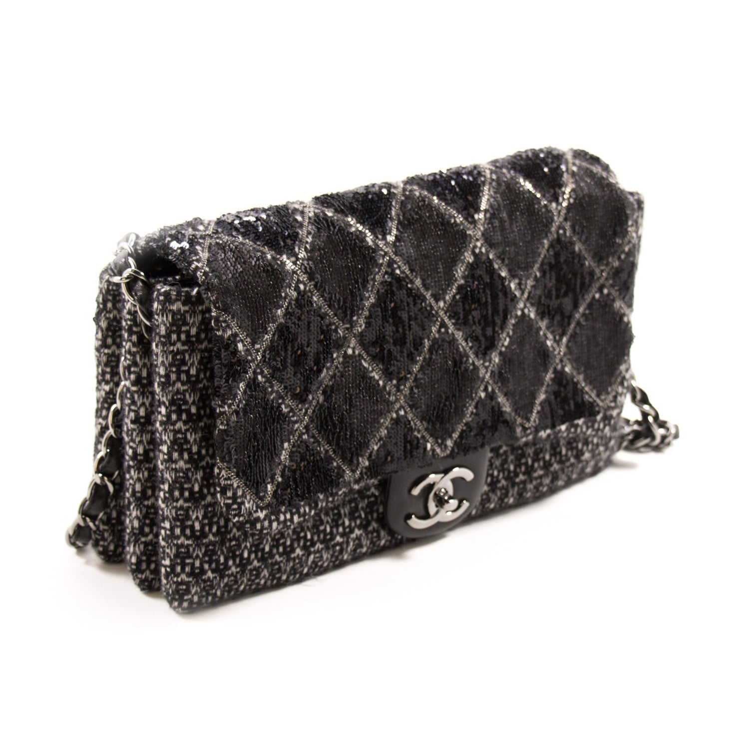 Details: Black and White Sequin and Tweed / Silver-Tone Hardware / Exterior Pocket at Back / Black Leather at Inside Flap / Satin Lining at Interior / Three Compartment / Zip Pocket at Interior Wall / Turn-Lock Closure at Front Flap