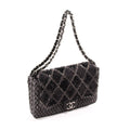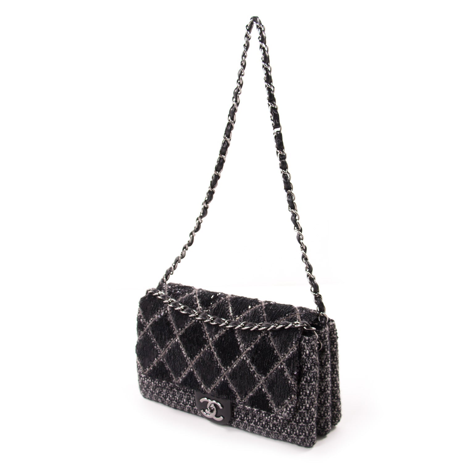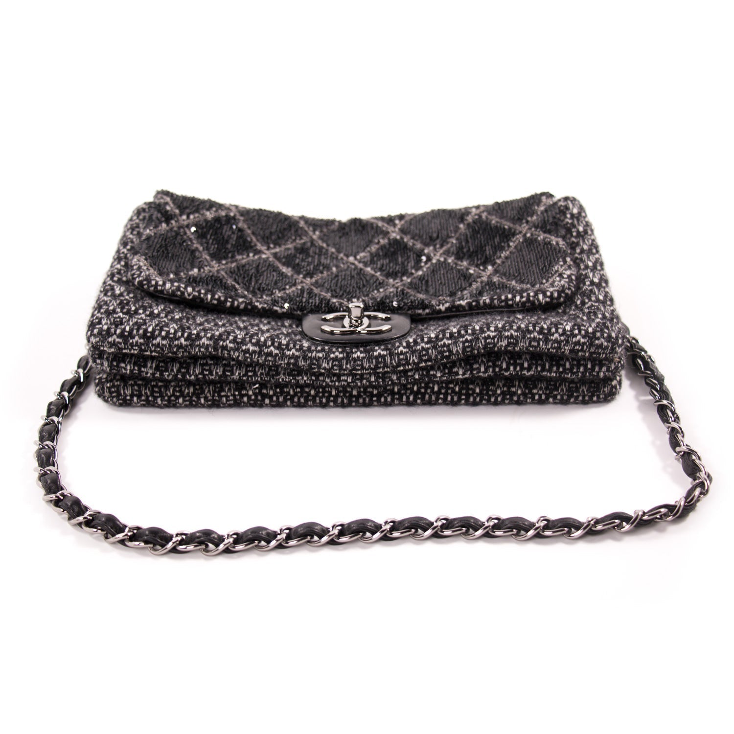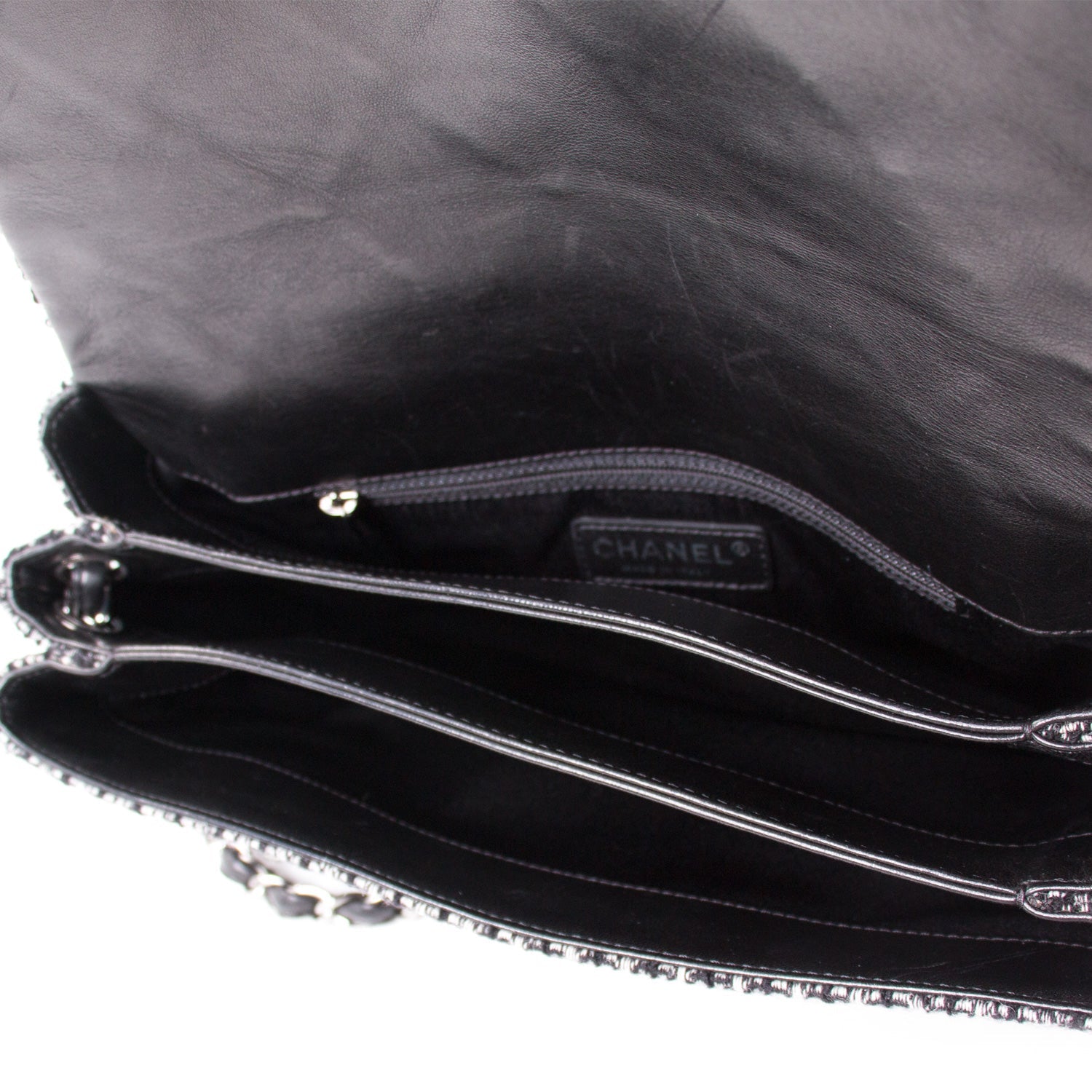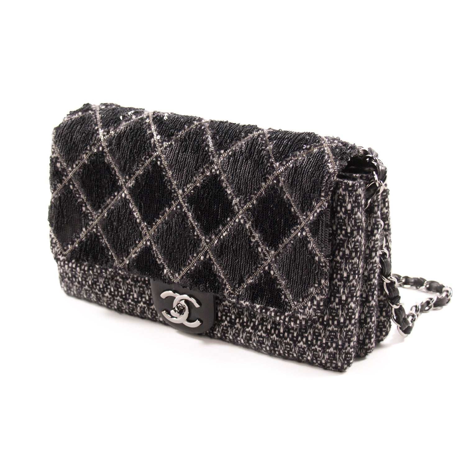 Details: Black and White Sequin and Tweed / Silver-Tone Hardware / Exterior Pocket at Back / Black Leather at Inside Flap / Satin Lining at Interior / Three Compartment / Zip Pocket at Interior Wall / Turn-Lock Closure at Front Flap