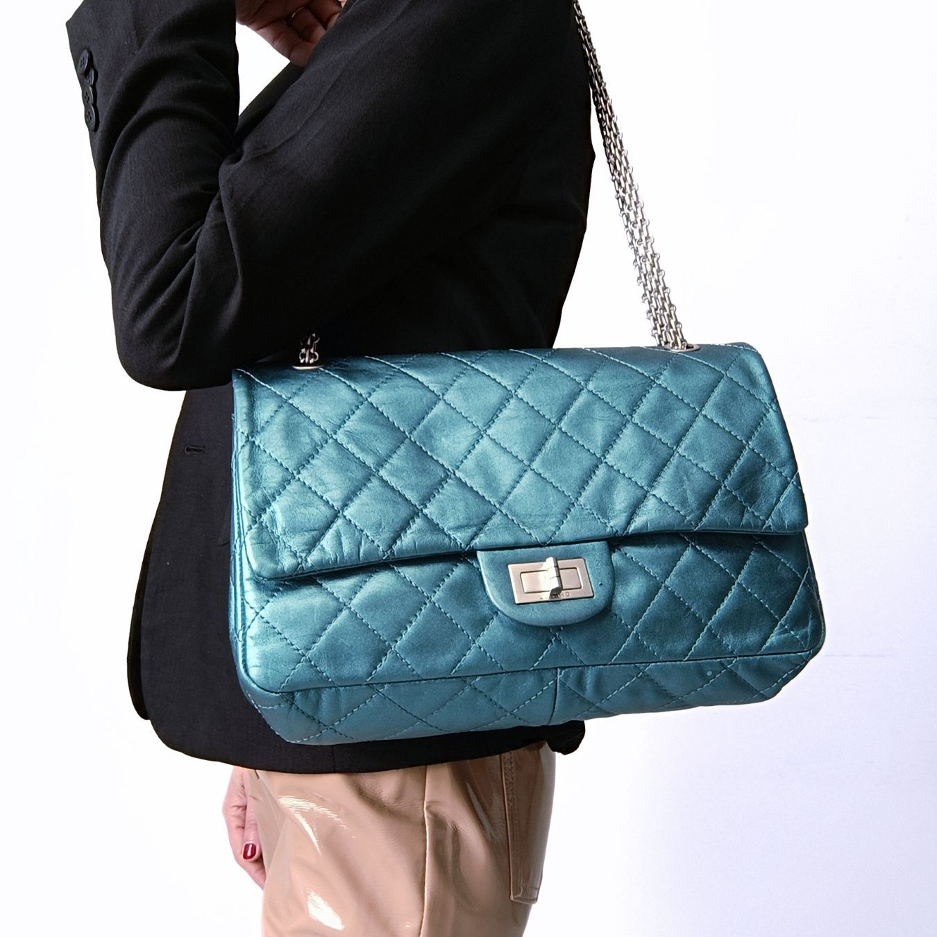 Chanel shoulder bag 2.55 Dekamatrasse 30 Large double flap.Produced in Italy in 2008-2009.Turquoise leather with matt finish with steel hardware.The shoulder strap is adjustable so it can be over the shoulder or across the body.One external back pocket.Double flap and two internal compartments with multi pockets.Complete with dustbag and booklets.Its overall condition is very good, but it has scattered minor scratches.DIMENSIONS: L: 31 cm - H: 20 cm - W: 9 cm - Shoulder strap maximum length 51 cmAll our items are selected, carefully sanitized and ated by our experts.CODE: 5681B1462BRAND: ChanelMADE IN: ItalyITY CODE: 12717260COLOR: TurquoiseMATERIAL: LeatherCONDITION: ExcellentAssured Product ity: This product is supplied by a renowned and trusted partner. With this purchase, you are preserving iconic craftsmanship, celebrating heritage, and embracing the beauty of conscious shopping.