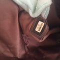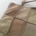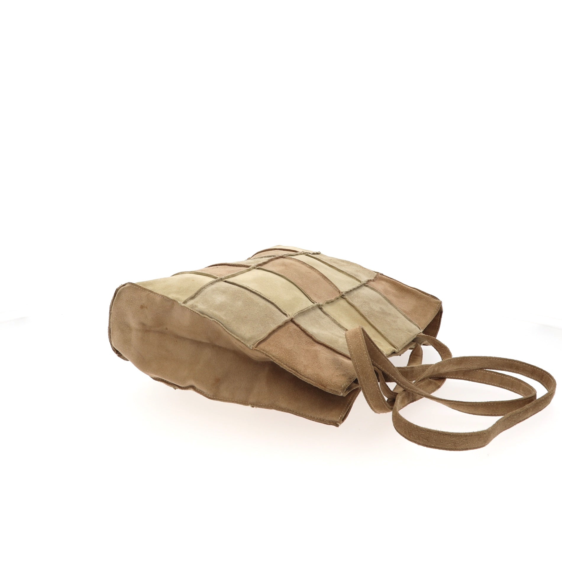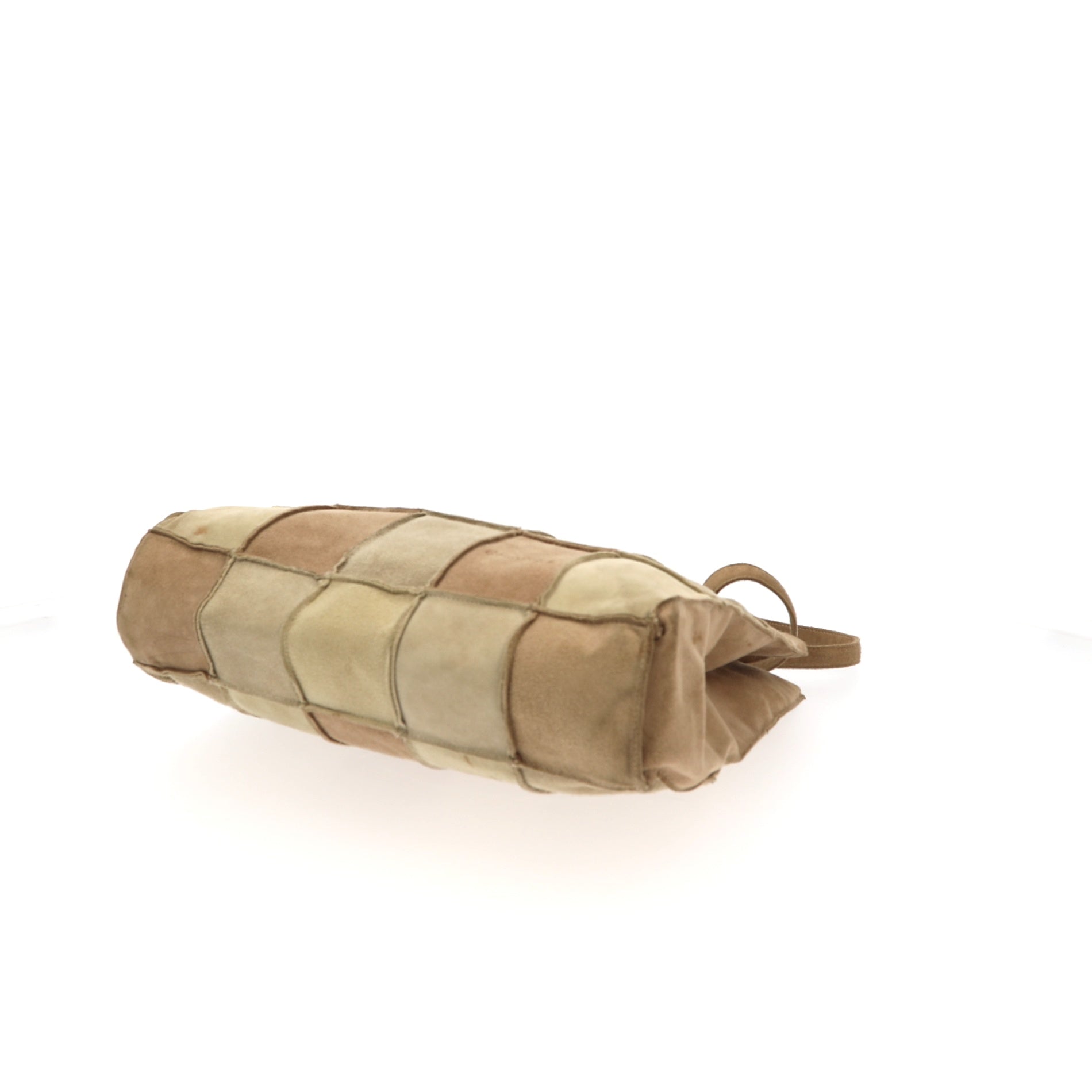 This elegantly structured shoulder bag is finely crafted of suede in different shades of beige