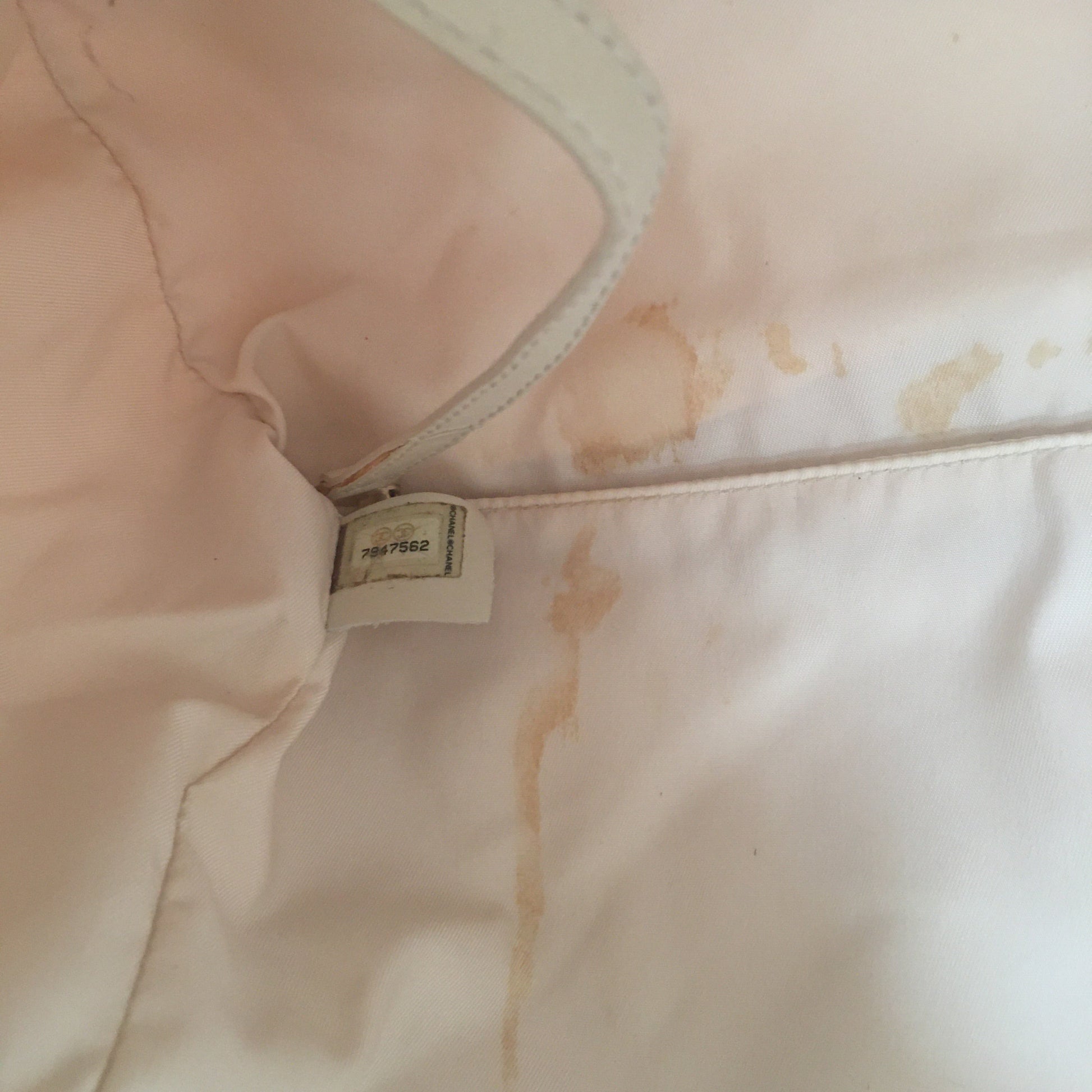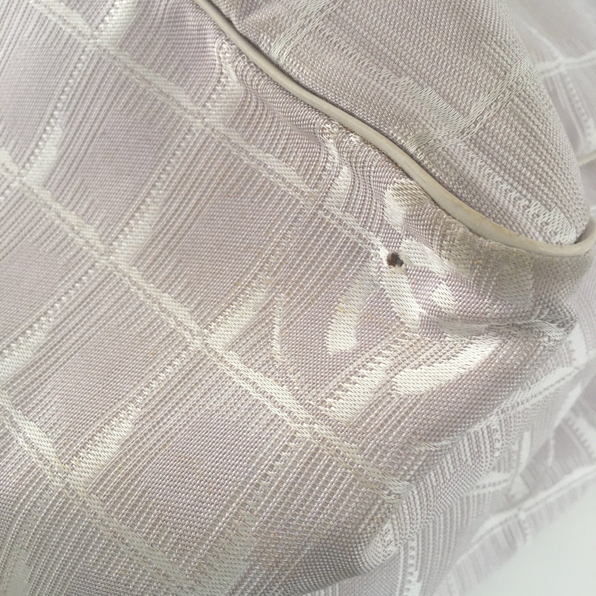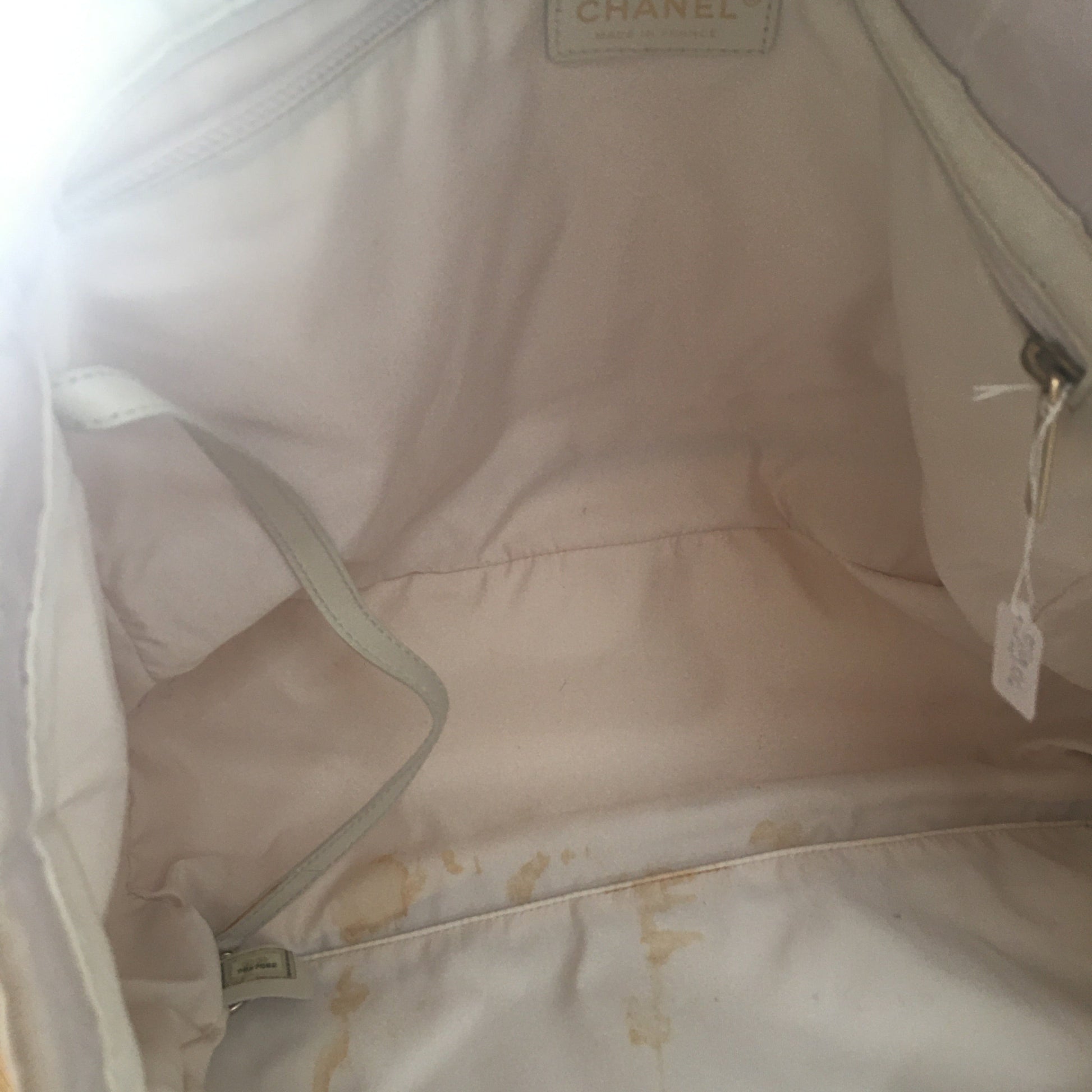 On the bottom, the bag lost one of its decorations and from the hole the bag looses some material
