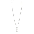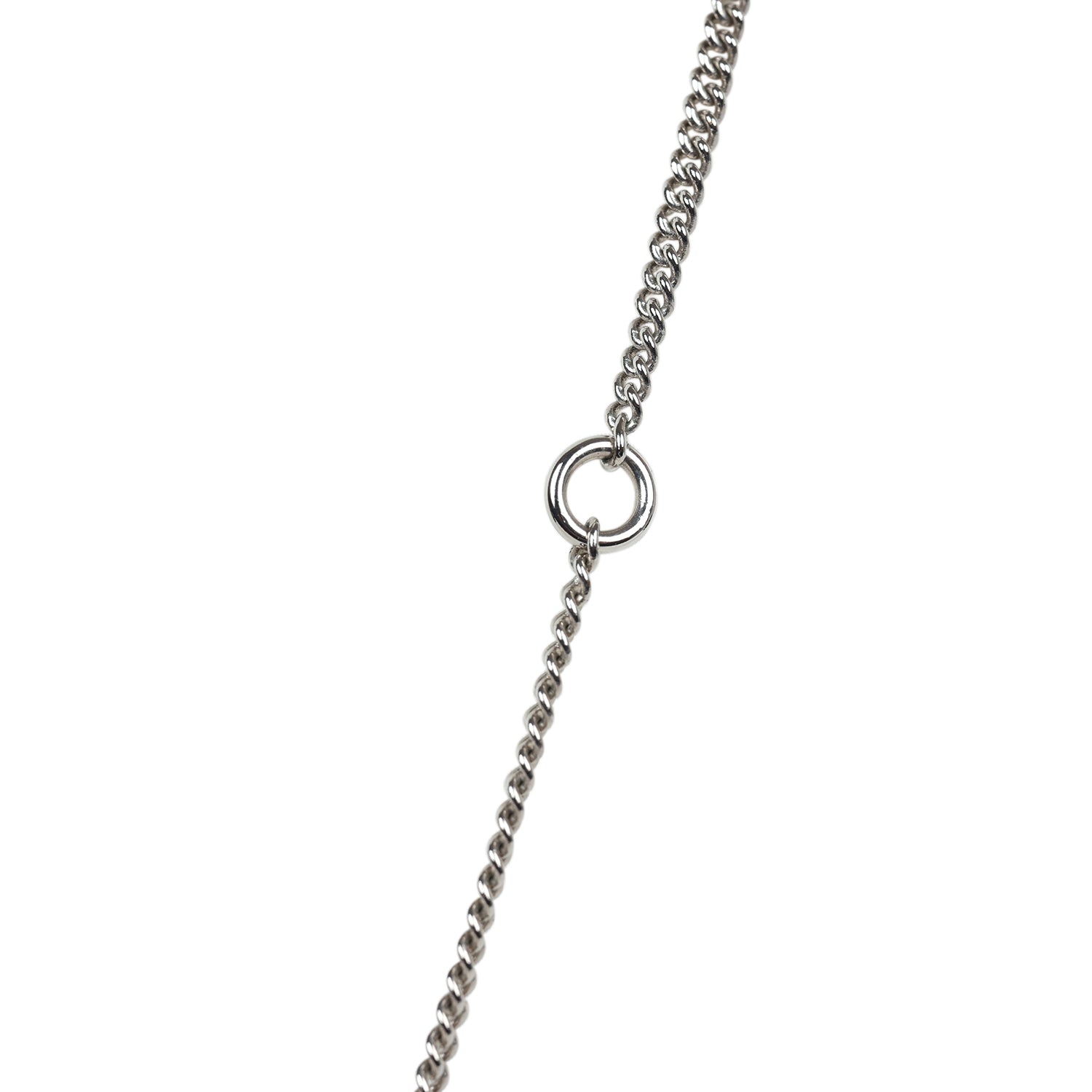 This Chanel necklace features a reversible Silver tone Crystal Choupette emoji charm with the classic CC motif on the front and a crystal embellished CC heart charm design on the reverse side, a silver tone rolo chain, and a lobster claw closure.