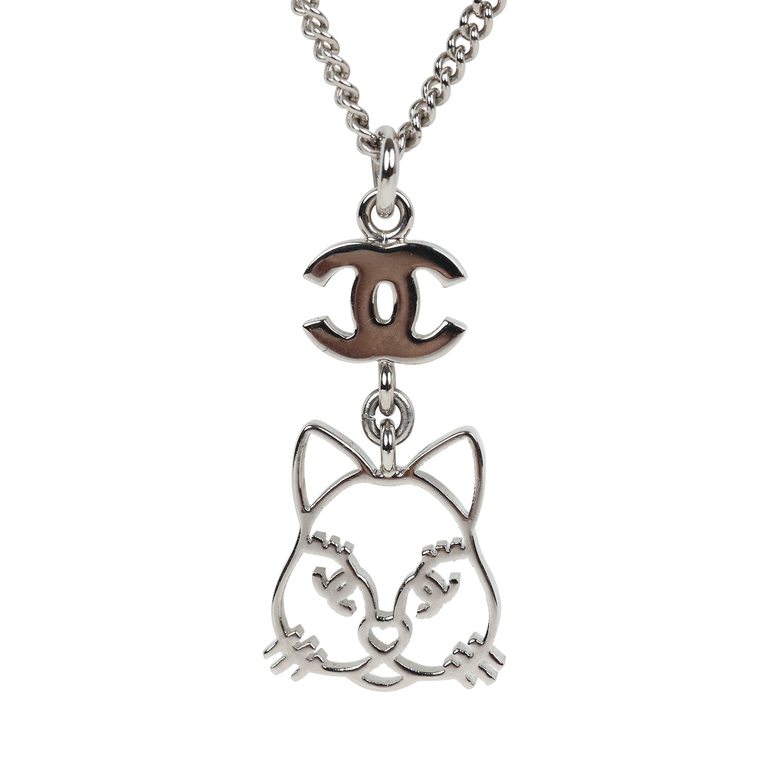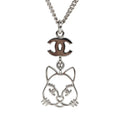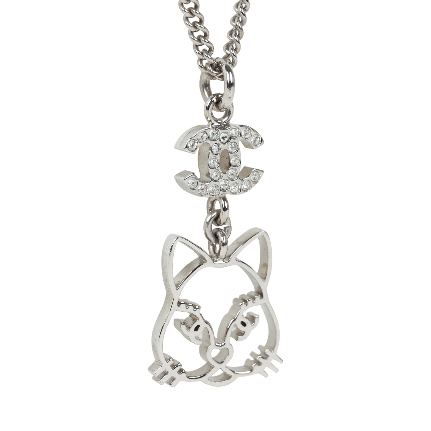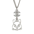 Chanel Silver CC Crystal Choupette Cat Emoji Pendant Necklace