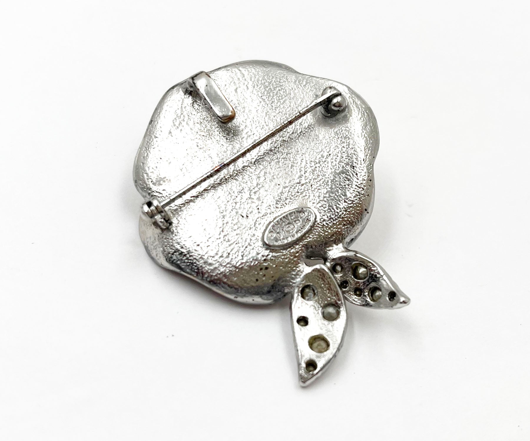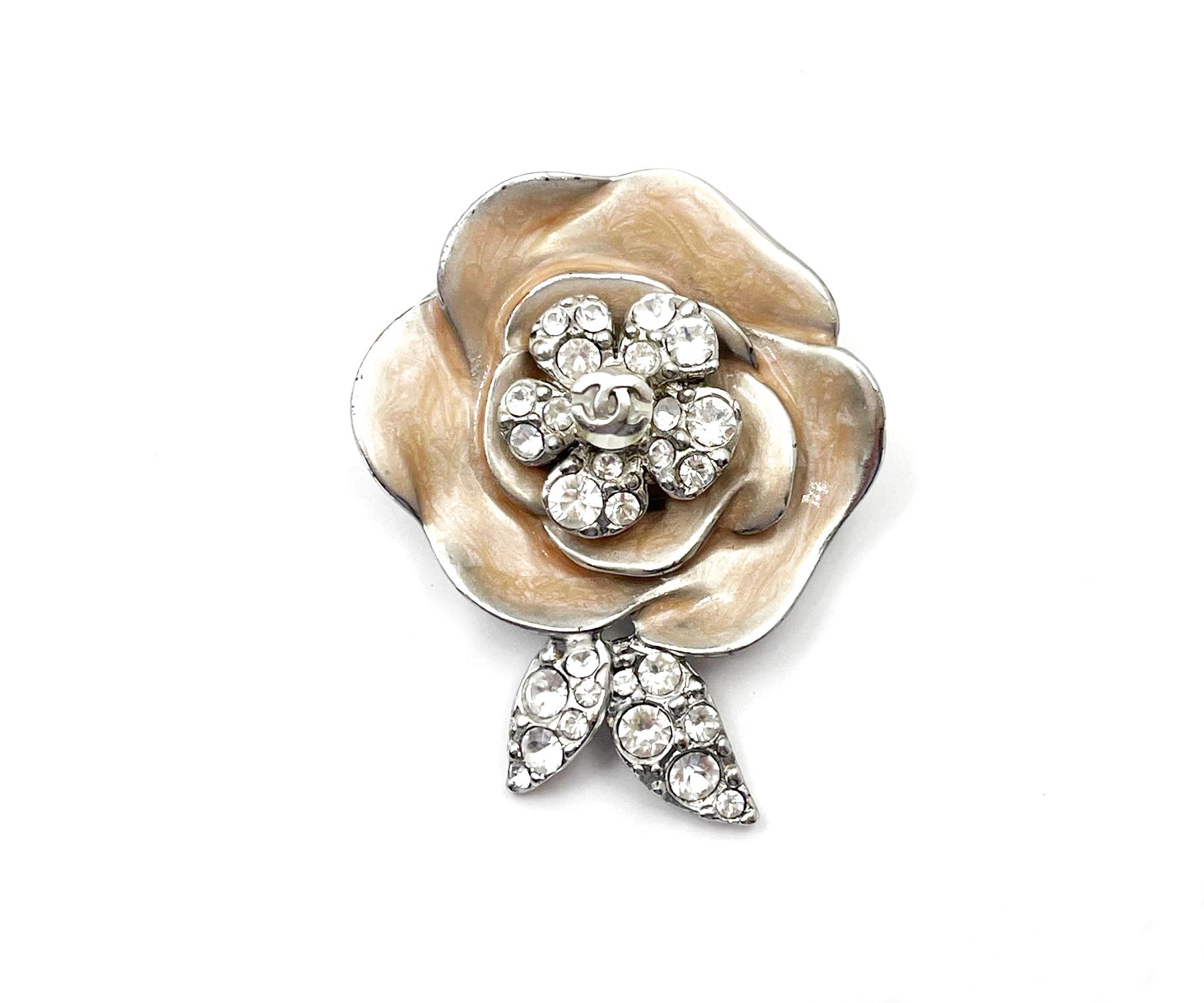 Chanel Silver CC Crystal Pink Enamel Camellia Flower Brooch.