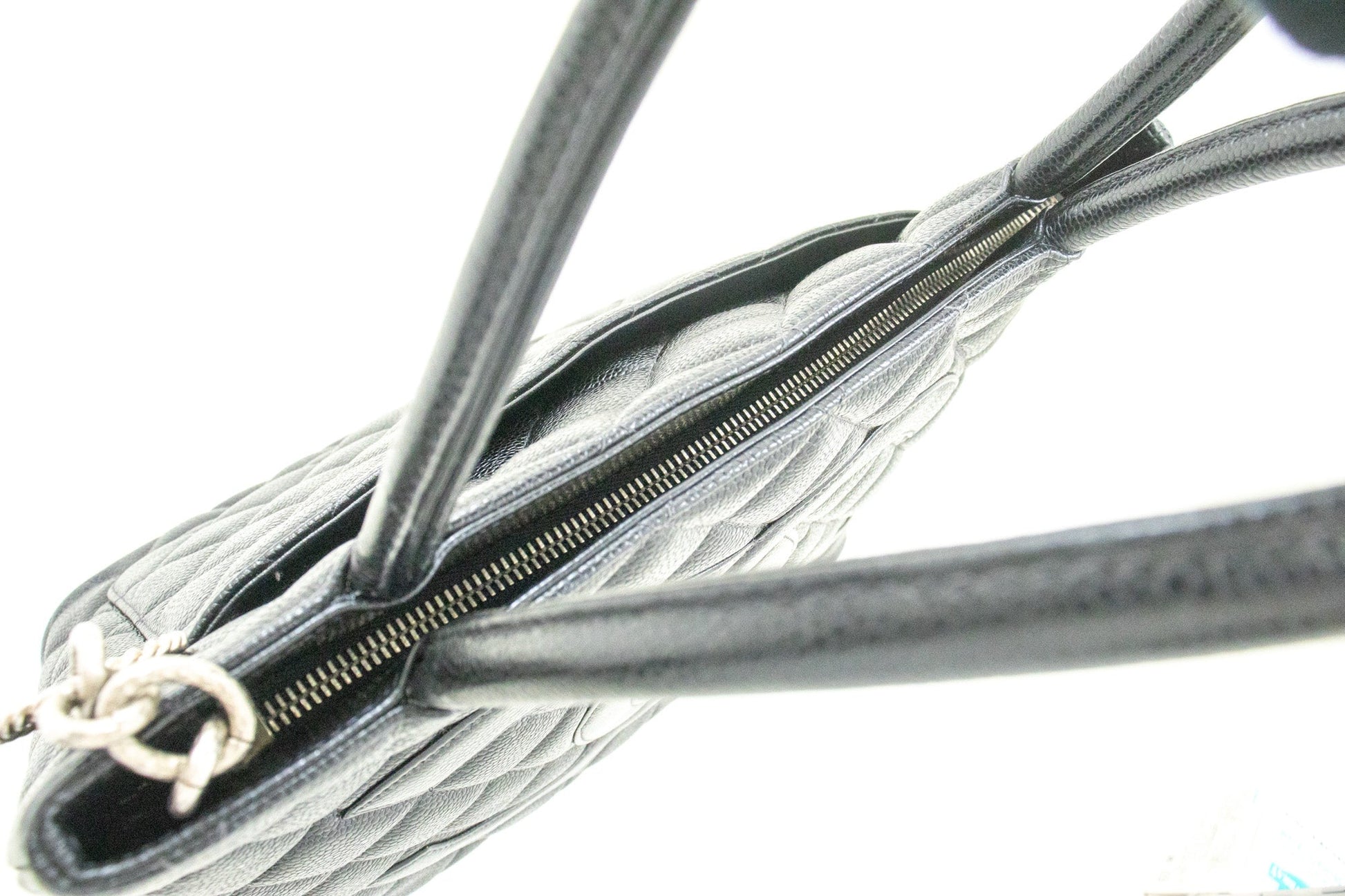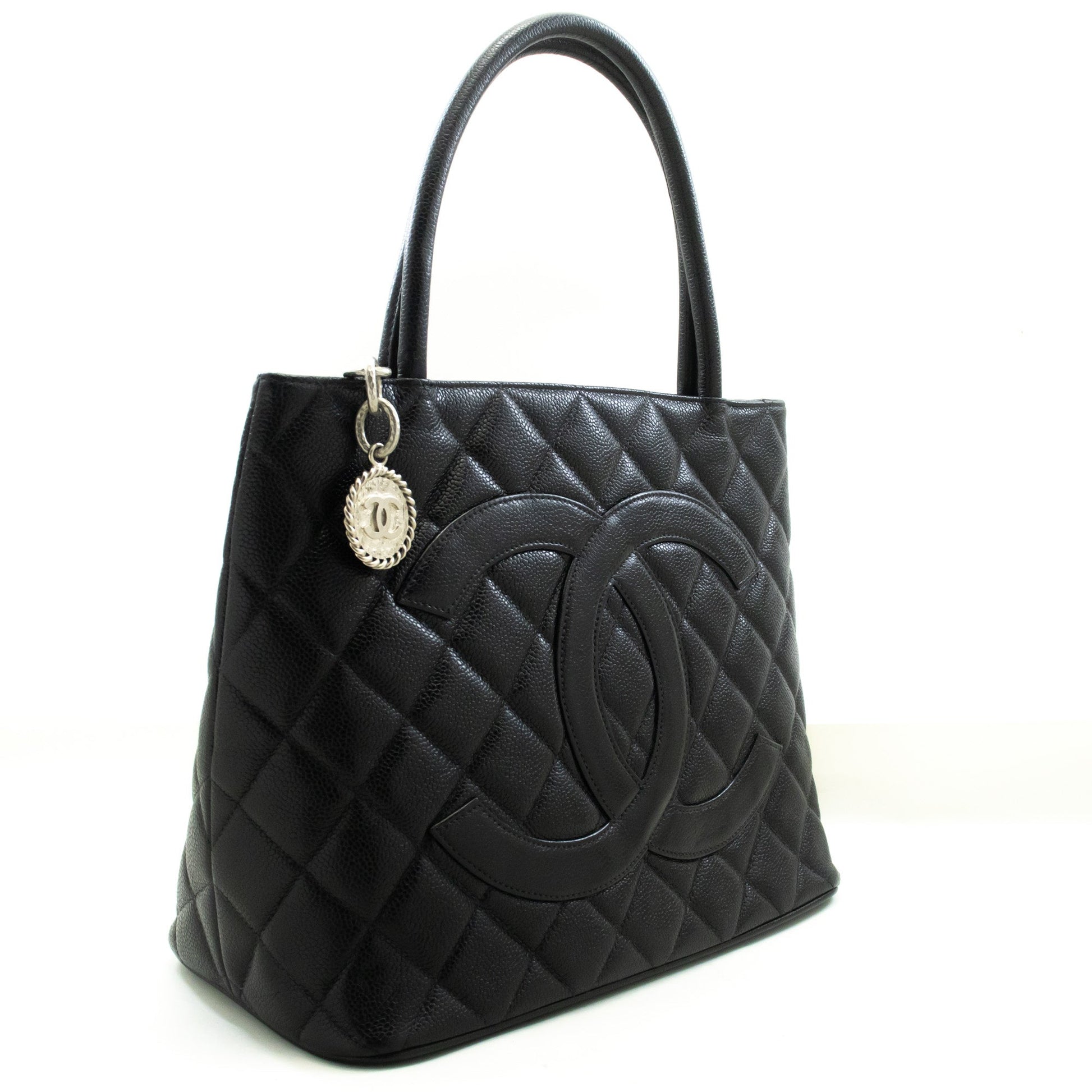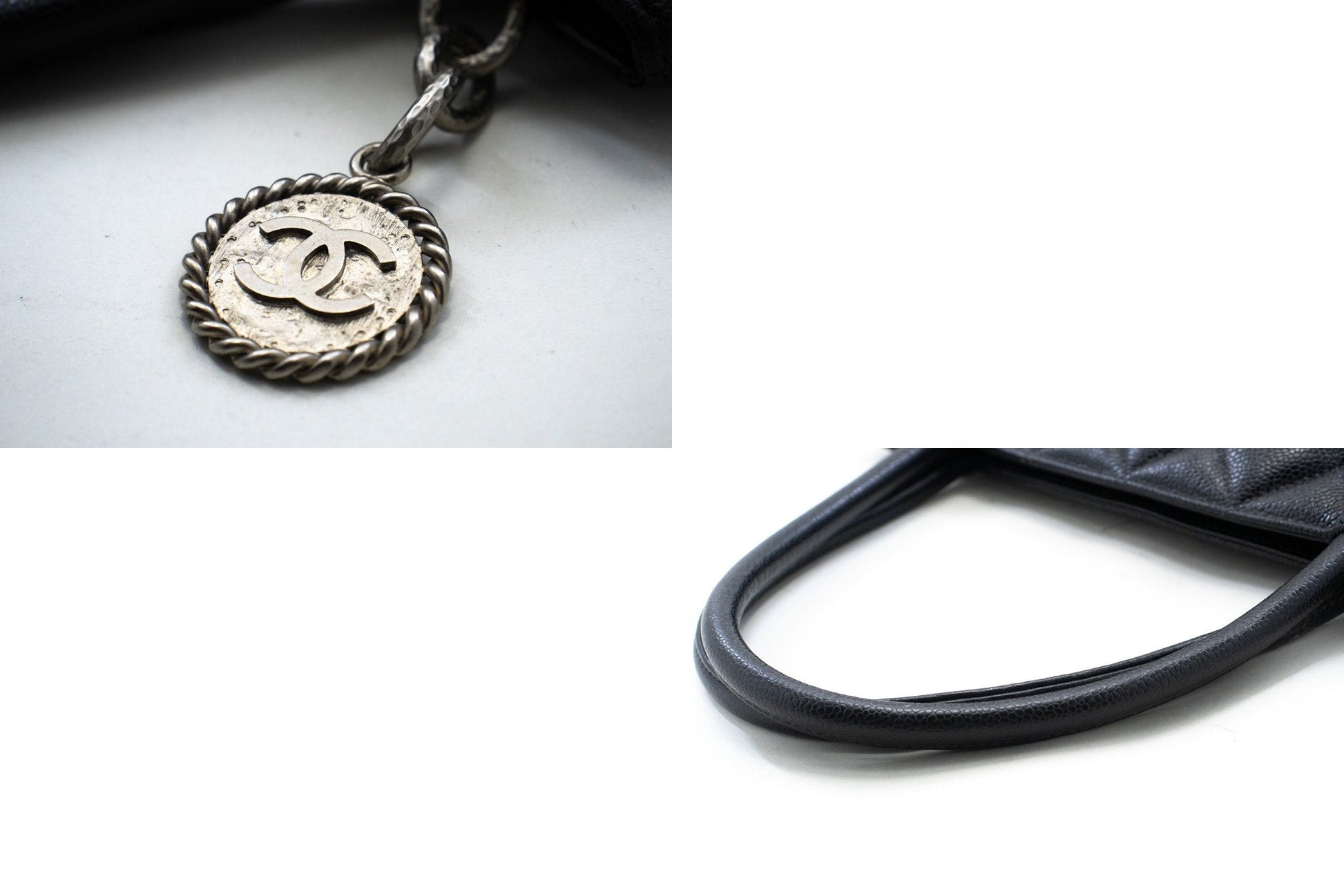 An CHANEL Silver Medallion Caviar Shoulder Bag Shopping Tote Black Silver.