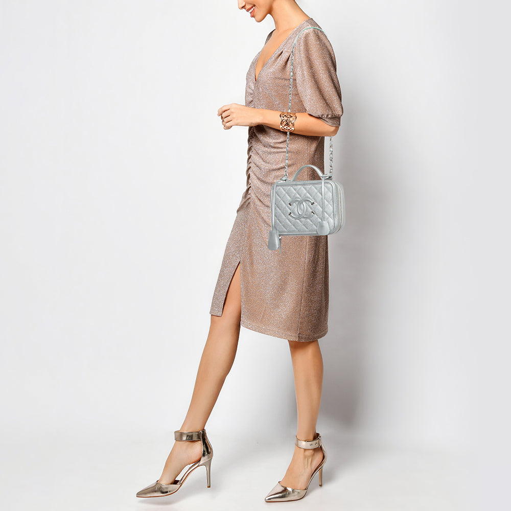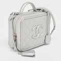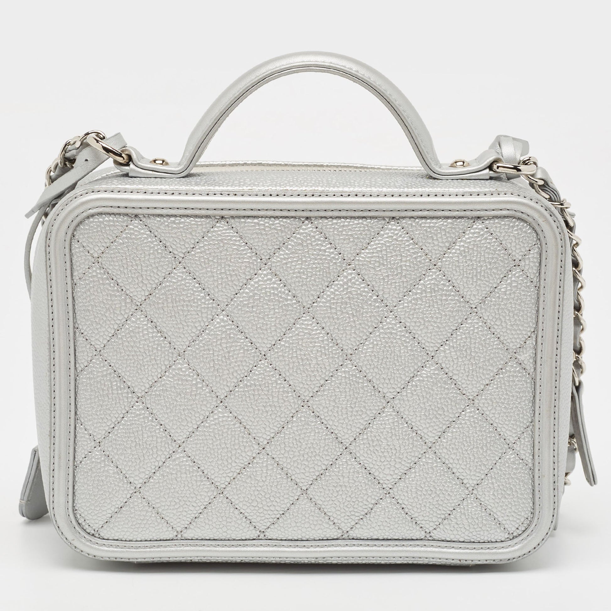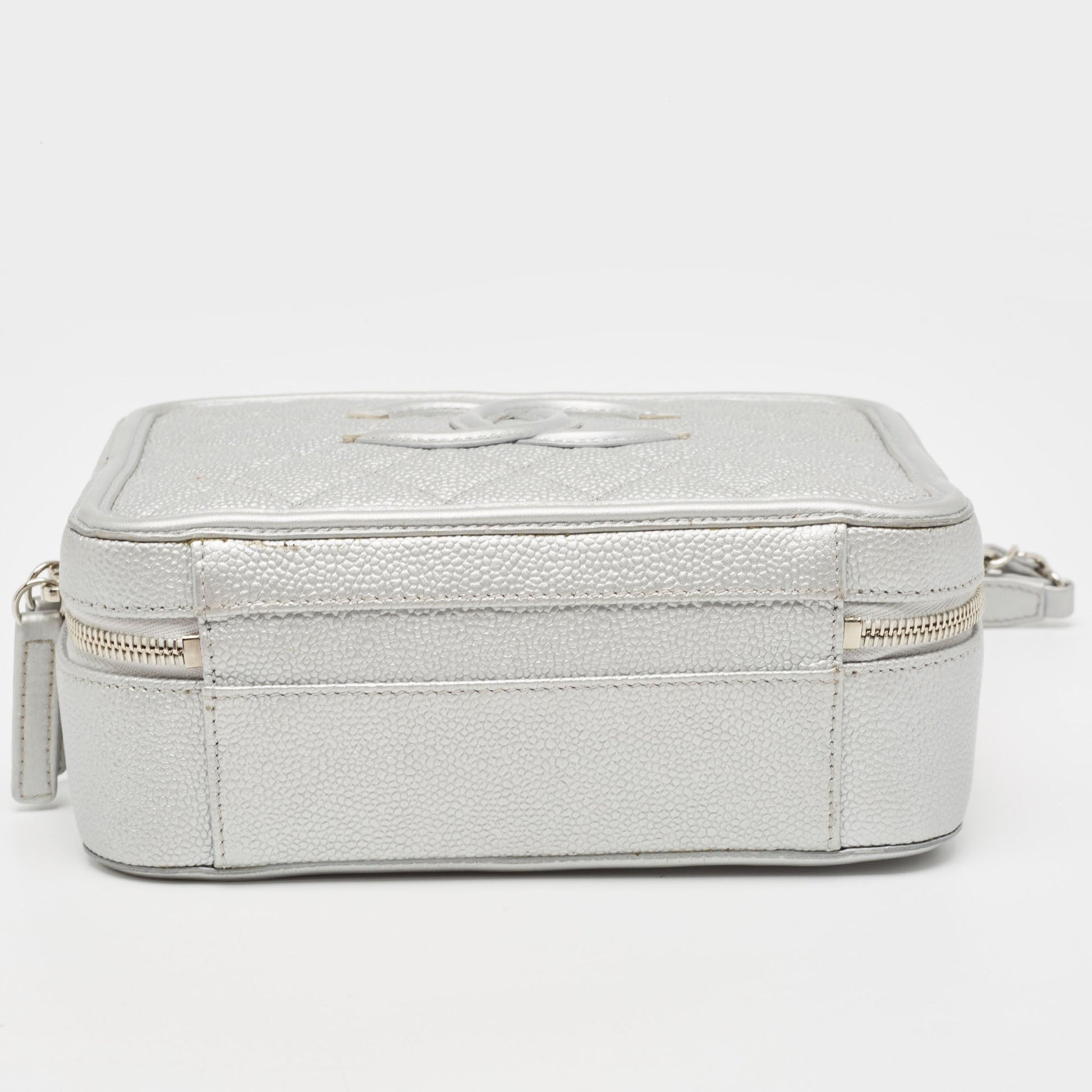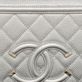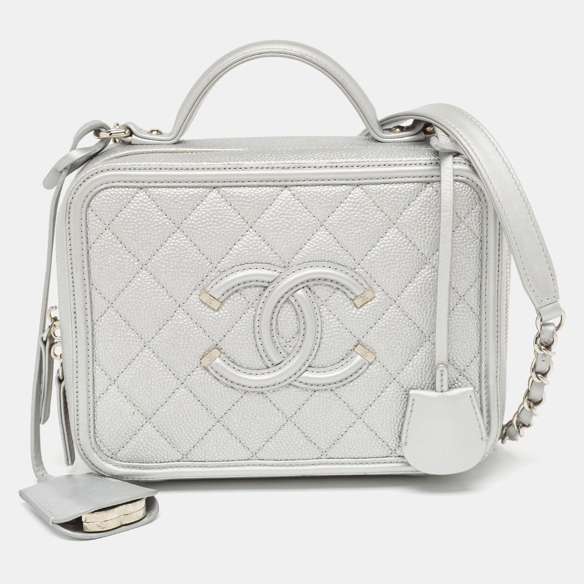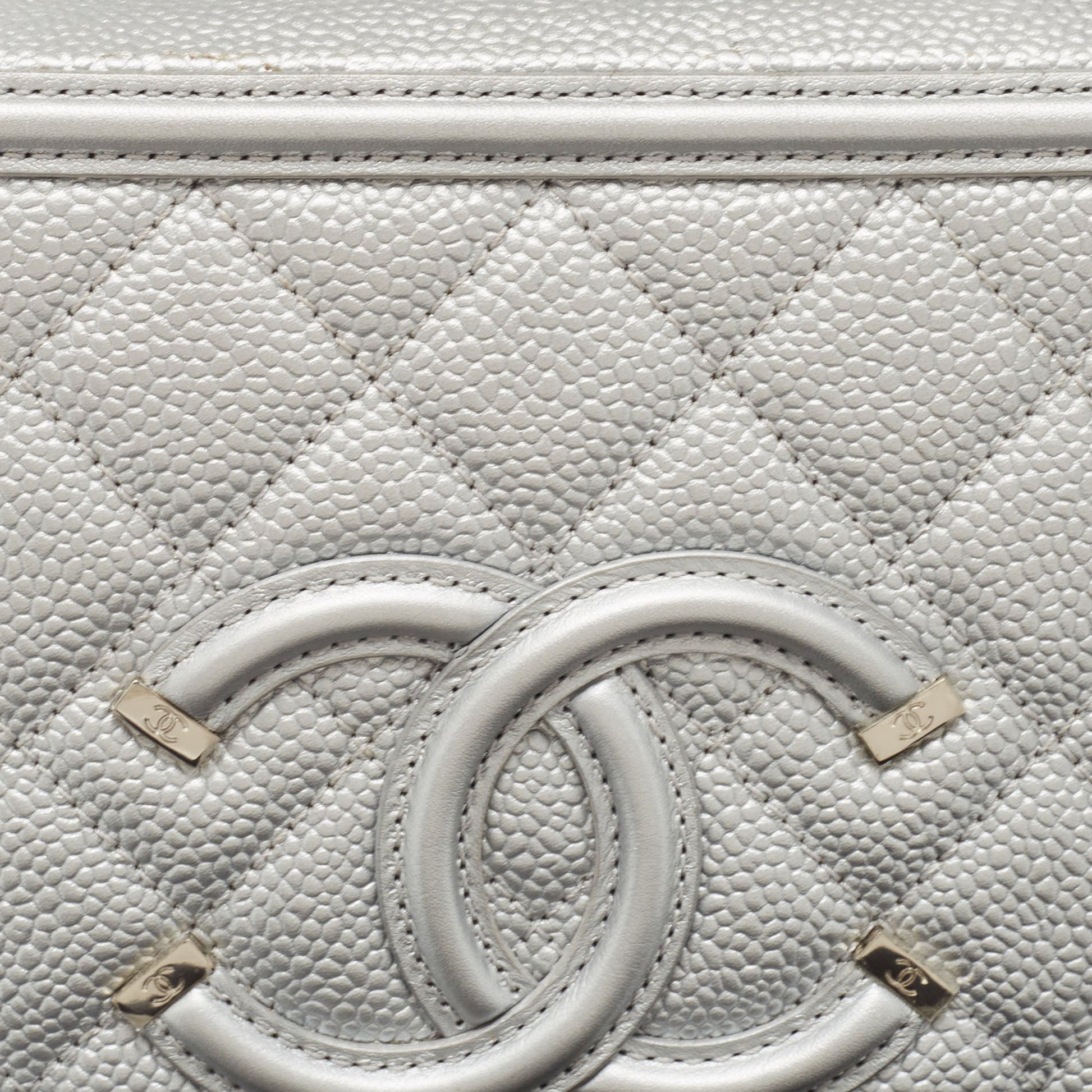 CHANEL Silver Quilted Caviar Leather Medium CC Filigree Vanity Case Bag
