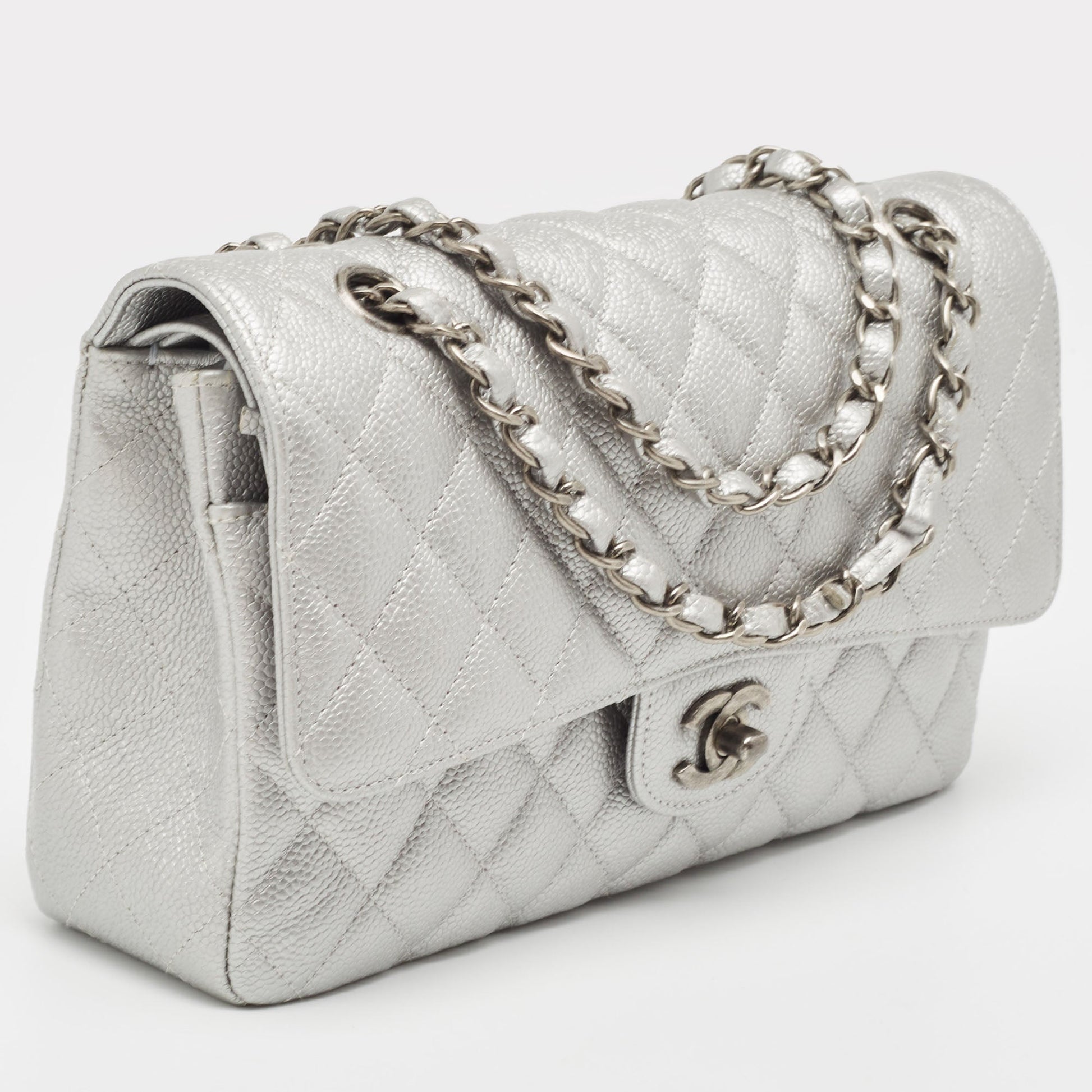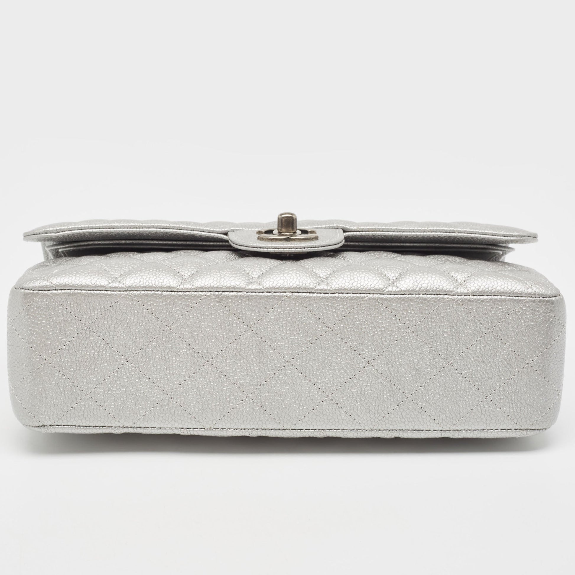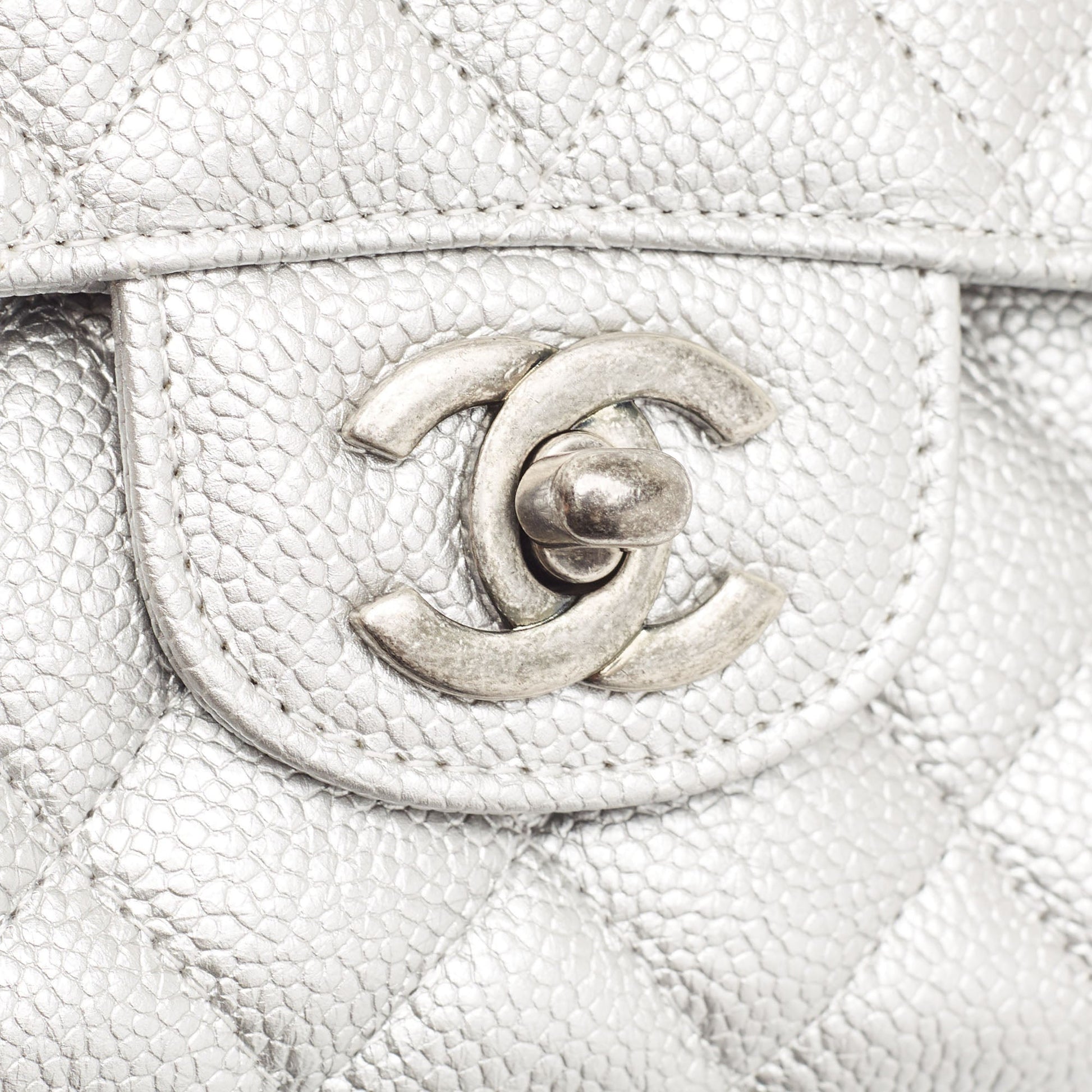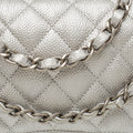 CHANEL Silver Quilted Caviar Leather Medium Classic Double Flap Bag